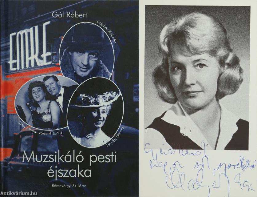 Mednyánszky Ági által dedikált fényképmelléklettel.Első kiadás. Muzsikáló pesti éjszaka. Dokumentumregény. Írta: Gál Róbert. Fekete-fehér, szöveg közti fényképekkel illusztrált, tartalomjegyzékkel ellátott kötet. Nyomtatta a Gyomai Kner Nyomda Zrt. Kiadói fűzött kemény papírkötésben lévő példány feliratos, színes, fotóillusztrált címfedéllel és hátlappal, feliratos könyvgerinccel, tiszta belívekkel, hiánytalan állapotban.