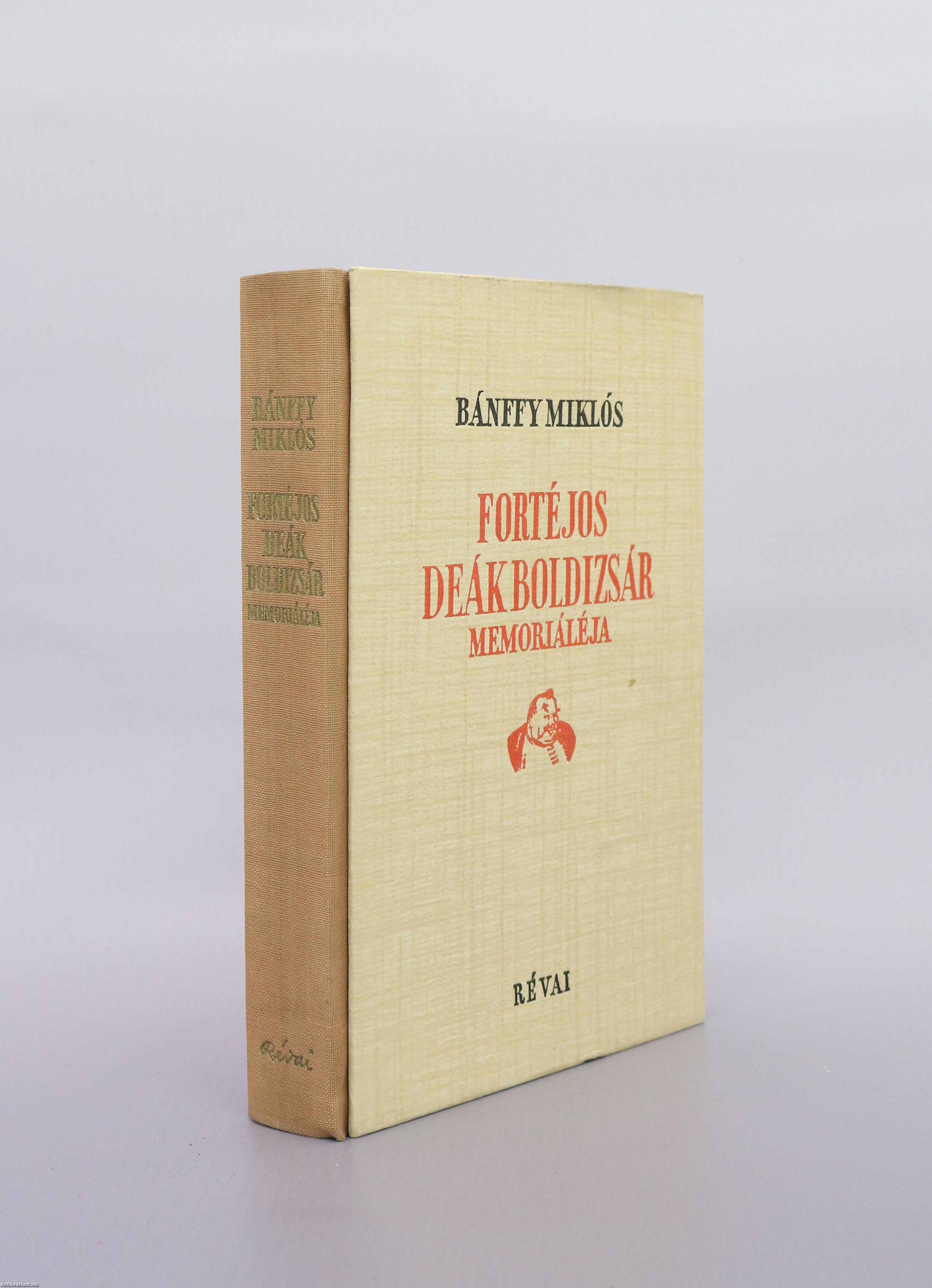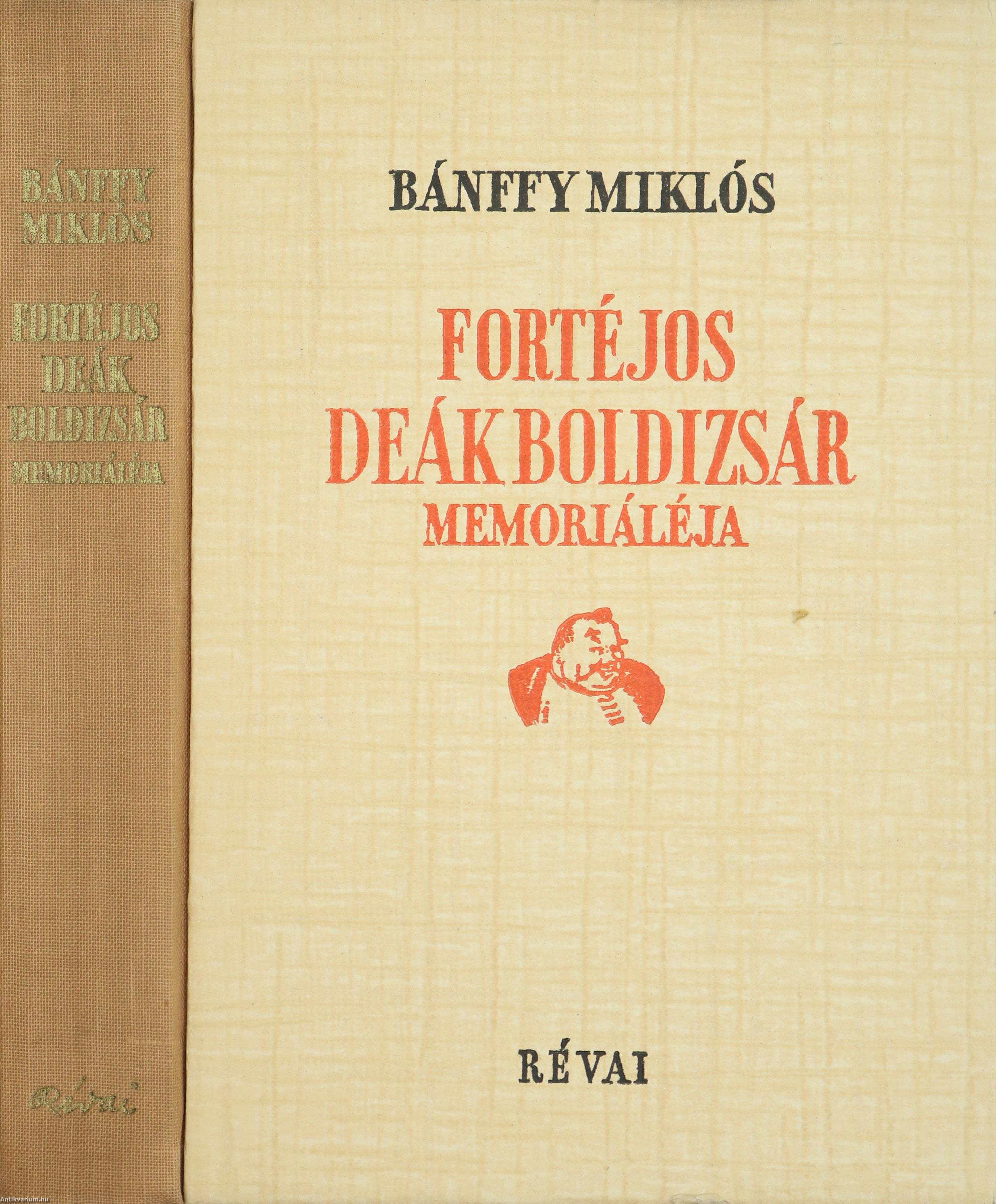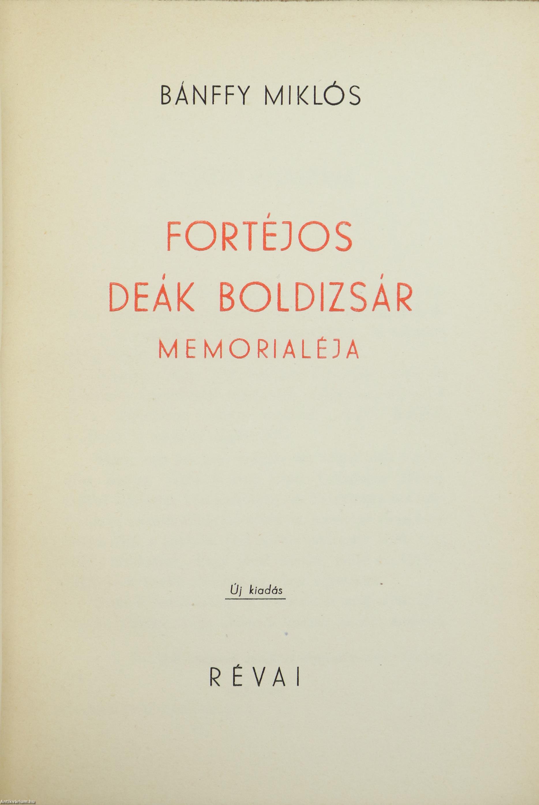 A Bánffy Miklós munkái c. sorozatban megjelent kötet (számjelzés nélkül). Fortéjos Deák Boldizsár memorialéja. Írta: Bánffy Miklós. Új kiadás. Bánffy Miklós fekete-fehér, szöveg közti rajzaival és iniciálékkal illusztrált, tartalomjegyzékkel ellátott kötet. Nyomtatta a Révai Nyomda, Budapesten. Kiadói félvászon kötésben lévő példány két színnel feliratozott címfedéllel, aranyozott feliratos könyvgerinccel, színezett felső lapélekkel, színes kiadói előzéklapokkal, tiszta belívekkel, hiánytalan állapotban, két színnel feliratozott, illusztrált, fülszöveges kiadói borítófedélben.