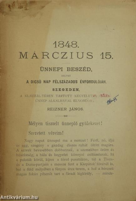 1848. márczius 15. - Ünnepi beszéd, melyet a dicső nap félszázados évfordulóján, Szegeden, a Klauzál-téren tartott kegyeletes emlékünnep alkalmával elmondott Reizner János.