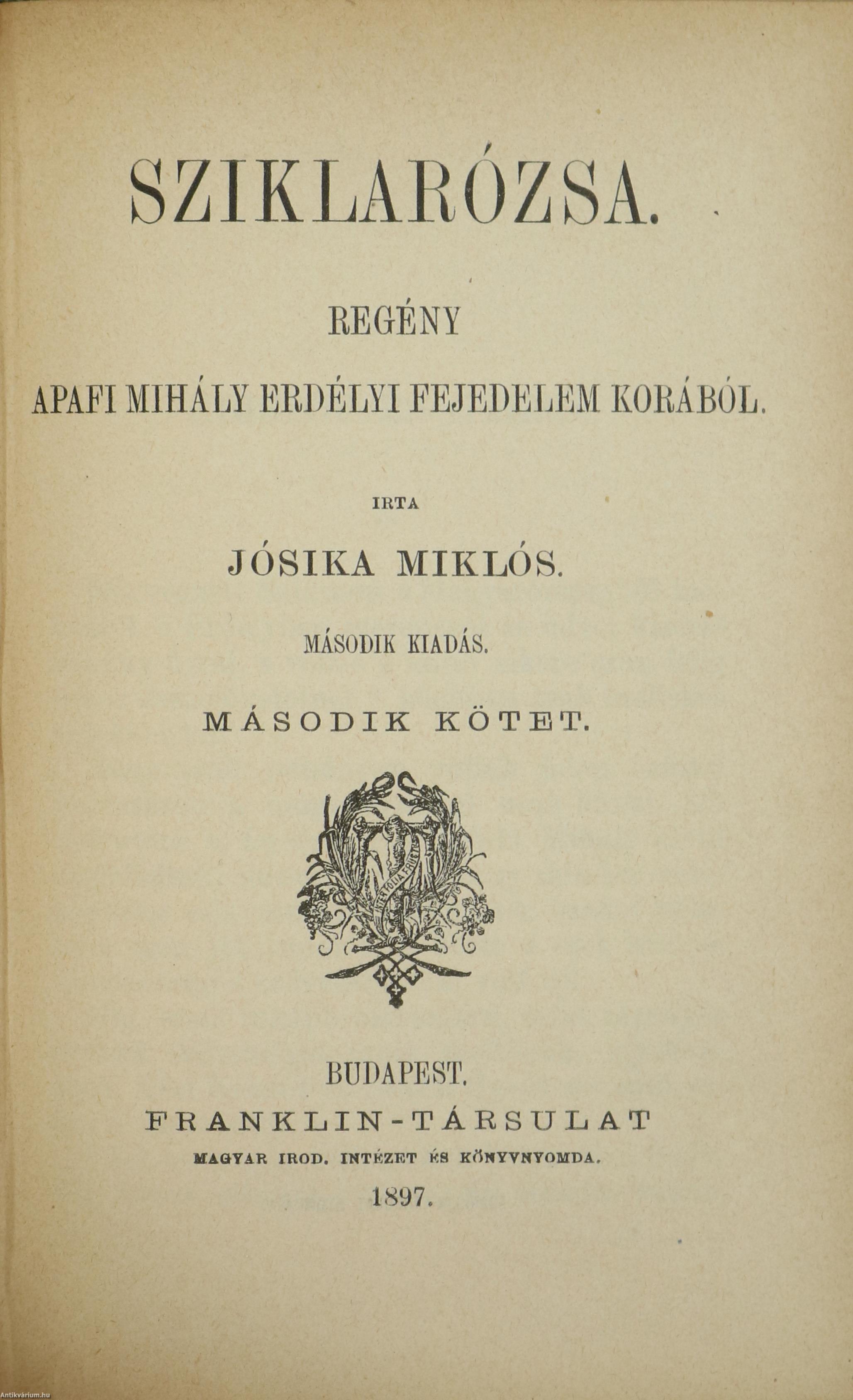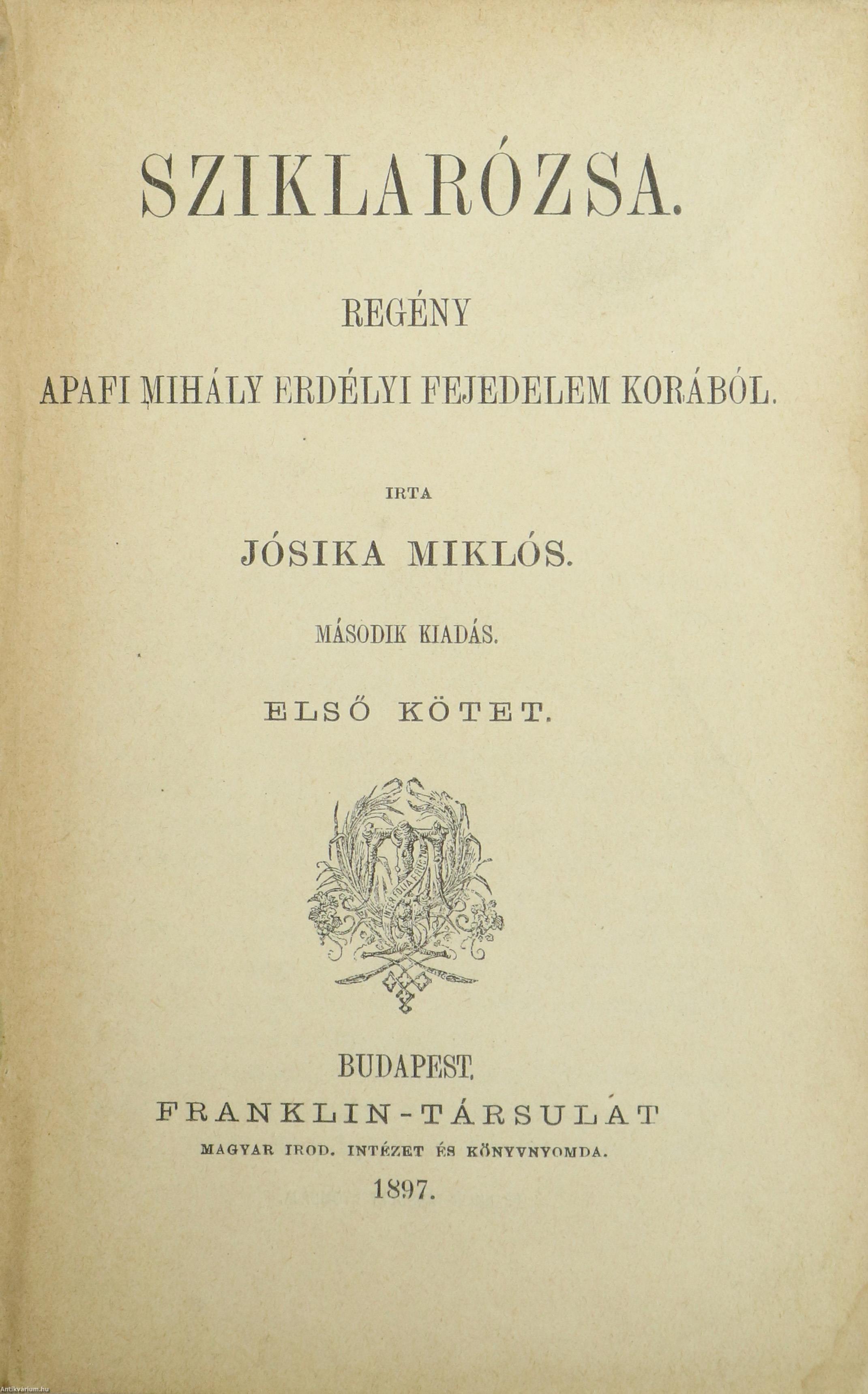 Sziklarózsa I-II. Regény Apafi Mihály erdélyi fejedelem korából. (két kötet egy könyvben) Írta: Jósika Miklós. Második kiadás. Mindkét kötet végén tartalomjegyzékkel. A könyvet a Franklin-Társulat Nyomdája nyomtatta. A kötés Gottermayer Nándor budapesti műhelyében készült. Kiadói egészvászon díszkötésben lévő példány feliratos, aranyozással díszített, színes, gazdagon illusztrált címfedéllel, aranyozott feliratos könyvgerinccel, vaknyomással díszített hátlapon a kötészet feltüntetésével, hiányos előzéklapokkal, mintázott lapélekkel, tiszta belívekkel.