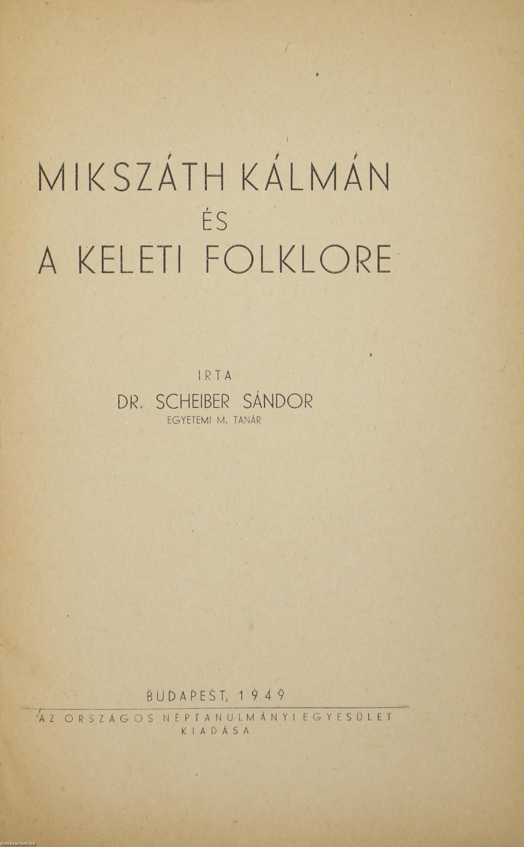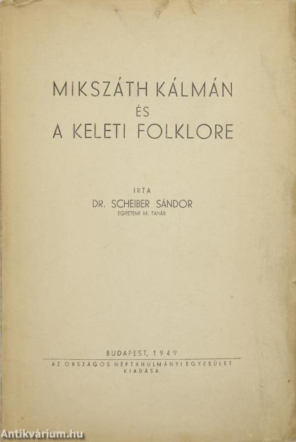 Első kiadás. Mikszáth Kálmán és a keleti folklore. Írta: Dr. Scheiber Sándor egyetemi m. tanár. A könyv anyagát jórészt a Rubinyi Mózes által kiadott Hátrahagyott Iratok szolgáltatták. Egy fekete-fehér képtáblával illusztrált, valamint előszóval és tartalomjegyzékkel kiegészített kötet. Nyomtatta Kertész József Könyvnyomdája, Karcagon. Kiadói varrott papírkötésben lévő példány feliratozott címfedéllel, feliratozatlan könyvgerinccel, hátlapon a nyomda feltüntetésével, hiánytalan állapotban. A szerző, Scheiber Sándor (Budapest, 1913. július 9. – Budapest, 1985. március 3.) nyelvész, irodalomtörténész, a nyelvtudományok doktora, főrabbi. 1941-től Dunaföldváron volt főrabbi, majd részt vett a pesti Országos Rabbiképző Intézet újjáépítésében, 1950-től pedig az intézmény igazgatói tisztségét is betöltötte. Elsősorban zsidó témájú könyveket adott ki vagy publikált újra, de Arany- és Mikszáth-kutatásai is jelentősek. 1983-ban életművéért megkapta a nyelvtudományok doktora címet.