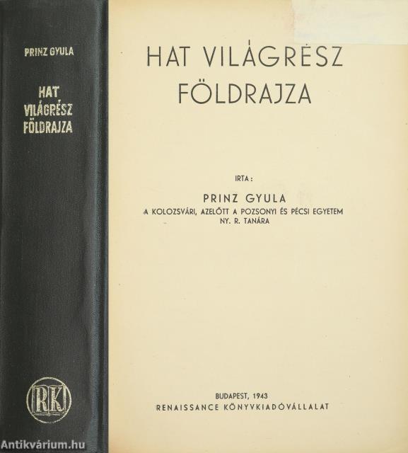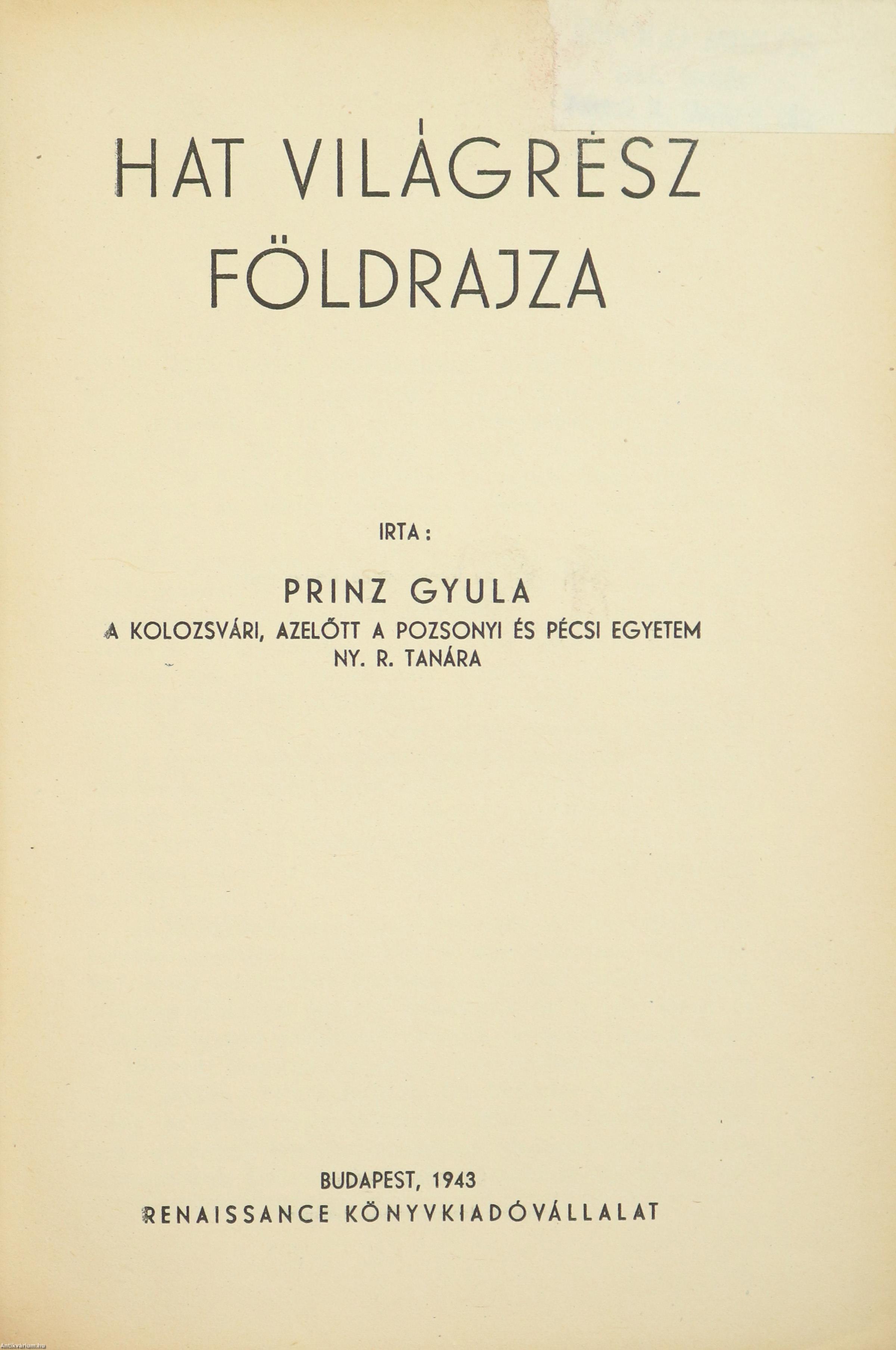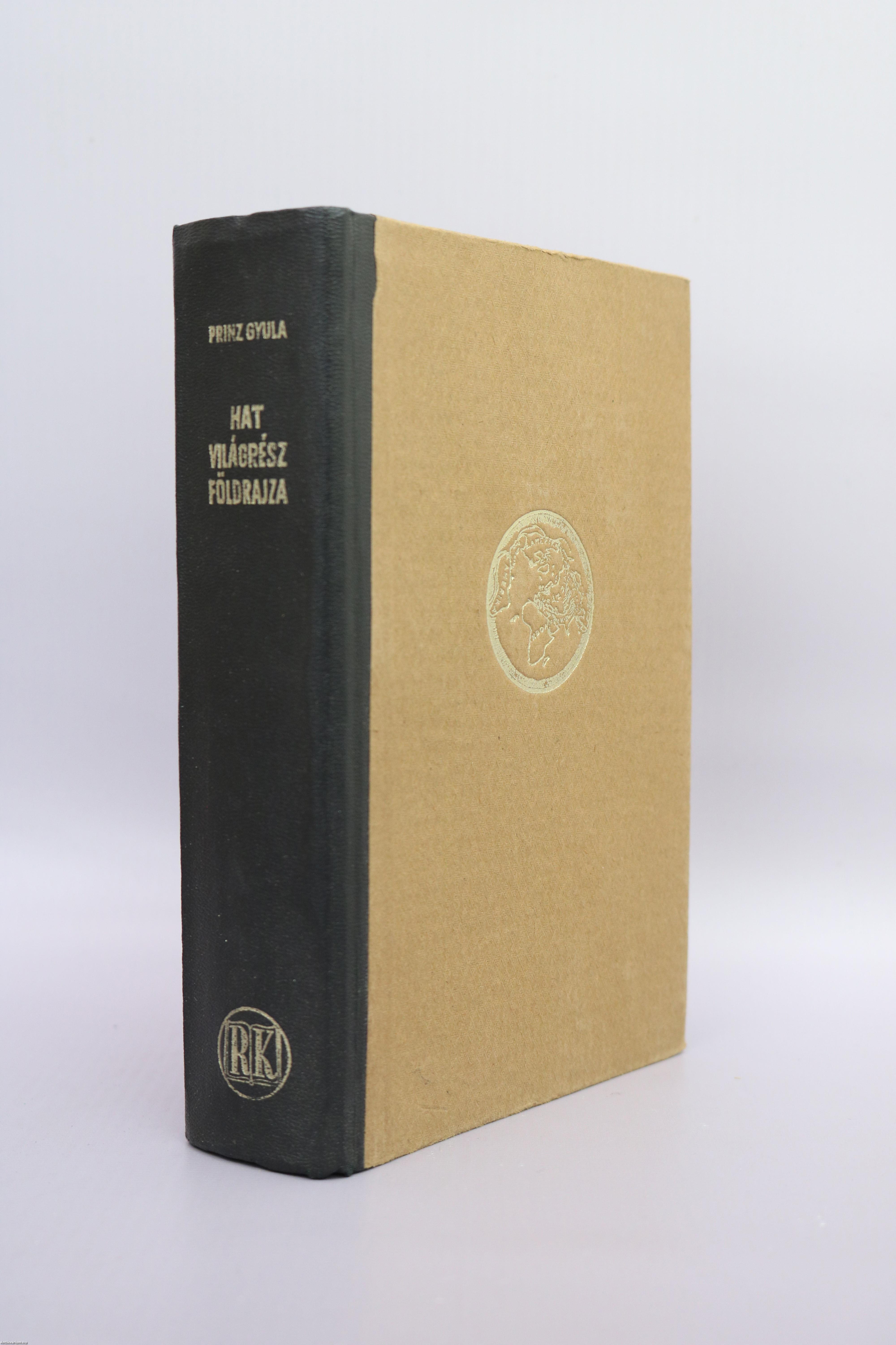 Első kiadás. Hat világrész földrajza. Írta: Prinz Gyula. 38 számozott, fekete-fehér, szöveg közti ábrával és kötetvégi tartalomjegyzékkel. Nyomatott Andrási Józsefnél, Budapesten. A címlapon egy ragasztott címke látható. Kiadói félvászon kötésben lévő példány aranyozott emblémával illusztrált címfedéllel, aranyozott feliratos könyvgerinccel, tiszta belívekkel, hiánytalan, jó állapotban. A kötet szerzője, Prinz Gyula (Rábamolnári, 1882. január 11. – Budapest, 1973. december 31.) geológus, geográfus, néprajzkutató, a pozsonyi, a pécsi és a budapesti egyetemek tanára, a kolozsvári, majd a szegedi egyetem intézet- és tanszékvezető professzora. Neve Almásy György 1906-os közép-ázsiai expedíciója kapcsán vált híressé, amelynek résztvevőjeként feltérképezte a Tien-san hegység vonulatait, és a magashegységek geomorfológiájának kialakulásával kapcsolatban több vitatott kérdésre is választ talált. Az 1910-es évektől elismert egyetemi oktató, emellett számos európai tanulmányúton is részt vett. 1920-tól a Magyar Földrajzi Társaság alelnöke, majd 1923-tól főtitkára volt, utóbb (1952-ben) a szervezet örökös tiszteletbeli elnökévé választották. A XX. századi magyar földrajztudomány kiemelkedő személyisége volt.