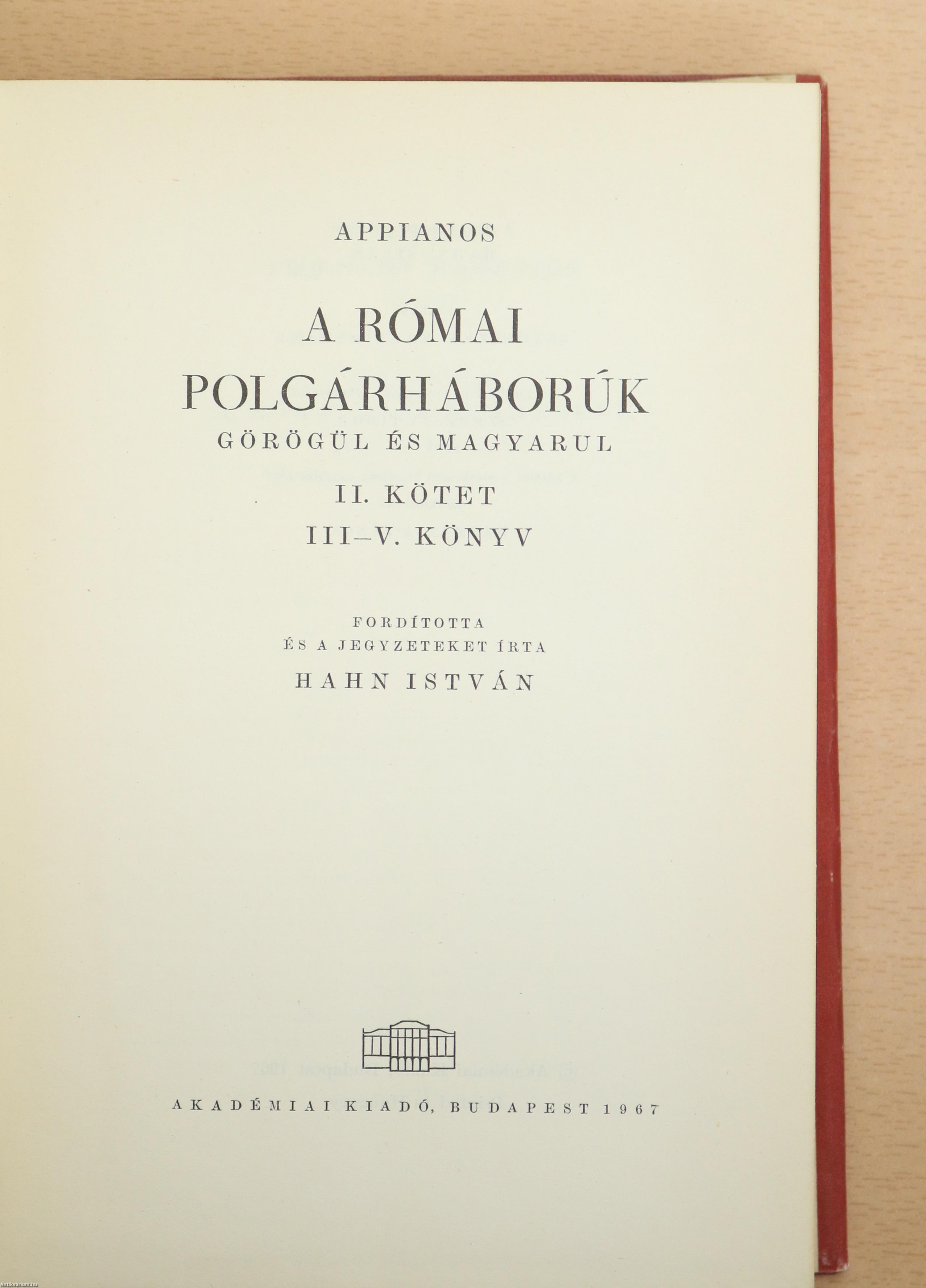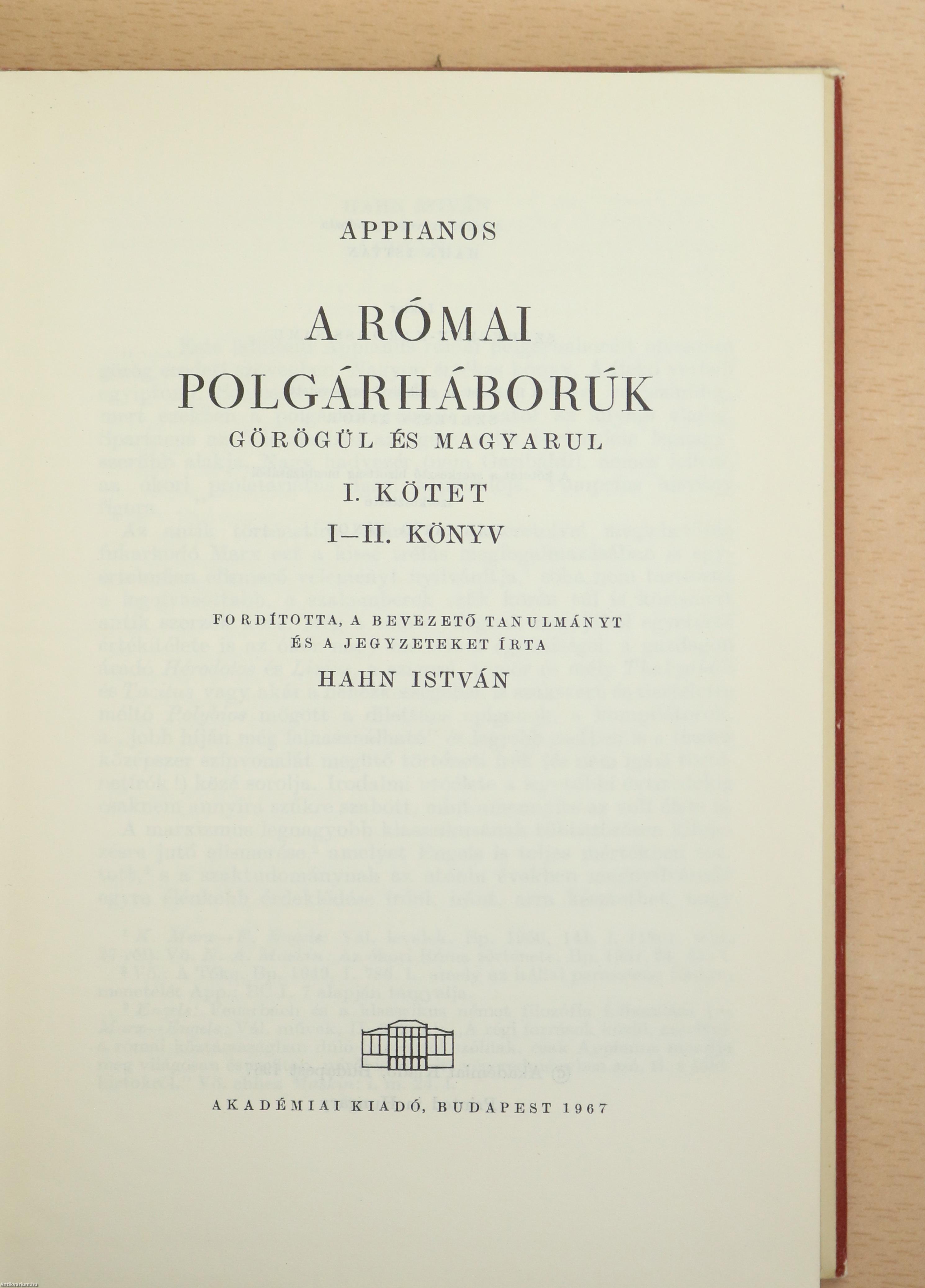 Az időszámításunk II. századában Rómában élt, alexandriai születésű történetíró, Appianos, Római történetének legfontosabb részét, a polgárháborúk korának összefüggő ismertetését foglalja magába a két kötet.