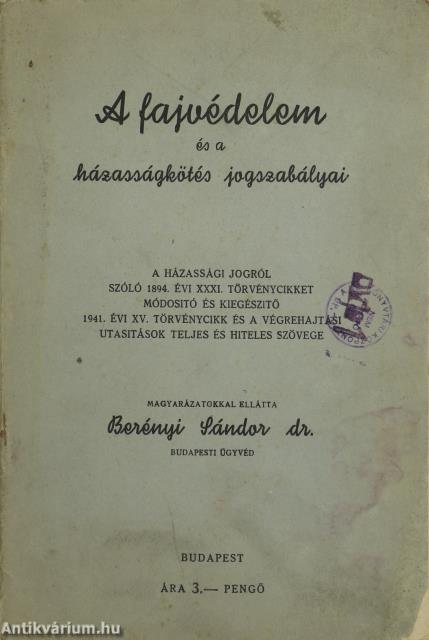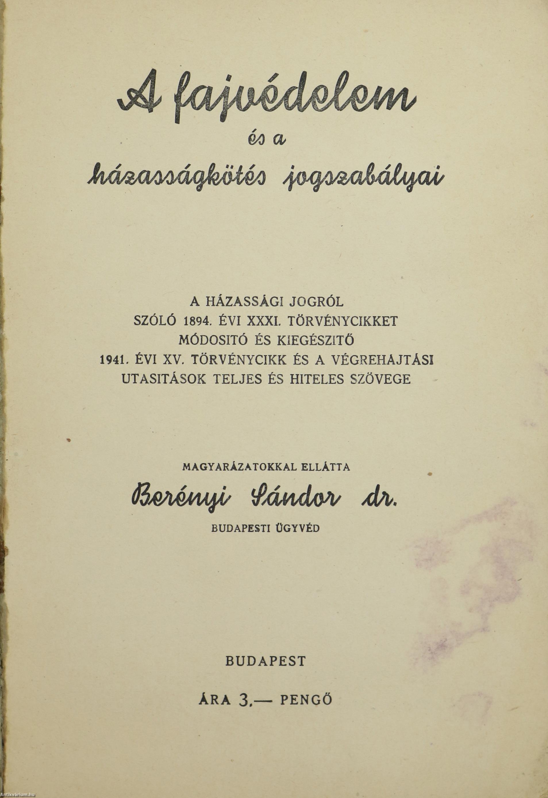 A fajvédelem és a házasságkötés jogszabályai. A házassági jogról szóló 1894. évi XXXI. törvénycikket módosító és kiegészítő 1941. évi XV. törvénycikk és a végrehajtási utasitások teljes és hiteles szövege. Magyarázatokkal ellátta: Berényi Sándor dr. budapesti ügyvéd.