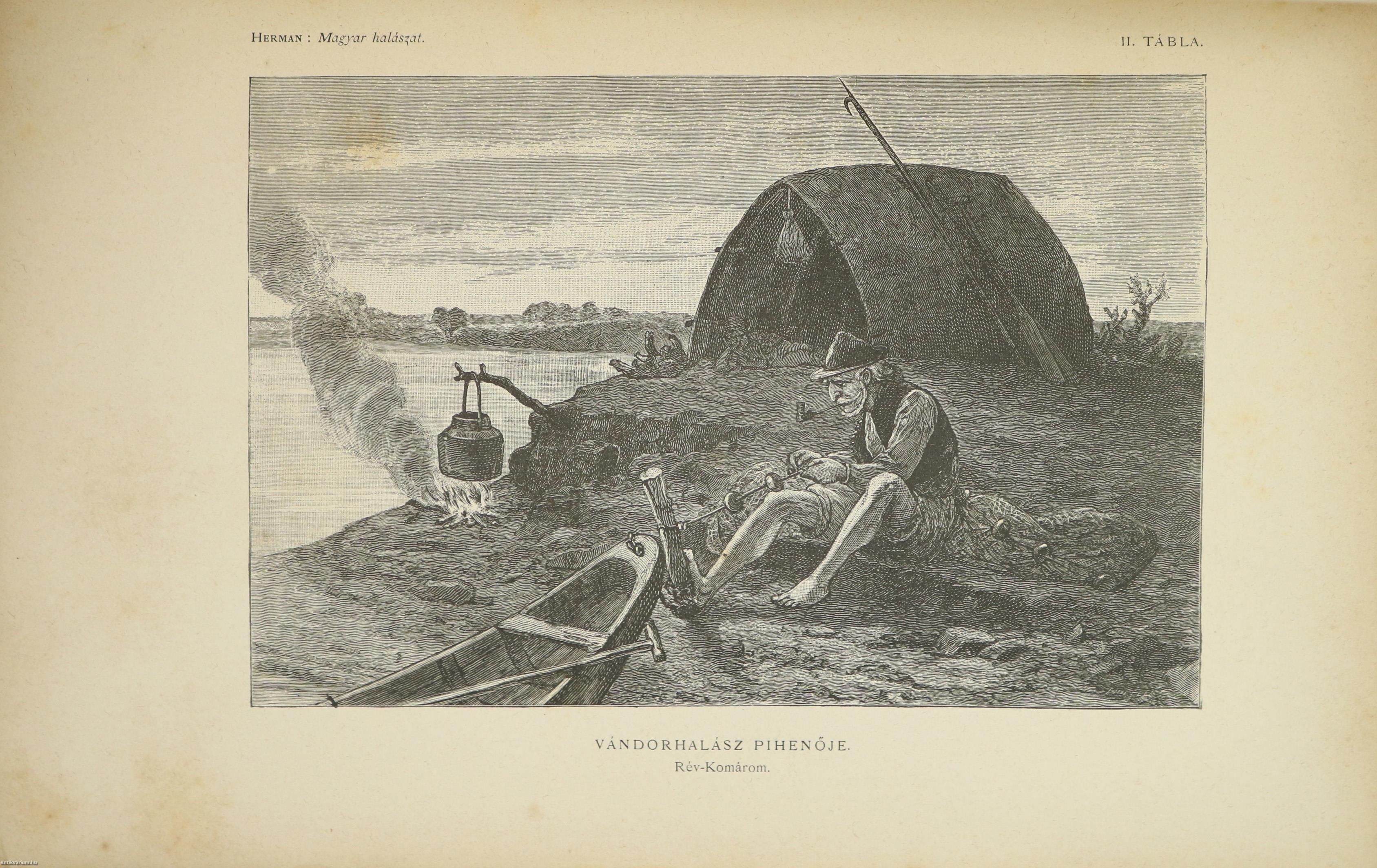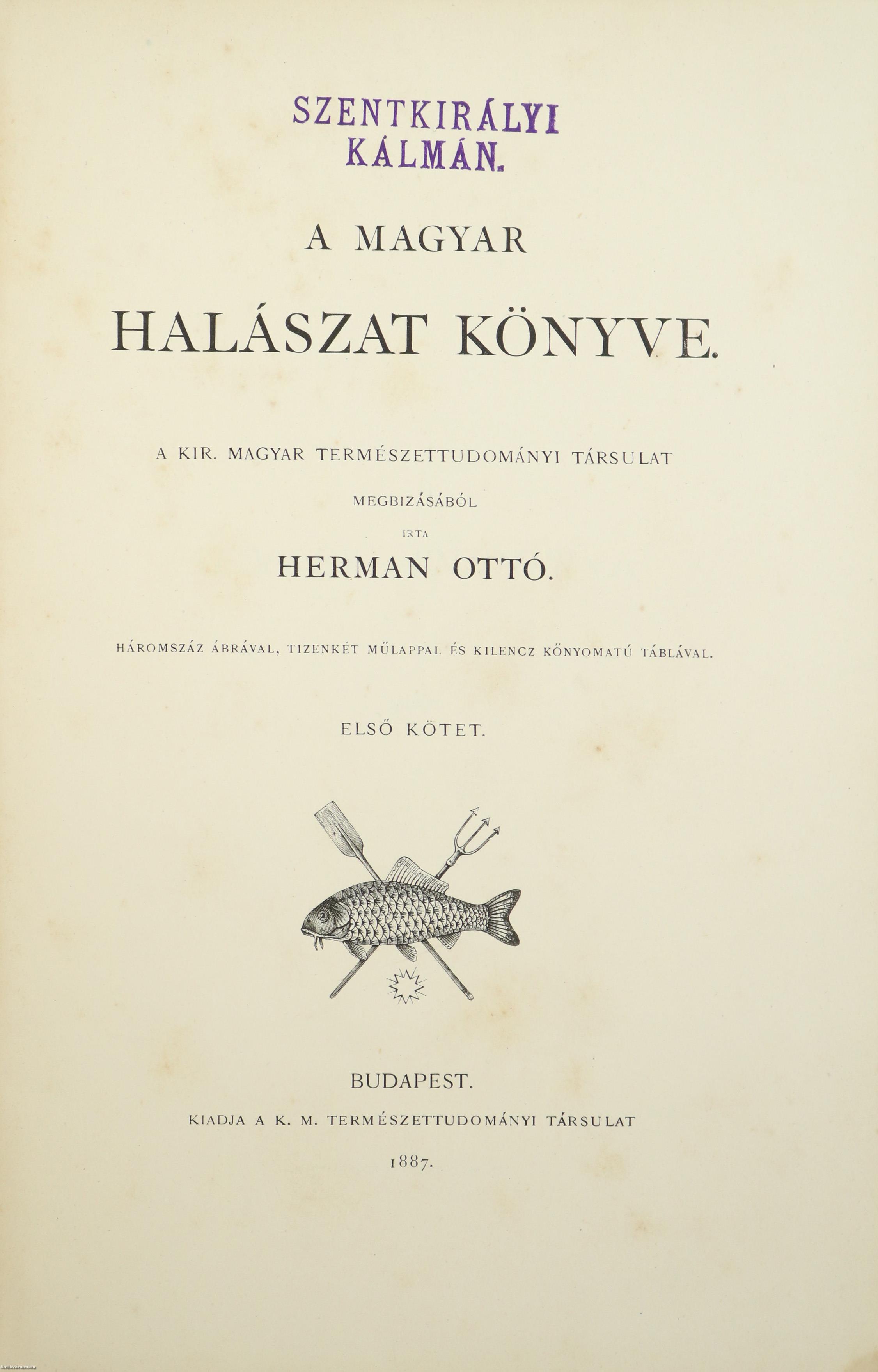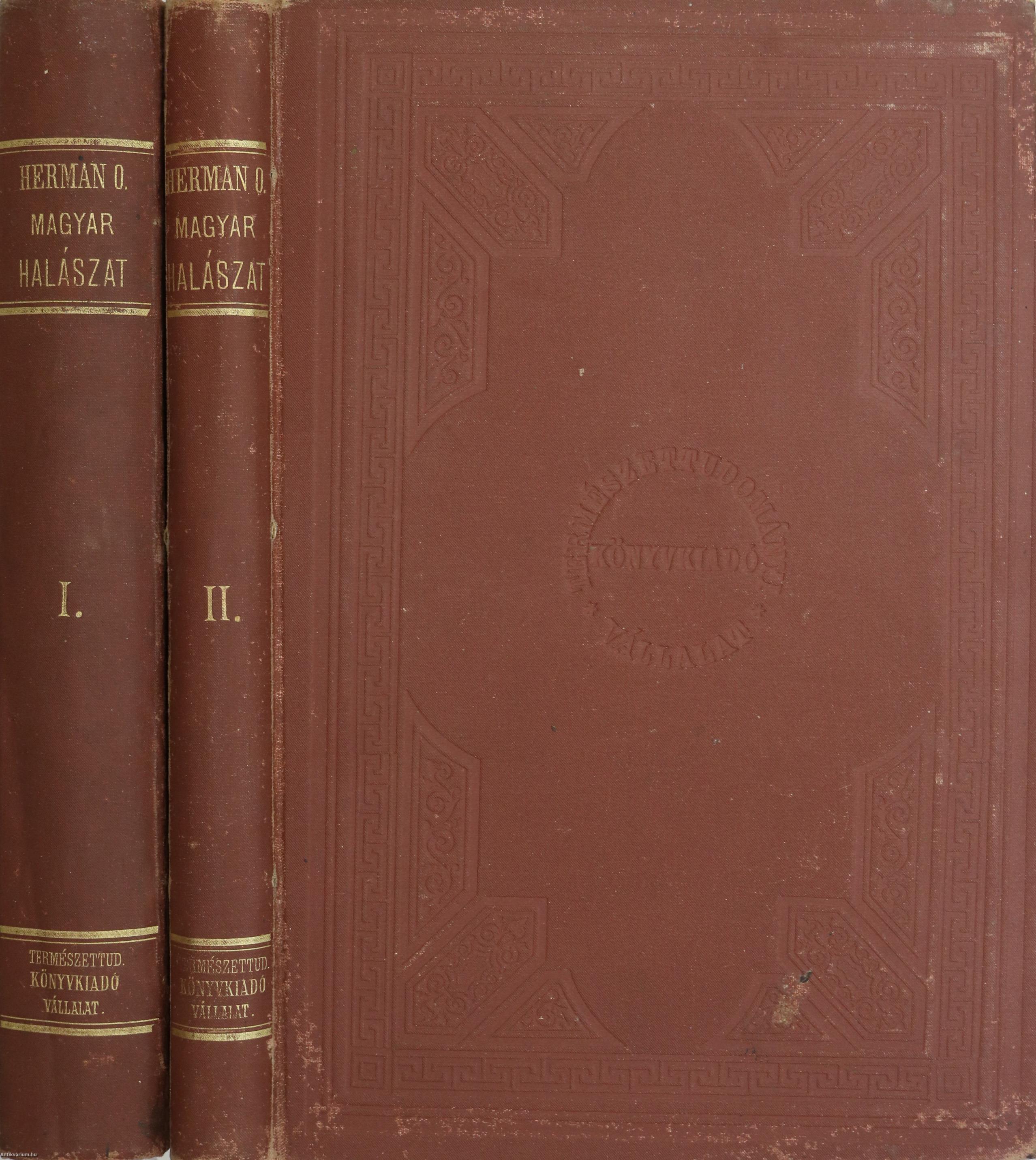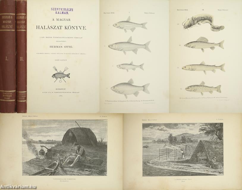 A Természettudományi Könyvkiadó-Vállalat könyvsorozatának XXVII. és XXVIII., a könyvkiadó-vállalat aláirói számára az V-ik (1884-1886. évi) cziklus harmadik és negyedik kötetei. Első kiadás. A magyar halászat könyve I-II. (Egységes külön kötetekben.) A Kir. Magyar Természettudományi Társulat megbízásából írta: Herman Ottó. Összesen háromszáz szöveg közti, fekete-fehér, feliratozott ábrával, továbbá az első kötetben 12 fekete-fehér, számozott műlappal, a második kötetben 9 számozott, kőnyomatú táblával illusztrált, a magyar népies halászat mesterszótárával, a Természettudományi Társulat kiadványainak listájával, betűrendes tárgymutatóval, valamint irodalom- és tartalomjegyzékkel kiegészített kiadás. Az első kötet címlapján tulajdonosi bélyegzés, a második kötetén tollal írt tulajdonosi bejegyzés látható. A köteteket a Franklin-Társulat Könyvsajtója nyomtatta, Budapesten. Kiadói egészvászon kötésben lévő kötetek vaknyomással díszített címfedéllel és hátlappal, aranyozott feliratos könyvgerinccel, hiánytalan állapotban. A kötet szerzője, Herman Ottó (Breznóbánya, 1835. június 26. – Budapest, 1914. december 27.) természetkutató, zoológus, néprajzkutató, régész, politikus. Sokoldalú tudományos tevékenysége nyomán az utolsó magyar polihisztornak és a madarak atyjának is nevezték, ezernél is több tudományos publikáció fűződik a nevéhez. A magyar őskőkorszak-kutatás és a hazai tudományos barlangkutatás egyik elindítója volt. Termékeny természetrajzi írói munkássága mellett mint tudományszervező is jeleskedett. A Természettudományi Füzetek és az Aquila c. madártani folyóirat szerkesztője, a Magyar Ornitológiai Központ alapító-igazgatója, a Magyar Néprajzi Társaság alapítótagja és elnöke, a tudományos ismeretterjesztés műfajának egyik magyarországi megteremtője.
