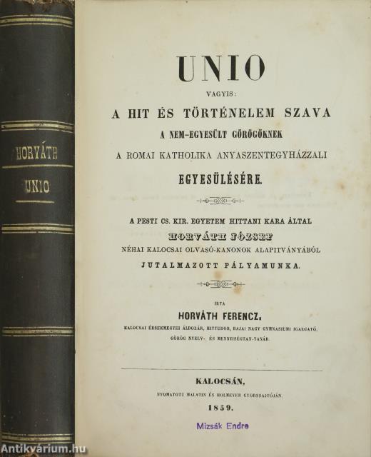 Első kiadás. Unio vagyis: a hit és történelem szava a nem-egyesült görögöknek a romai katholika anyaszentegyházzali egyesülésére. Írta: Horváth Ferencz kalocsai érsekmegyei áldozár, hittudor, bajai nagy gymasiumi igazgató, görög nyelv- és mennyiségtan-tanár.