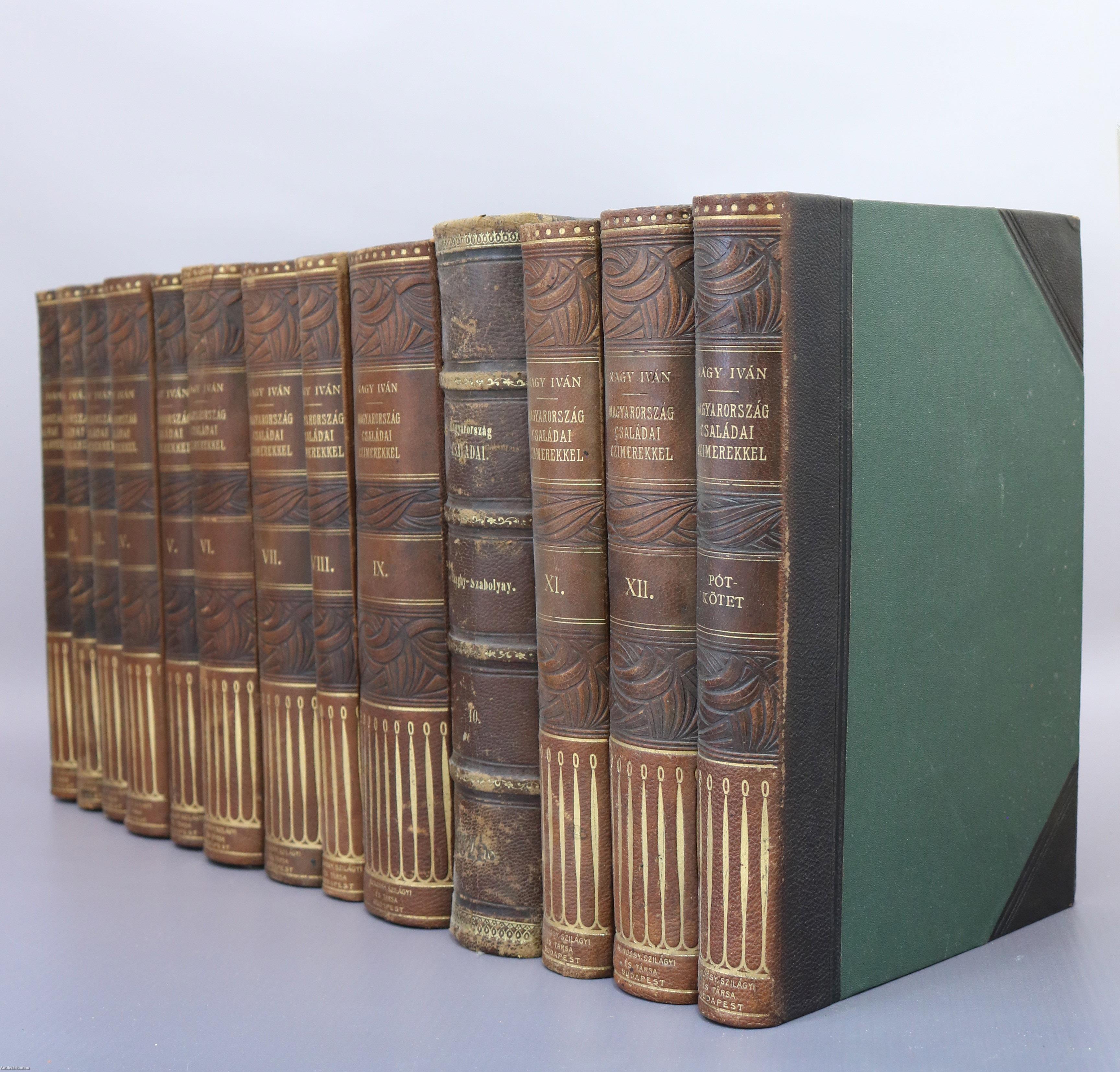 Első kiadás. Magyarország családai czimerekkel és nemzékrendi táblákkal I-XIII. (különálló egységes kötetekben, kivétel a X. kötet). Írta: Nagy Iván. Kiadja: Friebeisz István.