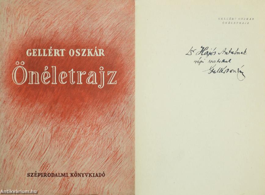 Szerző által dedikált példány. Első kiadás. Önéletrajz. Írta: Gellért Oszkár. A feliratos előlapon a szerző, Gellért Oszkár tollal beírt, névre szóló dedikációja olvasható: "Dr. H. A.-nak régi szeretettel Gellért Oszkár". A szerző munkáinak jegyzékével közzétett kiadás. Nyomtatta a Révai-nyomdája Budapesten. Kiadói fűzött papírkötésben lévő példány feliratozott címfedéllel és könyvgerinccel, hátlapon a nyomda feltüntetésével, hiánytalan állapotban. A kötet szerzője, Gellért Oszkár (Budapest, 1882. szeptember 10. – Budapest, 1967. december 16.) költő, újságíró, szerkesztő. Többek között az Új Idők, a Budapesti Napló, a Magyar Géniusz és a Pesti Hírlap publicistája. 1908-tól a Nyugat munkatársa, később megbecsült főmunkatársa; Móricz Zsigmond kiválása után a prózarovat szerkesztését is átvette és a lap 1941-es megszűnéséig annak egyik megkerülhetetlen alakja volt. Színes és változatos lírájában nagy szerepet kap a szabadság és a demokrácia szeretete, az emberi méltóság kérdése. Prózai munkái közül kiemelkednek a Nyugat munkatársaira emlékező művek, amelyek irodalomtörténeti értékkel bírnak.