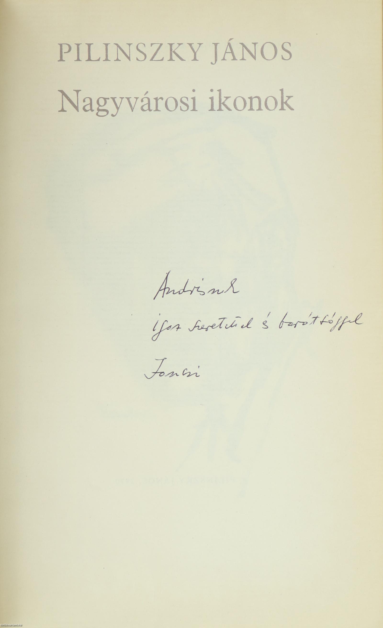 Szerző által dedikált példány. Nagyvárosi ikonok. Összegyűjtött versek. 1940-1970. [Trapéz és korlát. 1940-1946, Harmadnapon. 1946-1958, Nagyvárosi ikonok. 1959-1970] Írta: Pilinszky János. A kötet címlapján a szerző, Pilinszky János névre szóló dedikációja olvasható: "A.-nak igaz szeretettel Jancsi" A költő címkép gyanánt közölt portréját Kondor Béla rajzolta. A kötet a költő két prózai művét is tartalmazza: A "teremtő képzelet" sorsa korunkban c. valamint az Ars Poetica helyett c. művet. A könyvet a Kner nyomda nyomtatta Gyomán. Kiadói fűzött kemény papírkötésben lévő példány aranyozott, feliratos címfedéllel és könyvgerinccel, feliratozatlan hátlappal, néhány oldalon tollal készített jelöléssel, hiánytalan állapotban, feliratos, fülszöveges, kiadói borítófedélben. A kötet szerzője, Pilinszky János (Budapest, 1921. november 27. – Budapest, 1981. május 27.) a huszadik század meghatározó magyar költője. A "Nyugat" irodalmi folyóirat negyedik, az "Újhold" köré csoportosult írónemzedékének a tagja. Az Újhold társszerkesztője (1946-48). Verseit az "Élet", a "Vigília", az "Ezüstkor" és az "Új Ember" is gyakran közölte. Költészetében a hit, a spiritualitás, a humánum, az emberi szenvedés, a megértés és az emberi kapcsolatok nagy jelentőséggel bírnak, és a lírai magasságokban új értelmet, új dimenziót nyernek. A költő keresztény hitelveket felvállaló, egzisztenciális, finom lírája a magyar irodalom kincsei közé tartozik.