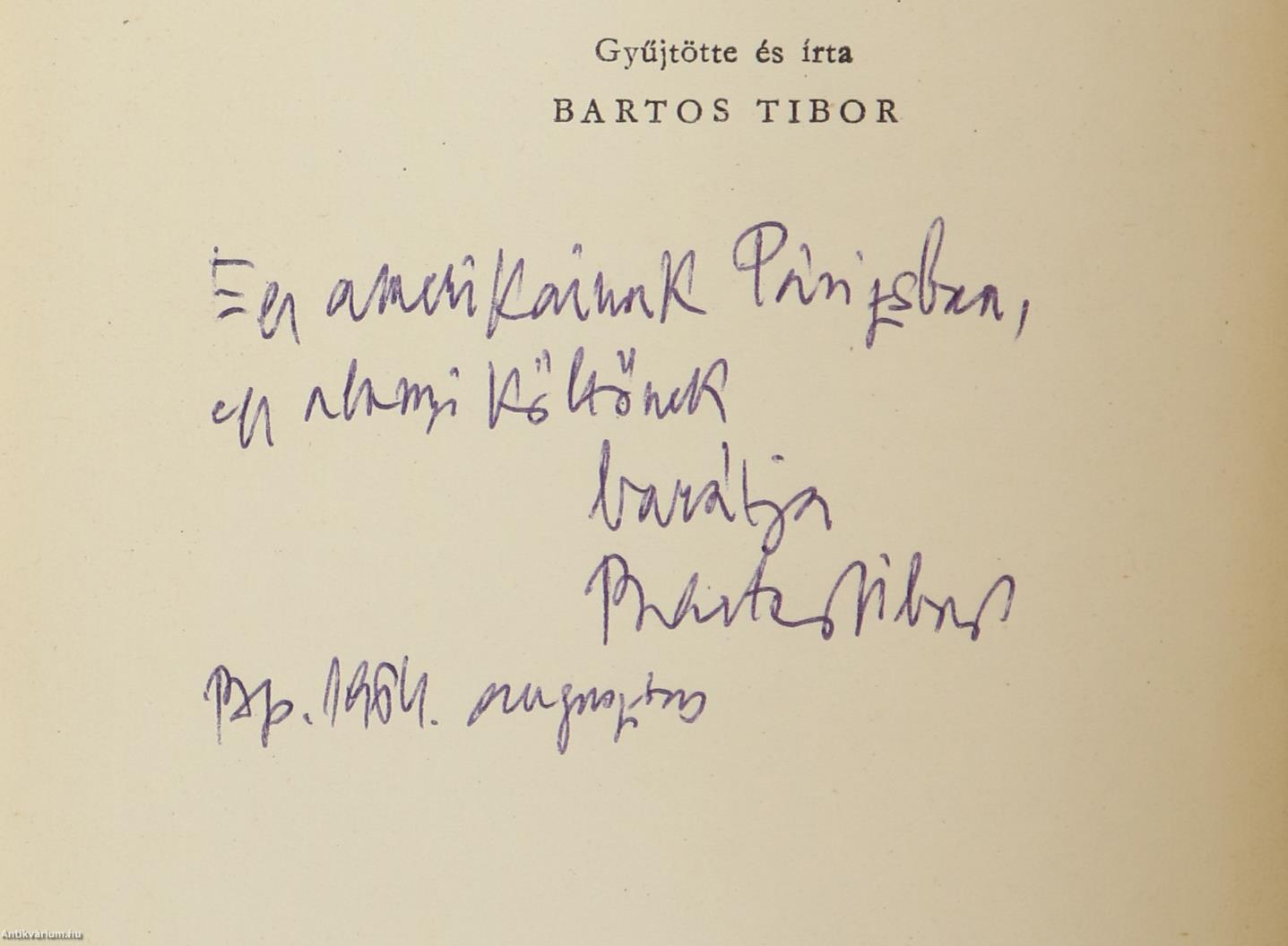 Bartos Tibor által dedikált példány. Sosemvolt Cigányország. Szegkovács cigány történetek. Gyűjtötte és írta: Bartos Tibor. A kötet feliratozott előlapjának hátoldalán Bartos Tibor tollal írt dedikációja olvasható: "Egy amerikainak Párizsban, egy abonyi költőnek barátja Bartos Tibor Budapest, 1964. augusztus." A kötetben szereplő illusztrációk Bartha László munkái. Kiadói félvászon kötésben lévő példány illusztrációval ellátott, feliratozatlan címfedéllel, feliratozott könyvgerinccel, hiánytalan, átlagos állapotban, illusztrációval ellátott, feliratozott, fülszöveges kiadói borítófedélben.