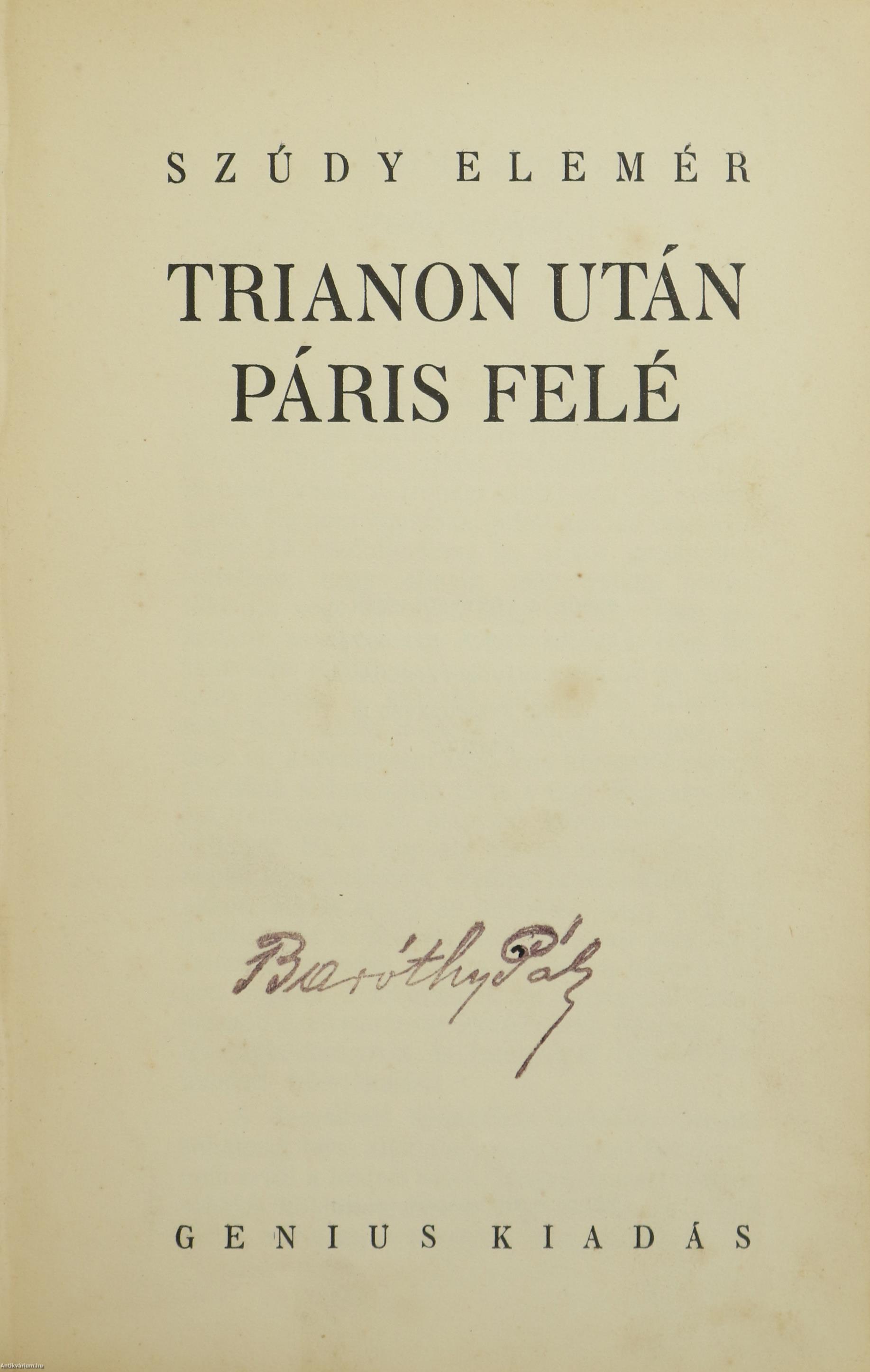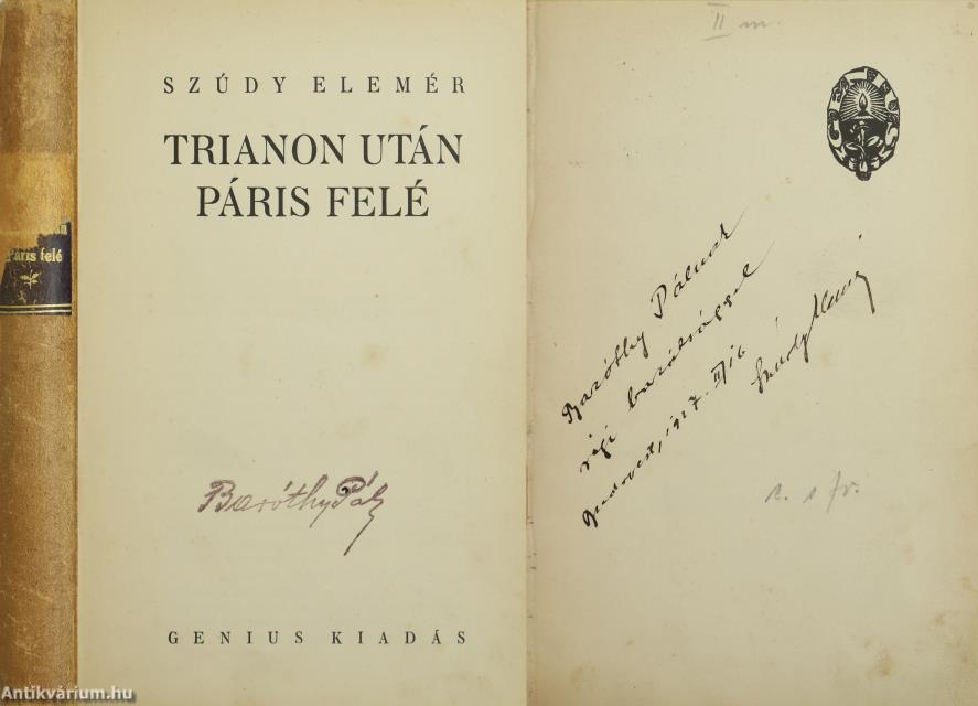 Szerző által dedikált példány. Első kiadás. Trianon után Páris felé. Írta: Szúdy Elemér.