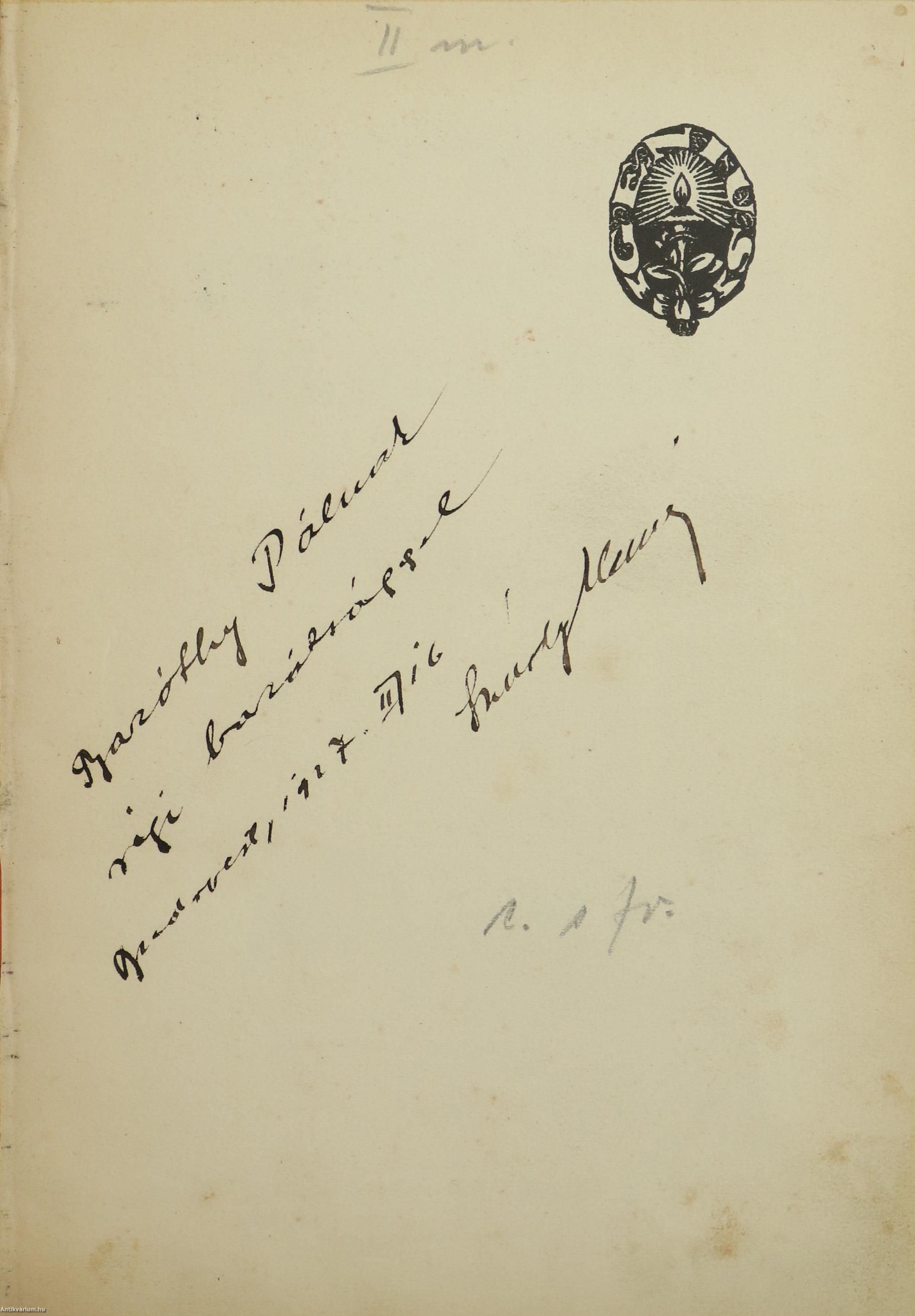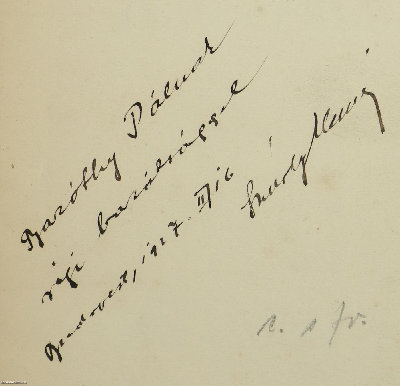 Az előlapon a szerző, Szúdy Elemér tollal beírt, névre szóló dedikációja olvasható: "Baróthy Pálnak régi barátsággal. Budapest, 1927. II. 16. Szúdy Elemér".