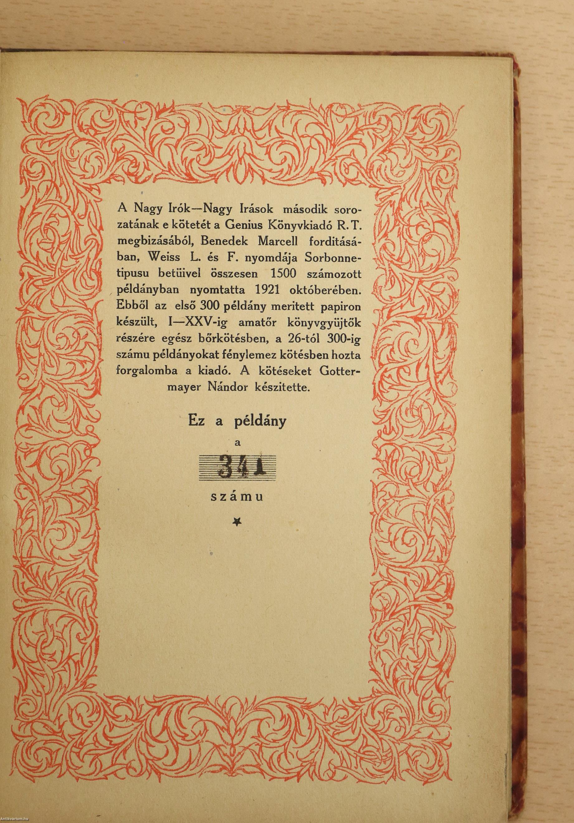 Számozott példány. Félbőr könyvkötői kötésben Gottermayer Nándor könyvkötészetéből. A Nagy irók - Nagy irások második sorozatának e kötetét a Genius Könyvkiadó R.T. megbizásából, Benedek Marcell fordításában, Weiss L. és F. nyomdája Sorbonne-tipusu betűivel összesen 1500 számozott példányban nyomtatta 1921 októberében. Nyomatta Weiss L. és F., Budapest. E könyv a 341 számú példány. A felső lapélek színezettek. Az I. kötet előzéklapján és a II. kötet előlapján tulajdonosi bejegyzés található.