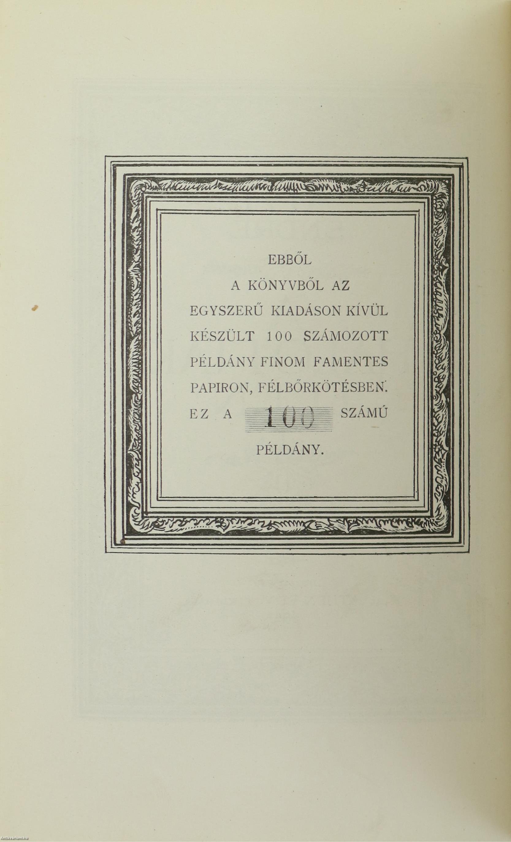 "Ebből a könyvből az egyszerű kiadáson kívül készült 100 számozott példány finom famentes papiron, félbőrkötésben. Ez a 100. számú példány."