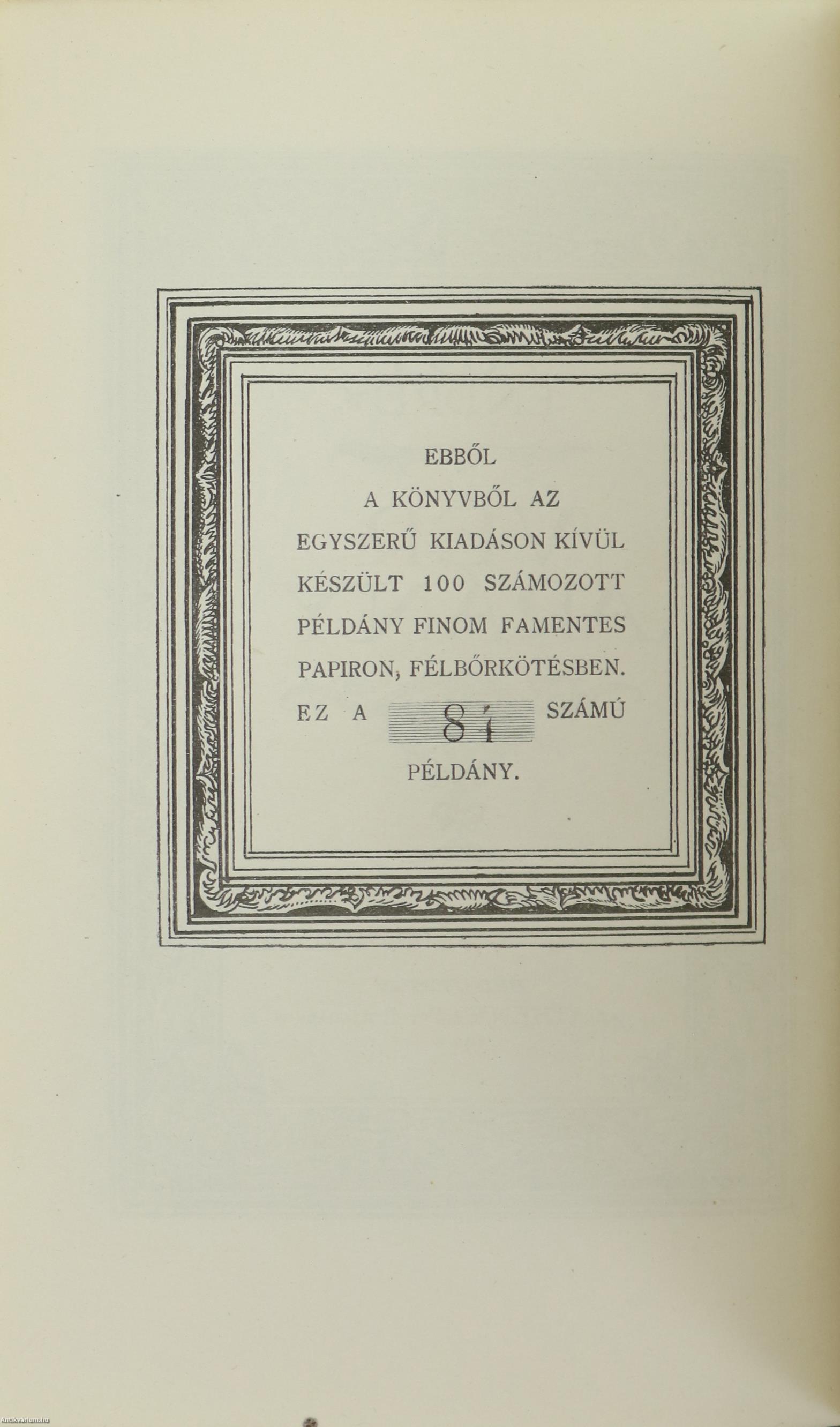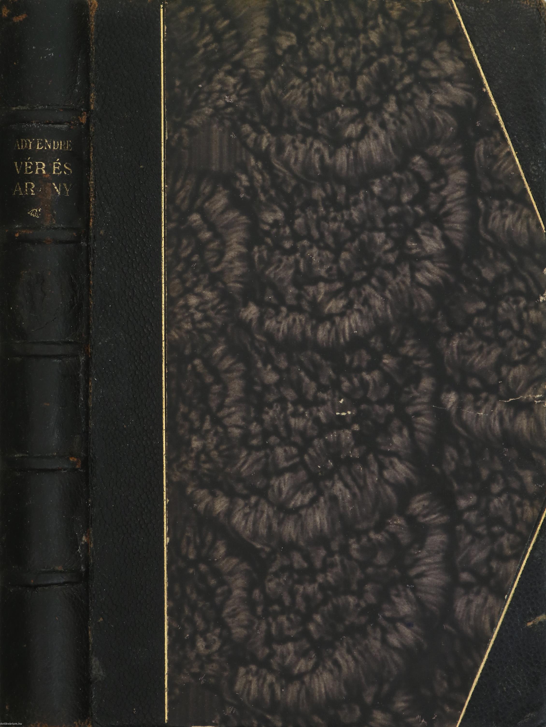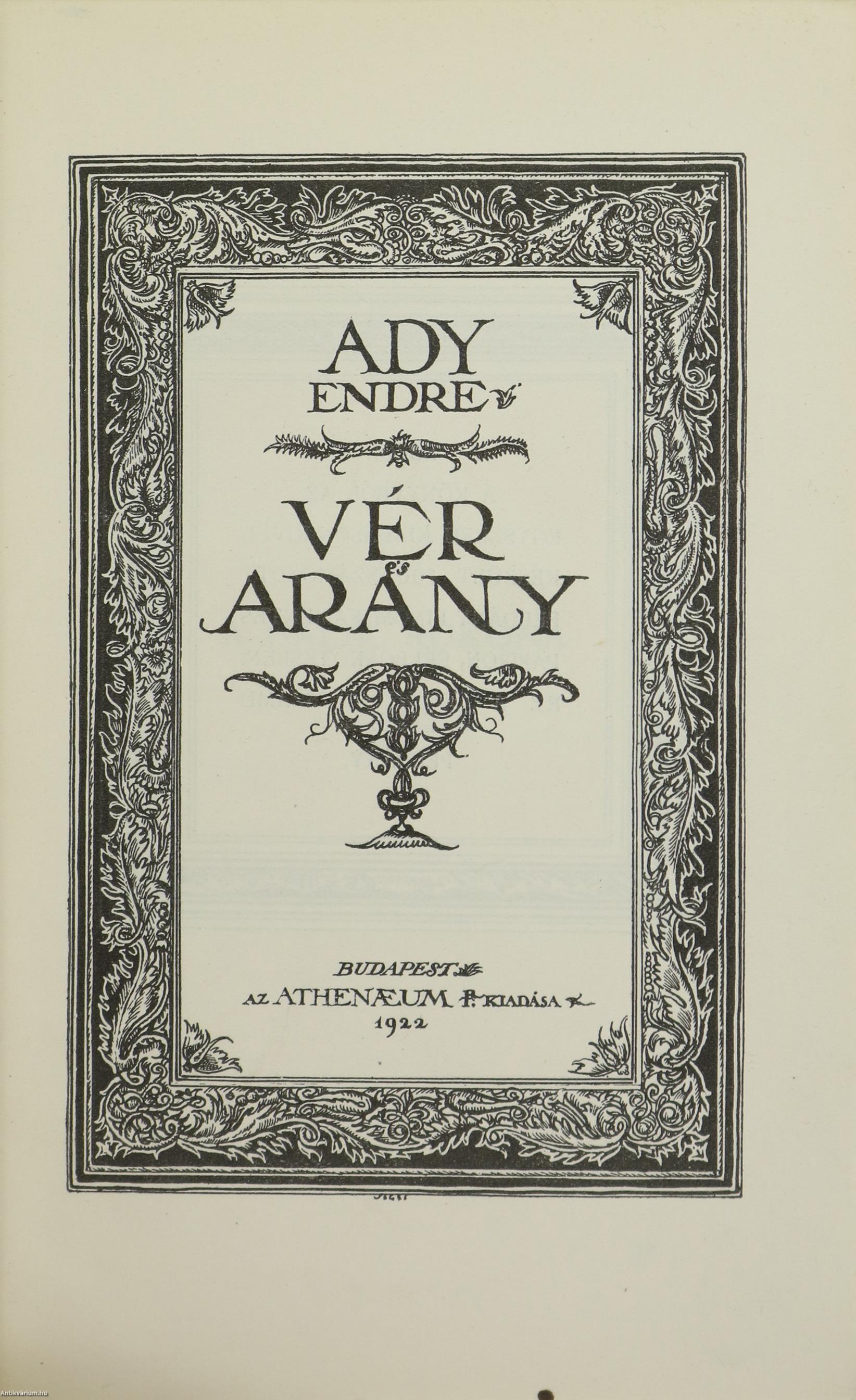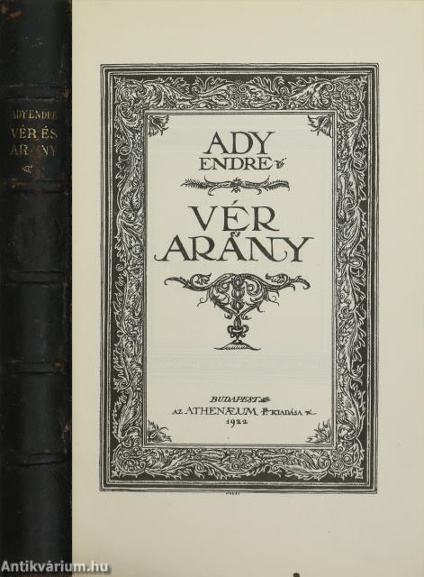 Számozott kiadás. Vér és Arany. Írta: Ady Endre. "Ebből a könyvből az egyszerű kiadáson kívül készült 100 számozott példány finom famentes papiron, félbőrkötésben. Ez a 84. számú példány." A címlapon és az előlapon lévő illusztrációkat Jeges Ernő készítette. Tartalomjegyzékkel ellátott kötet. Az utolsó oldalon tulajdonosi bélyegzés látható. Kiadta az Athenaeum Rt. Budapesten. Kiadói félbőr kötésben lévő példány feliratozatlan, mintás, aranyozott címfedéllel és hátlappal, aranyozott feliratozású, ötbordás könyvgerinccel, mintás, kiadói előzéklapokkal, aranyozott felső lapélekkel, hiánytalan állapotban. A kötet szerzője Ady Endre (Érmindszent, 1877. november 22. – Budapest, Terézváros, 1919. január 27.) a huszadik század egyik legjelentősebb magyar költője. Költészetének témái szinte az emberi lét minden jelentős területére kiterjednek (szabadság, egyenlőség, hit, nemzet, szerelem, mulandóság, stb.). Az "Új Versek" sikere után a "Vér és arany" is hasonlóan viharos sikert aratott. Hatvany Lajos, Ignotus és Bródy Sándor is a korszak egyik legfontosabb alkotásaként értékelte az eredetileg 1907 végén megjelent kötetet. Az 1906-7-ben Párizsban tartózkodó költő újabb költeményei nem csupán továbbírták a korábbi ciklusokból már ismert Ady-lírát, de új témákkal is bővítették a költő versvilágát.