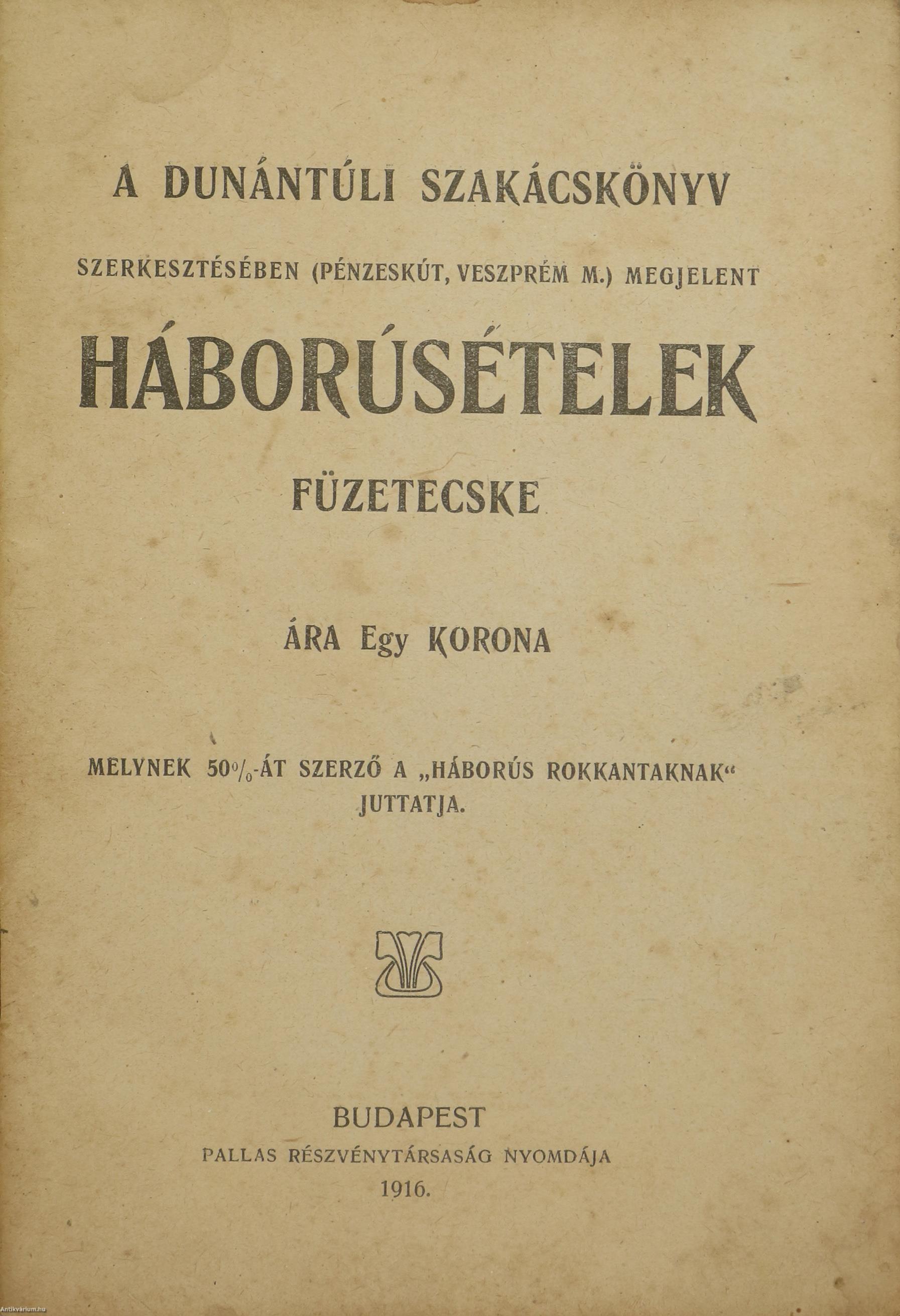 Első kiadás. A Dunántúli szakácskönyv szerkesztésében (Pénzeskút, Veszprém M.) megjelent Háborúsételek füzetecske. [Írta: alsószopori Nagy Ferencné.] A kiadvány bevételének 50%-át a szerző a "háborús rokkantaknak" juttatja. A kötet 77 ételreceptet tartalmaz. Tartalomjegyzékkel kiegészített kötet. Nyomatott a Pallas Részvénytársaság Nyomdájában Budapesten. Kiadói tűzött papírkötésben lévő példány feliratozott címfedéllel, feliratozatlan könyvgerinccel, a hátlapon és az utolsó oldalon ceruzával készített gyermekrajzzal, hiánytalan állapotban. "Dunántúli Szakácskönyvemben leírtam, mindent, amit szem, száj csak megkívánhat. Módos és szegény megtalálja abban a kasszájához mért ételsort és leírást. Ebben a kis füzetben azonban tekintettel eme szomorú időkre, csakis a legegyszerűbb, főleg a legkönnyebben beszerezhető tápanyagok - liszt, burgonya, zsír és zöldségfélékből előállítható ételleírásokat közöltem - mintegy kiegészítésképen fenti könyvemhez. Ha ismét a régi kerékvágásba zökkenik drága hazánk, szolgáljon e kis füzet mementónak, hogy addig kell takarékoskodni, míg van miből és hogy a muszáj mennyire képes volt lefokozni minden téren való igényeinket." - írta a szerző a végszóban.