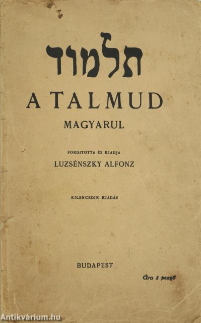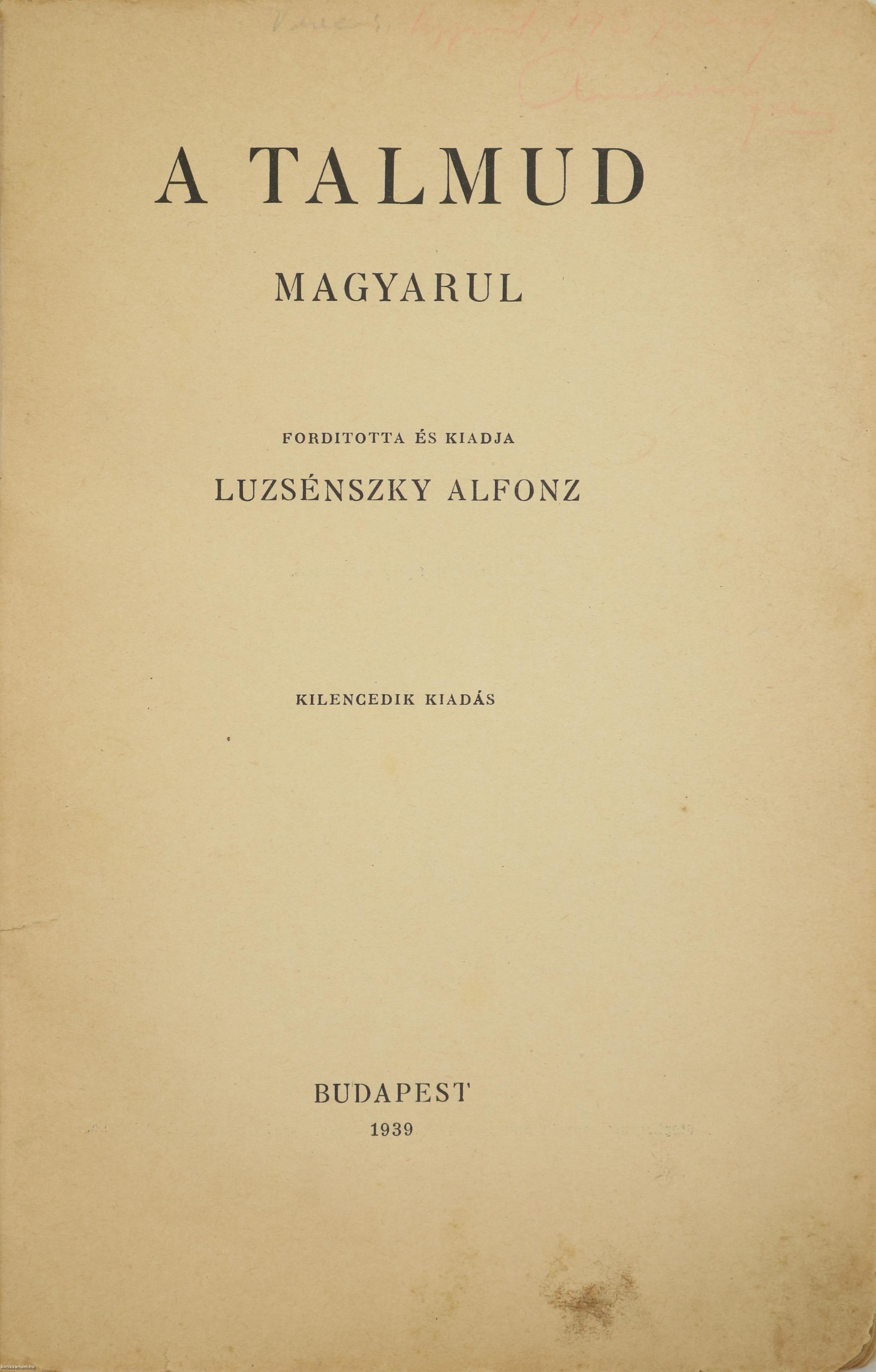 A Talmud magyarul. Fordította és kiadja: Luzsénszky Alfonz. Kilencedik kiadás. Nyomtatta a Stephaneum Nyomda, Budapesten. Kiadói varrott papírkötésben lévő példány héber és magyar feliratos címfedéllel, feliratozatlan, könyvkötő által pótolt papír könyvgerinccel, feliratozatlan hátlappal, körbevágatlan belívekkel, több oldalon ceruzás jelöléssel, hiánytalan állapotban. Különálló egyedi mellékletként: Két korabeli antiszemita nyomtatvány. A kötet kiadója, Luzsénszky Alfonz (Budapest, 1876. január 13. – Budapest, Józsefváros, 1953. december 30.) újságíró, lapkiadó. Neve leginkább a szélsőjobboldali, antiszemita, a zsidóságot "leleplező" munkák közreadása révén vált ismertté. Ezek sorába tartozik A Talmud magyarul c. mű is, amely először 1911-ben jelent meg, és amelyről bebizonyosodott, hogy nem szakszerű fordítás, hanem korábbi, a Talmudot keresztényellenesnek beállító, antiszemita munkákon alapuló "ismertetés." Luzsénszkyt a "fordítás" miatt már a Horthy-korban perbe fogták, 1945 után pedig el is ítélték őt egy másik írása (A zsidóság bűnei) miatt.