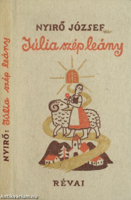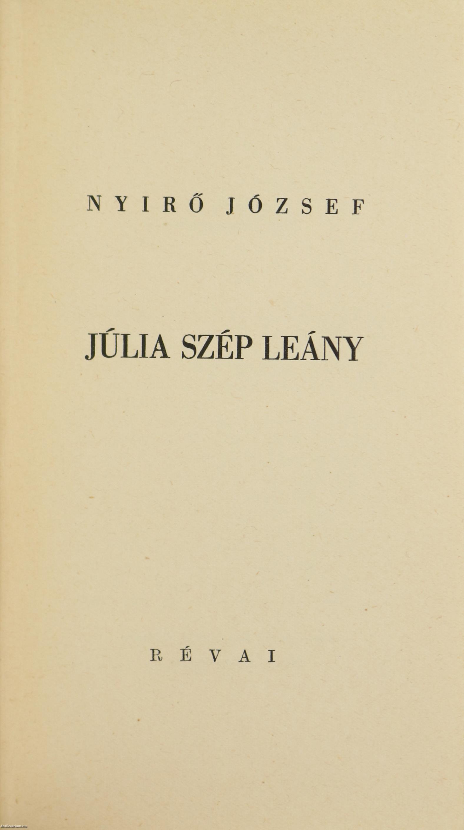 Első kiadás. Júlia szép leány. Írta: Nyirő József. A kötéstábla rajza Pekáry István munkája. A kötet tartalmazza a szerző eddig megjelent műveinek könyvjegyzékét. A címfedél belső oldalán illusztrációval ellátott Ex-libris, valamint kereskedelmi címke (Faragó Zsigmond Könyvesboltja) látható. A könyvet a Révai Nyomda nyomtatta Budapesten. Kiadói halina kötésben lévő példány két színnel feliratozott, színes, illusztrációval ellátott címfedéllel, színes feliratos könyvgerinccel, feliratozatlan hátlappal, hiánytalan, jó állapotban.