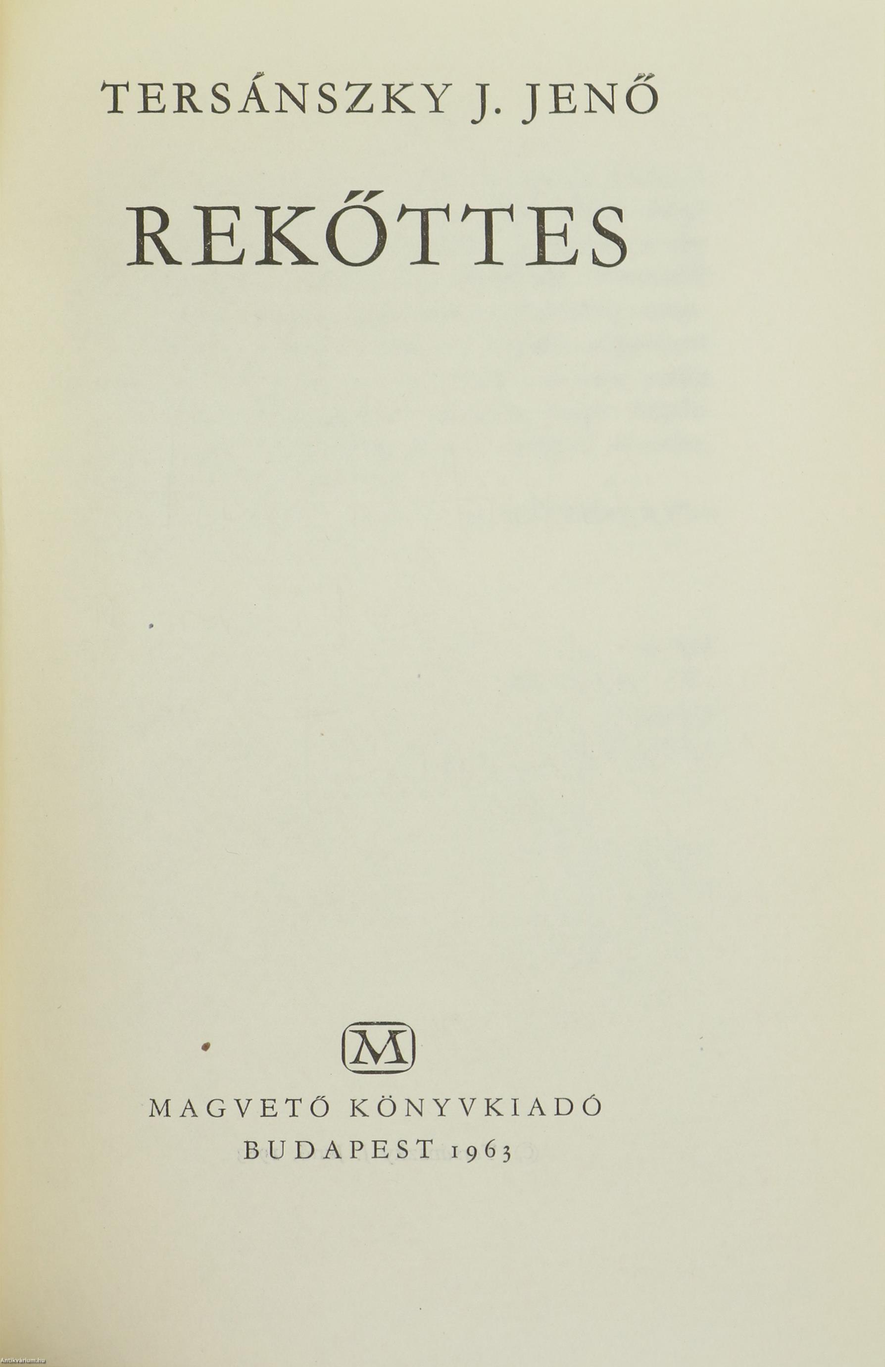 Szerző által dedikált példány. Első kiadás. Rekőttes. Írta: Tersánszky J. Jenő. A címkép verzóján a szerző, Tersánszky Józsi Jenő tollal beírt, névre szóló dedikációja olvasható: "H. A.-nak szeretettel: Tersánszky Józsi Jenő". A szerző egykorú arcmásával (Duma Sándor) és további 2 kétoldalas képtáblával illusztrált kötet. Nyomtatta a Franklin-nyomda Budapesten. Kiadói egészvászon kötésben lévő példány a szerző aranyozott monogramjával ellátott címfedéllel, aranyozott feliratozású könyvgerinccel, feliratozatlan hátlappal, hiánytalan állapotban, feliratos, fülszöveggel ellátott, kiadói borítófedélben. A szerző, Tersánszky Józsi Jenő (Nagybánya, 1888. szeptember 12. – Budapest, 1969. június 12.) Kossuth-díjas író, a 20. századi magyar prózairodalom kiemelkedő alakja. Szülővárosában érettségizett, majd jegyzőgyakornok lett Szapáryfalván. 1907-ben egy évig joggyakornok volt Nagybányán. Osvát Ernő figyelt fel tehetségére, így jelenhetett meg első írása 1910 februárjában a Nyugatban. Alig egy évvel később, 1911-ben novelláskötetét kiadta a Nyugat Könyvtár. A Magyarországi Tanácsköztársaság ideje alatt szimpatizált a forradalommal, ezért annak bukása után a Horthy-korszakban rengeteg támadás érte. A Kakuk Marci c. könyve lett a fő műve. A ciklikus szerkezetű regényében a polgári társadalom keretei közül kihullott, máról holnapra élő csavargót nem rajzolta ideálalakká: látta hibáit és életformájának fogyatékosságát, de egyediségét is. 1940-től mint újságíró riporter dolgozott a "Híd" című lapnak is, de végleg megmaradt a regényírás mellett.