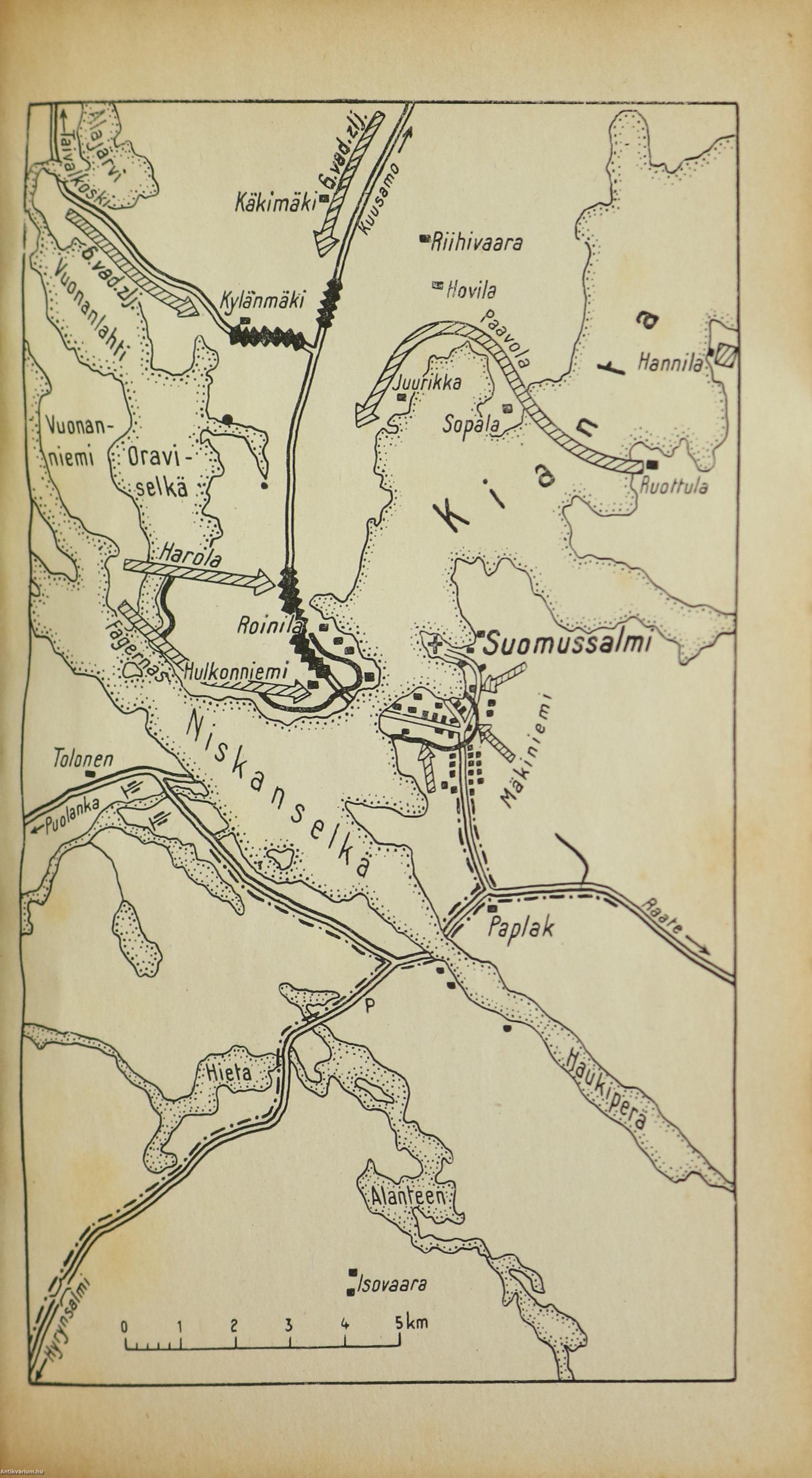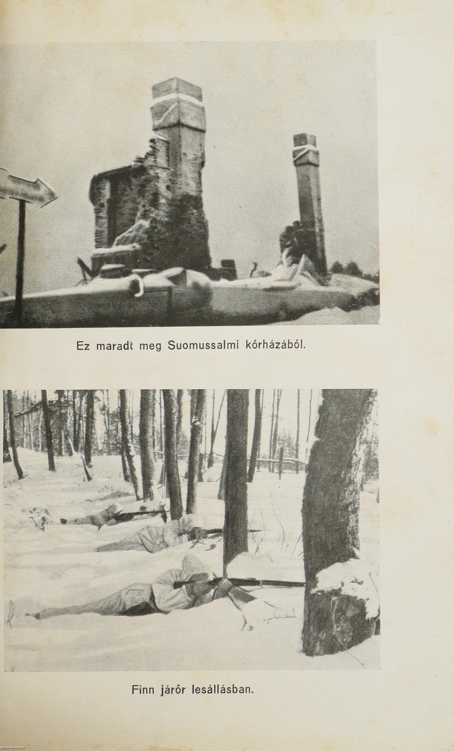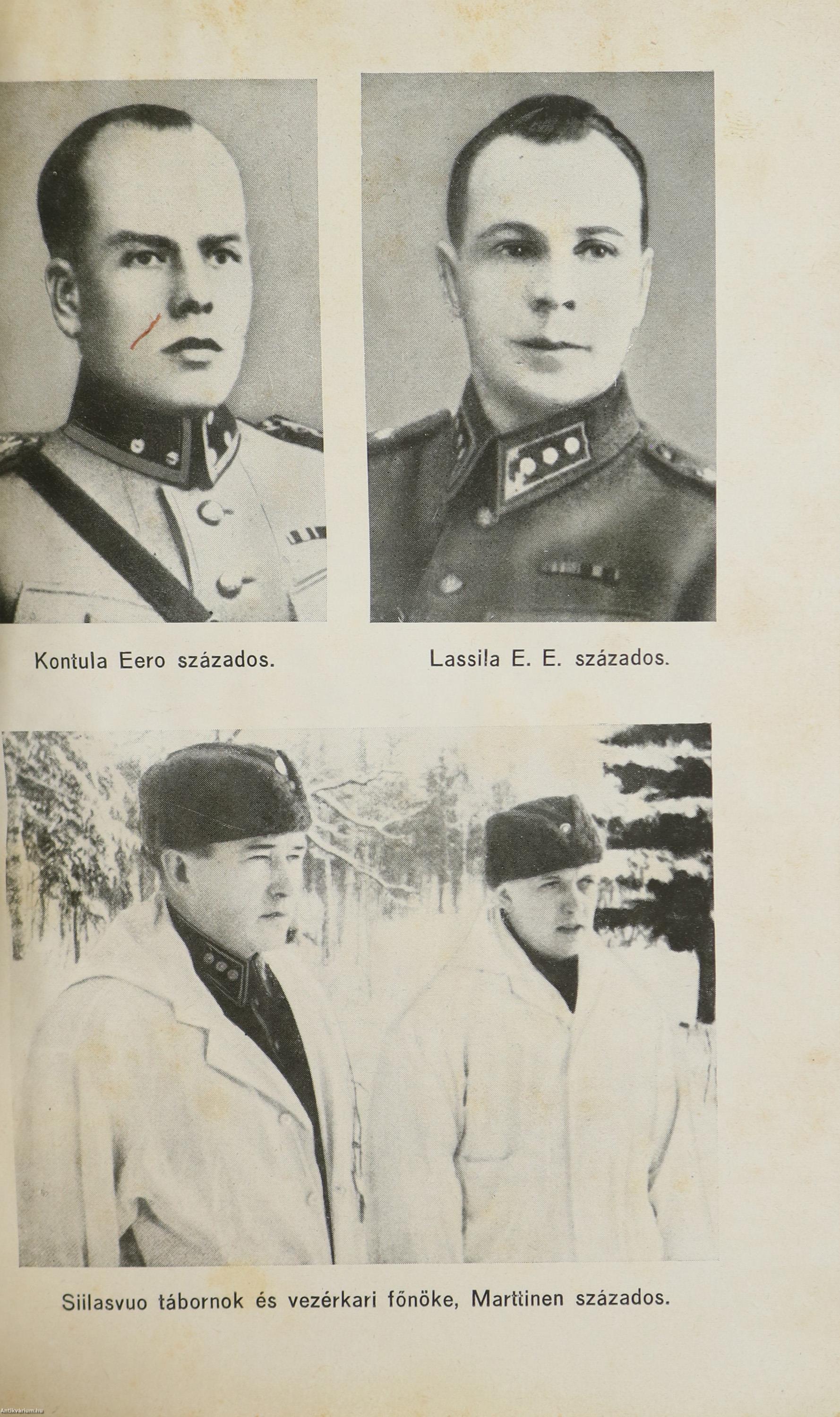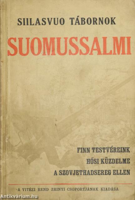Első magyar nyelvű kiadás. Suomussalmi. Finn testvéreink hősi küzdelme a szovjethadsereg ellen. Írta: Siilasvuo tábornok. Fordította: vitéz Mezey Dénes. Szöveg közti, fekete-fehér térképvázlatokkal és 8 fekete-fehér, feliratozott, eredeti képtáblával illusztrált, valamint előszóval és szerzői ajánlással kiegészített kötet. A könyv a vitézi rend Zrínyi Csoportjának kiadása, nyomtatta a Stádium Sajtóvállalat Rt. Budapesten. Kiadói varrott papírkötésben lévő példány két színnel feliratozott, egész oldalas illusztrációval ellátott címfedéllel, feliratos könyvgerinccel, a szerzőről és a műről készült ismertető szöveggel ellátott hátlappal, átlagos, hiánytalan állapotban. Ritka! A kötet szerzője, Hjalmar Fridolf Siilasvuo (Helsinki, 1892. március 18. – Oulu, 1947. január 11.) finn katona, ezredes, altábornagy, tábornok. Kiemelkedő katonai vezető, aki részt vett Finnország 20. századi nagy háborúiban és több híres győztes csata is kötődik a nevéhez. Katonai kitüntetései: Vaskereszt, a finn Fehér Rózsa Rend, Mannerheim Kereszt. Jogi tanulmányokat végzett és finn oktatási minisztériumban dolgozott. Az első világháború idején a központi hatalmak oldalán harcolt, egy német hegyivadász zászlóaljnál volt beosztott tiszt. A finn polgárháborúban a Fehér Gárdához csatlakozott. Zászlóalj parancsnokként (Siilasvuo brigád) tevékeny résztvevője volt a fehér győzelemmel záruló nagy Tamperei csatának. Mikor a Szovjetunió 1939 végén megtámadta Finnországot Siilasvuo ezredes több fontos katonai megbízást kapott. Kiemelkedően és legendásan helytállt alárendeltjeivel együtt a Suomussalmi Csatában, amikor a 163. és a 44. szovjet hadosztály többszörös túlerőben lévő csapatai megtámadták az ezredes finn honvédő egységeit.