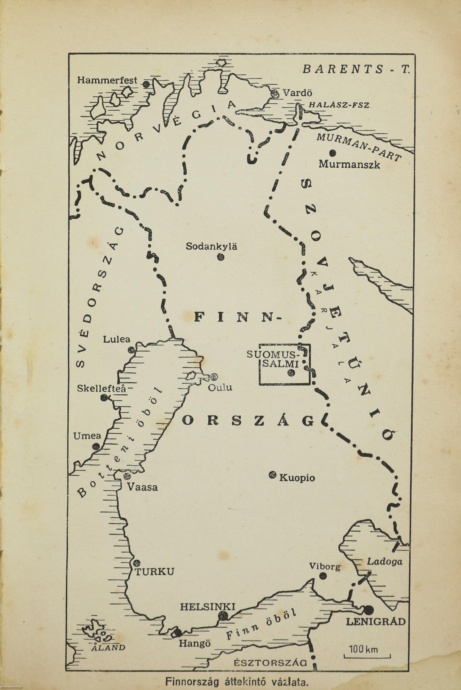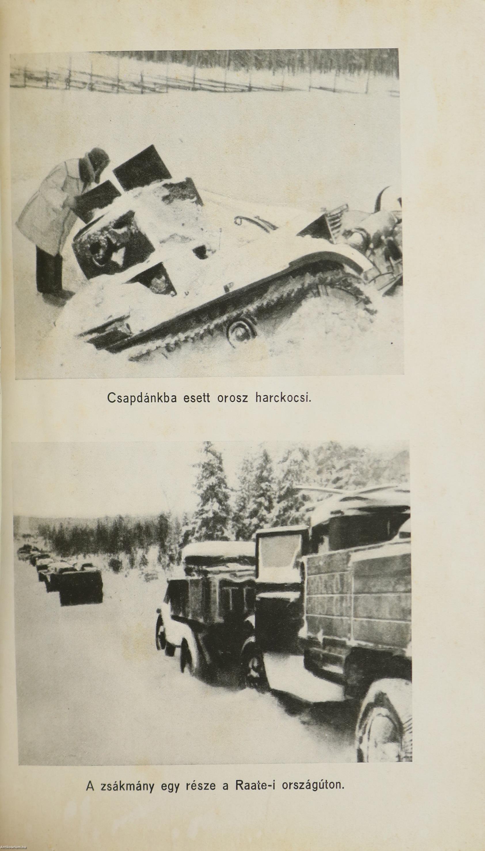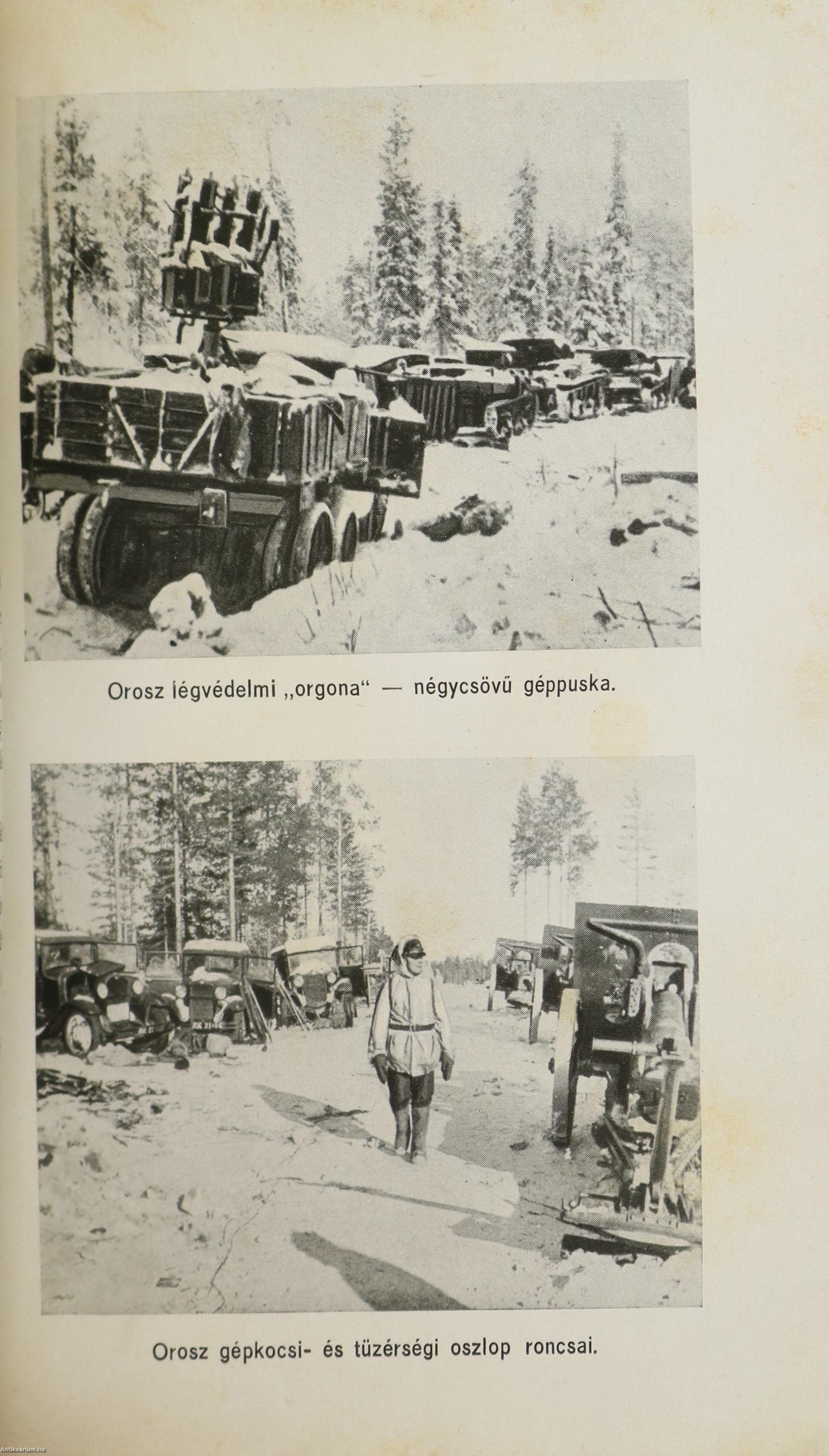 Első magyar nyelvű kiadás. Suomussalmi. Finn testvéreink hősi küzdelme a szovjethadsereg ellen. Írta: Siilasvuo tábornok. Fordította: vitéz Mezey Dénes. Szöveg közti, fekete-fehér térképvázlatokkal és 8 fekete-fehér, feliratozott, eredeti képtáblával illusztrált, valamint előszóval és szerzői ajánlással kiegészített kötet. A könyv a vitézi rend Zrínyi Csoportjának kiadása, nyomtatta a Stádium Sajtóvállalat Rt. Budapesten. Kiadói varrott papírkötésben lévő példány két színnel feliratozott, egész oldalas illusztrációval ellátott címfedéllel, feliratos könyvgerinccel, a szerzőről és a műről készült ismertető szöveggel ellátott hátlappal, átlagos, hiánytalan állapotban. Ritka! A kötet szerzője, Hjalmar Fridolf Siilasvuo (Helsinki, 1892. március 18. – Oulu, 1947. január 11.) finn katona, ezredes, altábornagy, tábornok. Kiemelkedő katonai vezető, aki részt vett Finnország 20. századi nagy háborúiban és több híres győztes csata is kötődik a nevéhez. Katonai kitüntetései: Vaskereszt, a finn Fehér Rózsa Rend, Mannerheim Kereszt. Jogi tanulmányokat végzett és finn oktatási minisztériumban dolgozott. Az első világháború idején a központi hatalmak oldalán harcolt, egy német hegyivadász zászlóaljnál volt beosztott tiszt. A finn polgárháborúban a Fehér Gárdához csatlakozott. Zászlóalj parancsnokként (Siilasvuo brigád) tevékeny résztvevője volt a fehér győzelemmel záruló nagy Tamperei csatának. Mikor a Szovjetunió 1939 végén megtámadta Finnországot Siilasvuo ezredes több fontos katonai megbízást kapott. Kiemelkedően és legendásan helytállt alárendeltjeivel együtt a Suomussalmi Csatában, amikor a 163. és a 44. szovjet hadosztály többszörös túlerőben lévő csapatai megtámadták az ezredes finn honvédő egységeit.