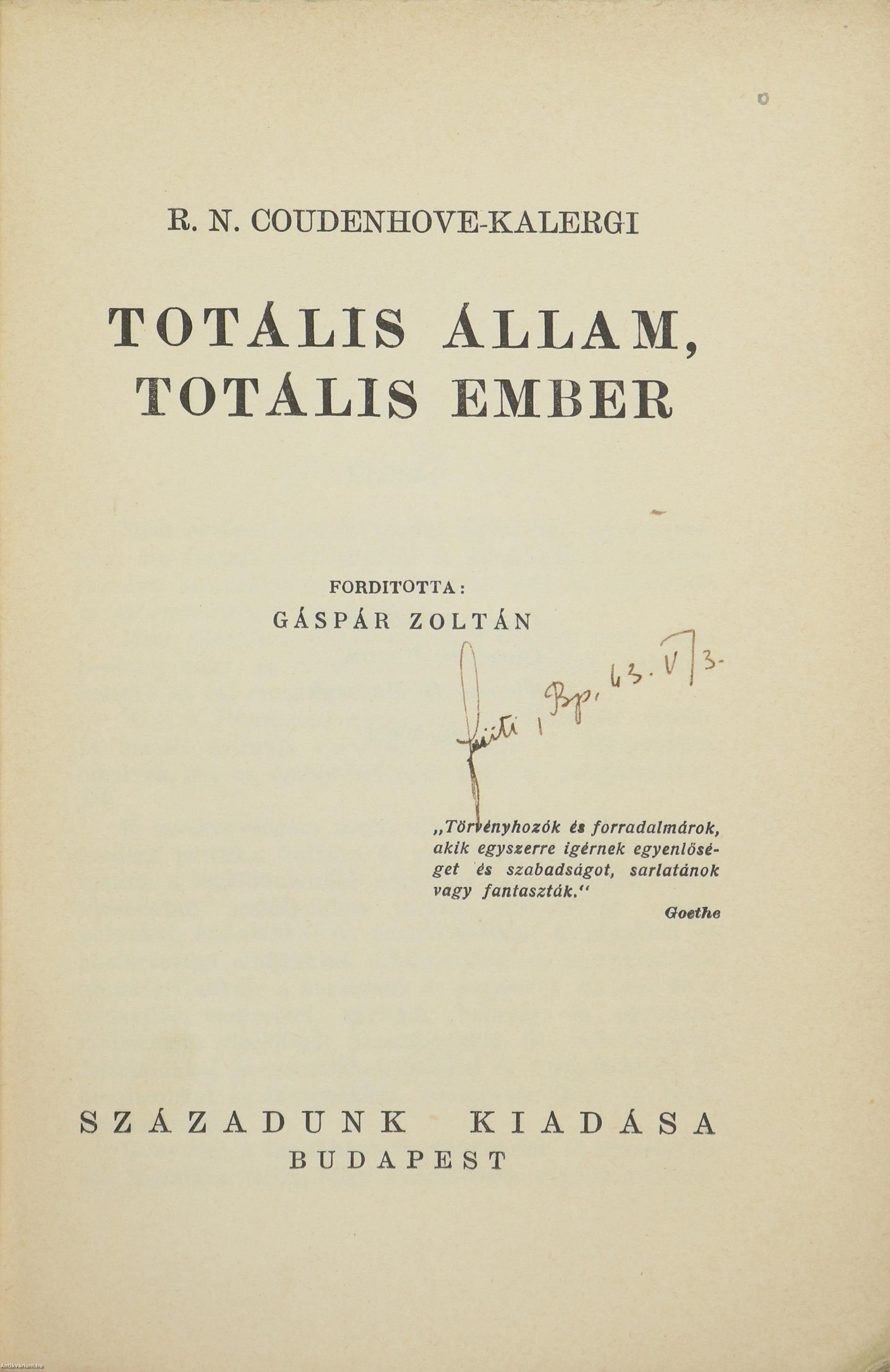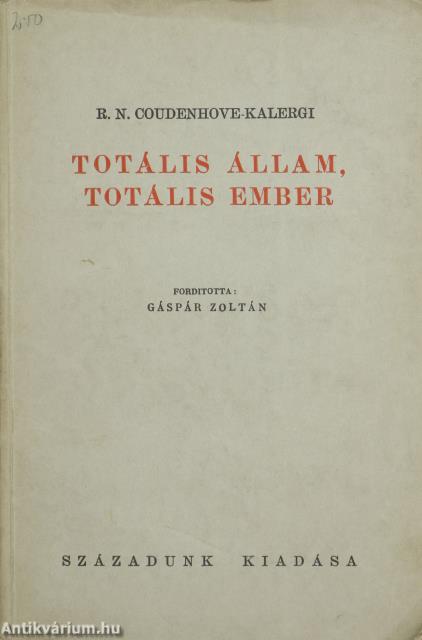 Első magyar nyelvű kiadás. Totális állam, totális ember. Írta: R. N. Coudenhove-Kalergi. Fordította: Gáspár Zoltán. Egy szöveg közti fekete-fehér ábrával illusztrált, valamint szerzői ajánlással és előszóval, részletes tartalomjegyzékkel és könyvhirdetésekkel kiegészített kötet. A címlapon tollal írt tulajdonosi bejegyzés látható. Nyomtatta a Radó István Nyomdai Műintézet, Budapesten. Kiadói varrott papírkötésben lévő példány két színnel feliratozott címfedéllel, feliratos könyvgerinccel, hátlapon a nyomda feltüntetésével, részben felvágatlan belívekkel, hiánytalan állapotban. A kötet szerzője, Richard Coudenhove-Kalergi, eredeti nevén Richard Nikolaus Eijiro von Coudenhove-Kalergi, /Richard Nikolaus Eijiro Graf Coudenhove-Kalergi/, (Tokió 1894. november 16. – Schruns, 1972. július 27.) filozófus, történész, diplomata, szociológus, a páneurópai eszme nemzetközi hírű megfogalmazója. Richard Coudenhove-Kalergi Tokióban született, majd iskoláit először Csehországban, majd Ausztriában, a híres Theresianumban végezte. Az érettségi után a Bécsi Egyetemen filozófiát és történelmet tanult, ahol doktori címet is szerzett. 1922-ben jelentette meg indítványát "Páneurópa – Egy indítvány" címmel, majd 1923-ban megjelent könyve "Páneurópa" címmel, mely megalapozta a Páneurópa Mozgalom alapjait és eszmeiségét. Célja egy olyan európai közösség létrehozása volt, mely politikai és gazdasági érdekközösségként megakadályozhatja egy újabb világháború kirobbanását. 1931-ben könyvet írt Sztálinról és birodalmáról „Stalin & Co” címmel, 1937-ben pedig Hitlerről és nemzetiszocialista államáról írt egy újabb könyvet „Totális Állam – Totális Ember” címmel. Ezekben a műveiben szembeszállt a korszak mindkét totális és diktatórikus mozgalmával, a nemzetiszocializmussal és a kommunizmussal is. Mozgalmát 1933-ban a nemzetiszocialista hatalomátvétel után Németországban betiltották, így a gróf előbb Svájcba, majd az Egyesült Államokba távozott. Tevékenységét a második világháború után is folytatta, az ő szellemiségét tükrözte Winston Churchill híres 1946-os zürichi beszéde, melyben egy "Egyesült Európa" létrehozására tett javaslatot. Emellett Coudenhove-Kalergi kezdeményezte az Európai Parlamenti Unió létrehozását is 1947-ben. 1950-ben elsőként vehette át az európai egység megteremtésében játszott életművéért a Nagy Károly-díjat (Karlspreis vagy Charlemagne Award), amelyet Aachen városa adományoz azoknak, akik a legtöbbet tették az európai egység és az európai béke megteremtéséért. Coudenhove-Kalergi fiatal korától tagja volt a bécsi Humanitas szabadkőműves páholynak, mely elsősorban karitatív tevékenységgel és pacifista kezdeményezések támogatásával hívta fel magára a figyelmet.
