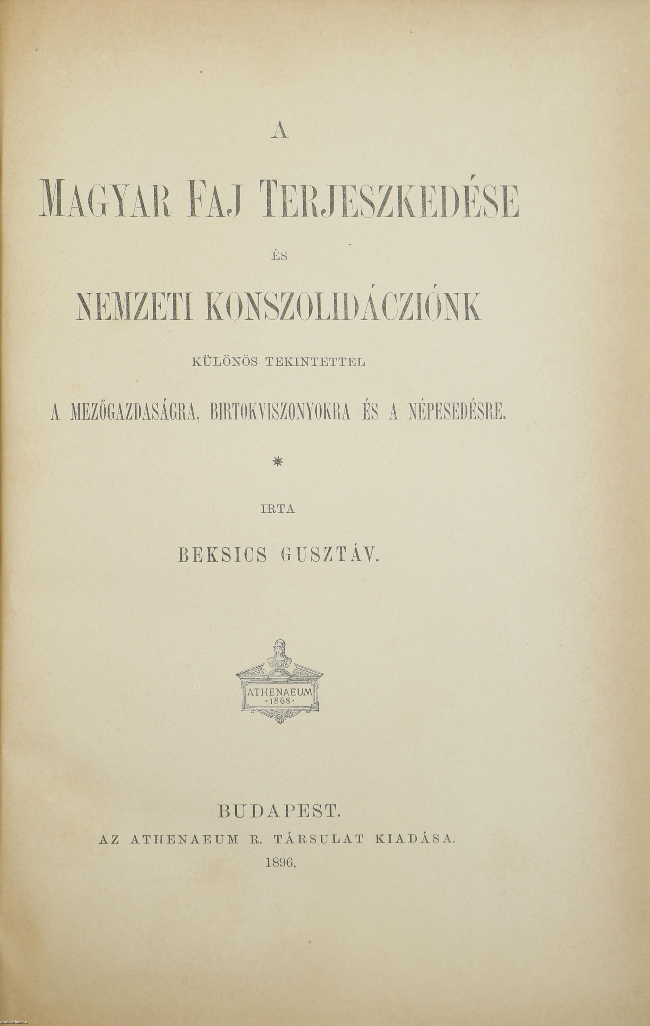 Első kiadás. A magyar faj terjeszkedése és nemzeti konszolidácziónk különös tekintettel a mezőgazdaságra, birtokviszonyokra és a népesedésre. Írta: Beksics Gusztáv. Szerzői előszóval, három kihajtható táblázattal és tartalomjegyzékkel ellátott kötet. Nyomtatta az Athenaeum R. Társ. Könyvnyomdája Budapesten. Könyvkötői félvászon kötésben lévő példány feliratozatlan, mintás címfedéllel és hátlappal, aranyozott feliratozású könyvgerinccel, hiánytalan állapotban. A kötet szerzője, Beksics Gusztáv (Gamás, 1847. február 9. – Budapest, 1906. május 7.) ügyvéd, hírlapíró, műfordító, országgyűlési képviselő. Katolikus hittudományi tanulmányokat végzett a pécsi püspöki papnevelő intézetben és a pesti központi szemináriumban, de megvált a papi pályától és jogot hallgatott az egyetemen. A Pesti Napló munkatársa, báró Kemény Zsigmond titkára, a szabadelvű párt képviselője, miniszterelnökségi miniszteri tanácsos. A "Magyar Nemzet" és a "Budapesti Közlöny" szerkesztője. Egyike volt az 1890-es évek legkitűnőbb magyar publicistáinak, a szabadelvű eszmékért következetesen harcolt a sajtóban, számos nagy fontosságú politikai eszmét vetett föl. Több röpiratot, politikai és történelmi könyvet adott ki. Regényeket és verseket is írt. Fordított franciából, spanyolból és olaszból is. Az "Ellenőr" c. lap szerkesztőségének a külföldi rovat vezetője, vezércikkírója. Számos cikke jelent meg a korabeli sajtóban.
