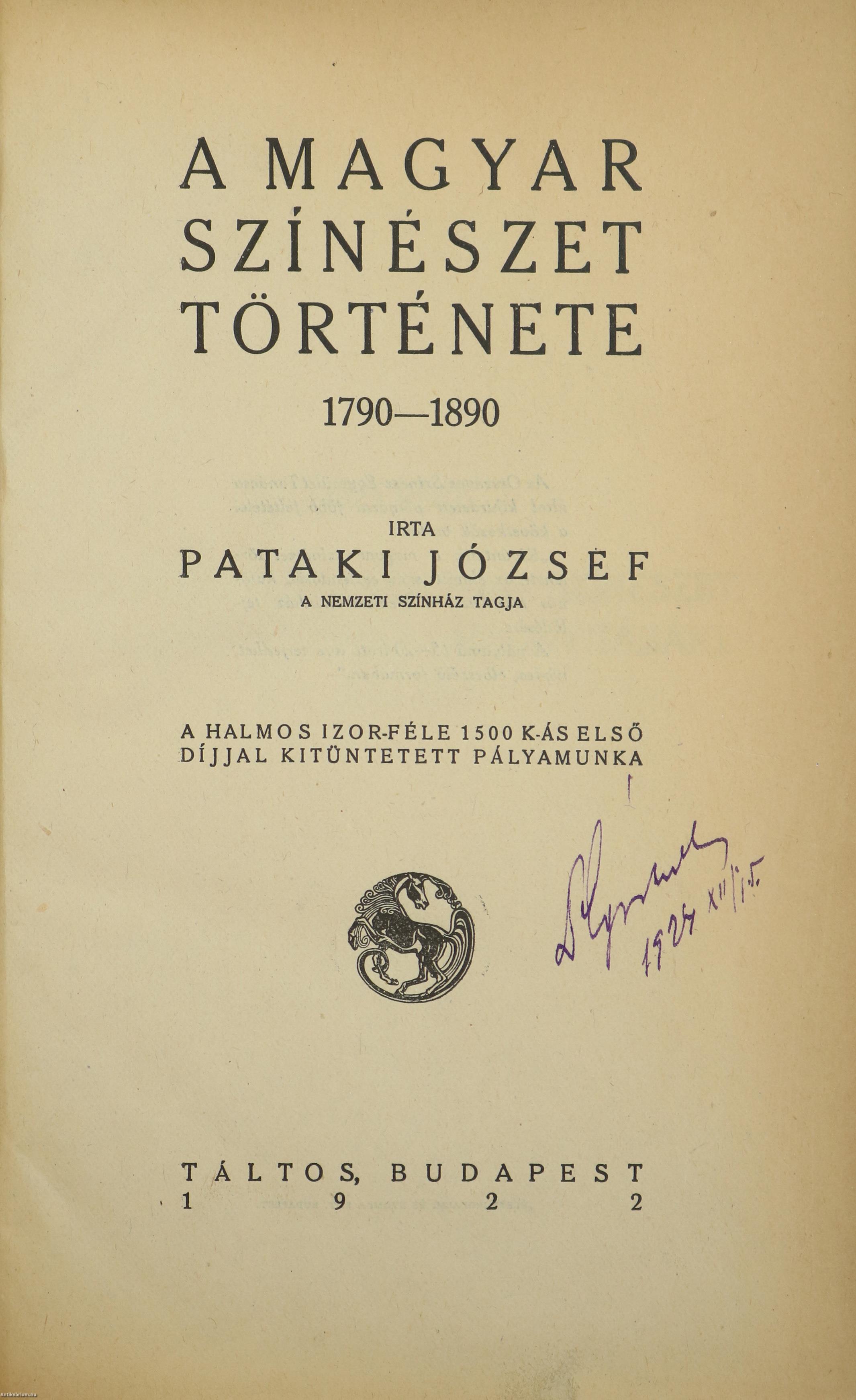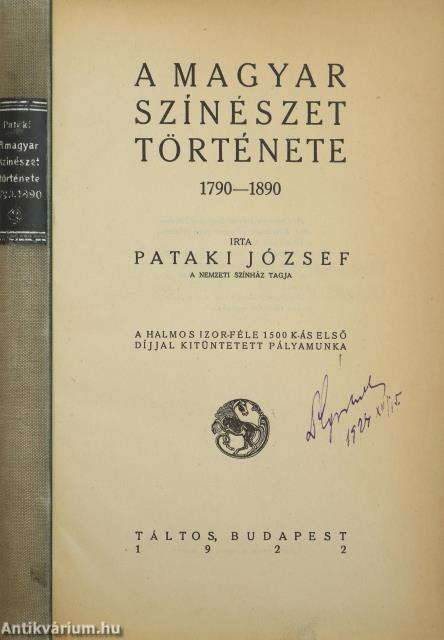Első kiadás. A magyar színészet története. 1790-1890. Írta: Pataki József a Nemzeti Színház tagja. A Halmos Izor-féle 1500 K.-ás első díjjal kitüntetett pályamunka. A forrásművek jegyzékével és tartalomjegyzékkel kiegészített kötet. A címlapon tollal beírt tulajdonosi bejegyzés látható. Nyomtatta az "Élet" Irodalmi és Nyomdai Rt. Budapesten. Könyvkötői félvászon kötésben lévő példány feliratozatlan, mintás címfedéllel és hátlappal, feliratos könyvgerinccel, mintás előzéklapokkal, hiánytalan állapotban. A kötet szerzője, Pataky Pataki József (Apácapuszta, 1875. március 4. – Budapest, 1957. augusztus 9.) színész, színháztörténész. Színészi pályáját 1898-ban kezdte vidéki társulatoknál, majd 1913-ban a Nemzeti Színház tagja lett, ahol több mint harminc évig dolgozott. Jellemszínészként és paraszti figurák hiteles megformálójaként vált ismertté, de filmszerepekben is feltűnt. Emellett színháztörténeti munkássága is jelentős: tanulmányokat publikált, és megírta A magyar színészet története 1790–1890 című művét. Fontos szerepet vállalt a színházi közéletben is, például az Országos Színészegyesület tanácsosaként és a Nemzeti Színház Múzeumának munkatársaként.