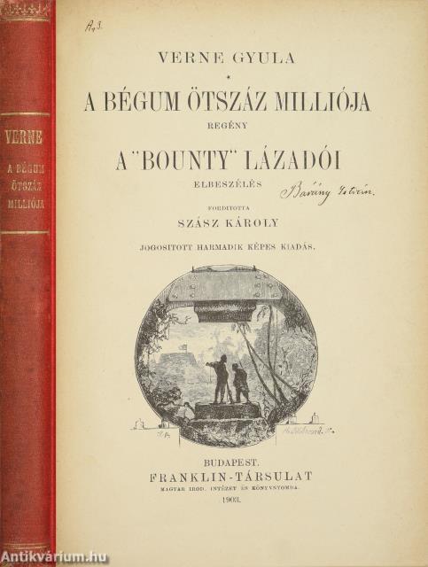 A Bégum ötszáz milliója. Regény. / A "Bounty" lázadói. Elbeszélés (két mű egy könyvben). Írta: Verne Gyula. Fordította: Szász Károly. Jogosított harmadik képes kiadás. Számos fekete-fehér, eredeti rajzzal illusztrált, valamint részletes tartalomjegyzékkel és a kiadó hirdetésével kiegészített kötet. A címlapon tollal írt tulajdonosi bejegyzés látható. Nyomtatta a Franklin-Társulat Nyomdája. Kiadói egészvászon kötésben lévő példány feliratozatlan, dombornyomott keretezéssel ellátott címfedéllel, aranyozott feliratozású könyvgerinccel, levélmotívumokkal díszített, megtört kiadói előzéklapokkal, hiánytalan állapotban. A kötet szerzője, Jules Gabriel Verne /Verne Gyula/ (Nantes, 1828. február 8. – Amiens, 1905. március 24.) francia író, egyben a tudományos-fantasztikus irodalom egyik legnagyobb, korszakalkotó alakja. A könyveiben említett száznyolc terv és találmány döntő többségét mára már megvalósították. Kalandos műveiben a föld tájainak, embereinek és természeti helyeinek, valamint a korát megelőző technikai találmányok bemutatásának gazdag tárházát mutatja be izgalmas cselekmények és karakteres szereplők segítségével.