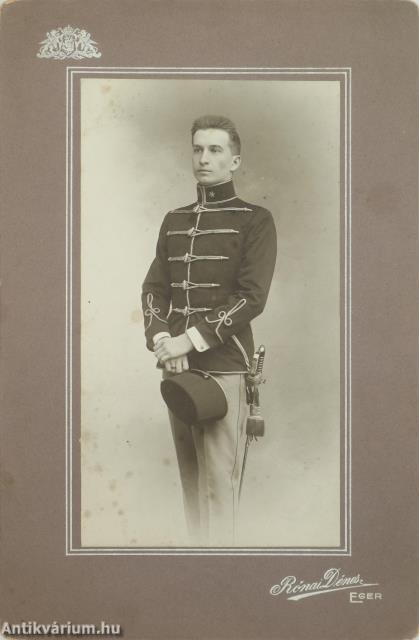 Egy hadnagyi rendfokozatú honvéd huszártisztet ábrázoló fekete-fehér fotográfia Rónai Dénes fényképész egri műhelyéből.
