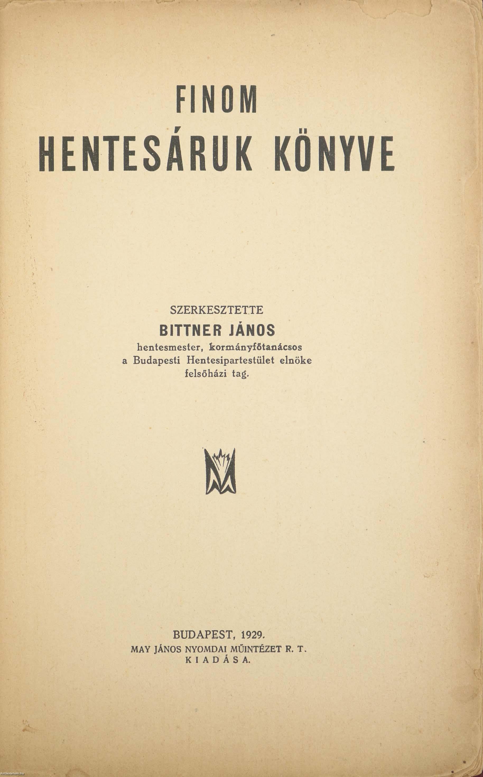 Finom hentesáruk könyve. Szerkesztette: Bittner János hentesmester, kormányfőtanácsos, a Budapesti Hentesipartestület tagja, felsőházi tag.