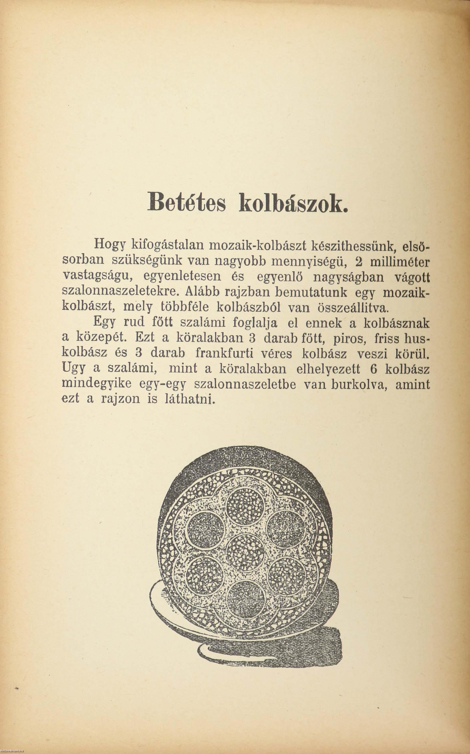 Valódi debreceni kolbász. — Sütni való kolbászok. — Pirítani való kolbász. _ Forrázni való kolbászok. — Főznivaló kolbászok festése pácolólével. — Főzni való kolbászkák tiszta sertéshúsból. — Bajor kolbászkák. — Roston sült kolbász. — Finom kolbászka borjuhussal— Ferenc József hurka. — Sütni való frankfurti kolbász. — Jó főzni való kolbász. — Csemege-kolbászka. — Finomabb kolbászka. — Frankfurti konzerv-kolbászka. — Türingiai kolbászka. — Konzerv csemege-kolbászka. —- Vadászkolbász. — Wesztfáliai sertéshuskolbász. — Sörhöz való kolbászkák. — Pfalzi kolbászka. — Orosz főtt kolbász. — Nyersen ehető drezdai kolbászkák. — Drezdai kolbászka. — Bajor kolbászka. — Bajor kolbászkák boriuhussal. ~ Borjúhúskolbászkák. - Borjukolbász. — Borjuhuskolbász. — Frankfurti kolbászkák.— Svájci kolbász-kik — Wesztfáliai huskolbász. — Kőnigsbergi kolbászkák.— Bécsi konzerv-kolbászka. — Vesekolbász. — Német kolbászka — Párisi kolbászok. — Tojás-kolbászka. — Zürichi kolbász — Müncheni kolbász. — Hamburgi kolbász. —Schweinfurti kolbász. - Szarvasgomba-kolbászkák - Rajnai kolbász - Káposztához való kolbász. - Svájci vadászkolbász - Krepinett. — Északnémet huskolbász. — Észak-német kolbász. - Vajas kolbászkák. - Másféle huskolbász.— Meleg kemény kolbász. — Svéd puncskolbász. — Lioni kolbász — Straszburgi kolbász. Vajaskenyér-kolbász. Gőzkolbászkák. — Főtt huskolbász. — Boroszlói fokhagymás kolbász. — Jaueri kolbász. _ Bécsi kolbászkák. — Sörhöz való müncheni kolbászkák. — Berlini fokhagymás kolbász. — Regensburgi kolbász. — Paprikás kolbász. — Jager-féle sütnivaló kolbász. — Szepességi paprikás kolbászka 126—157