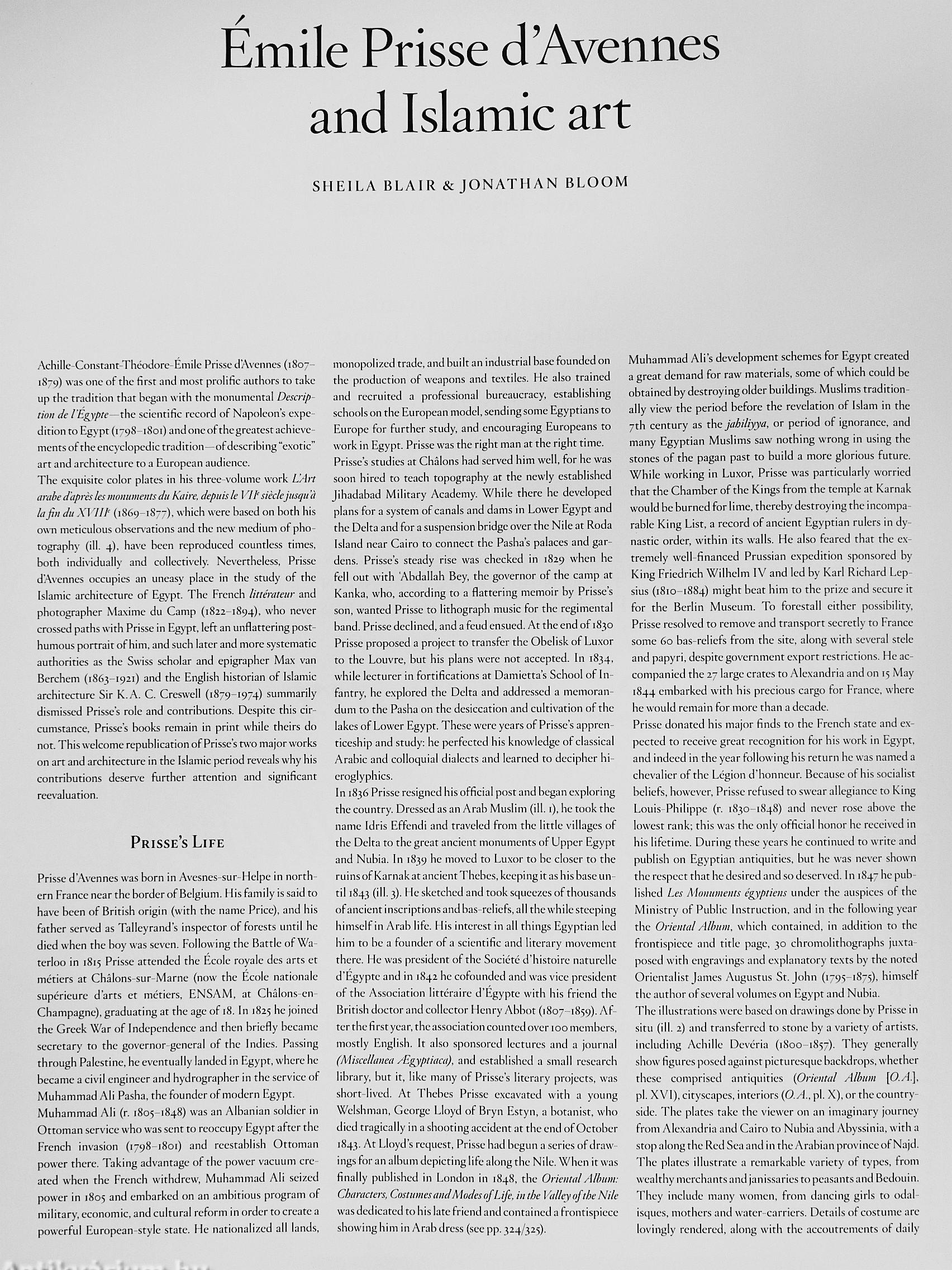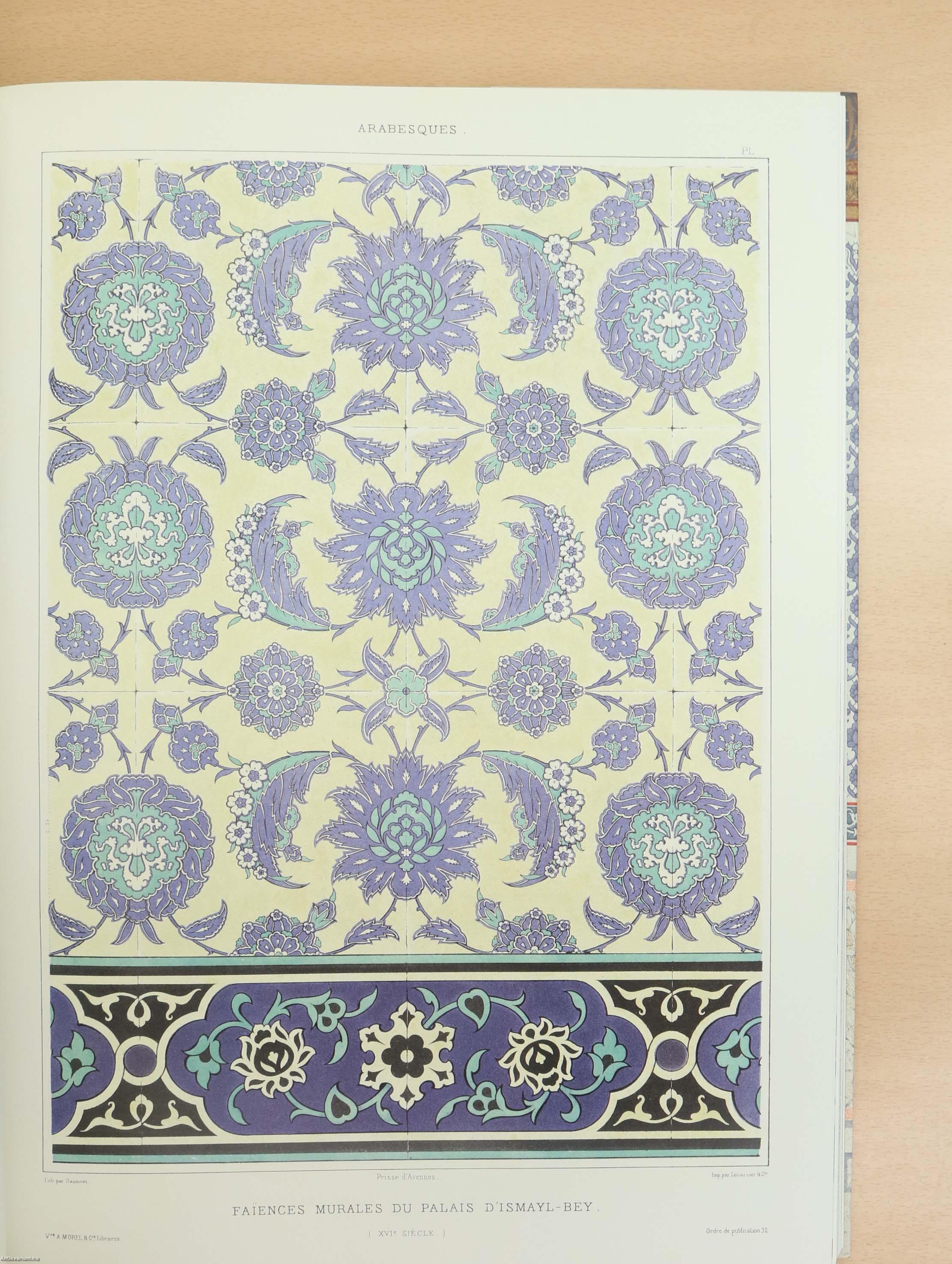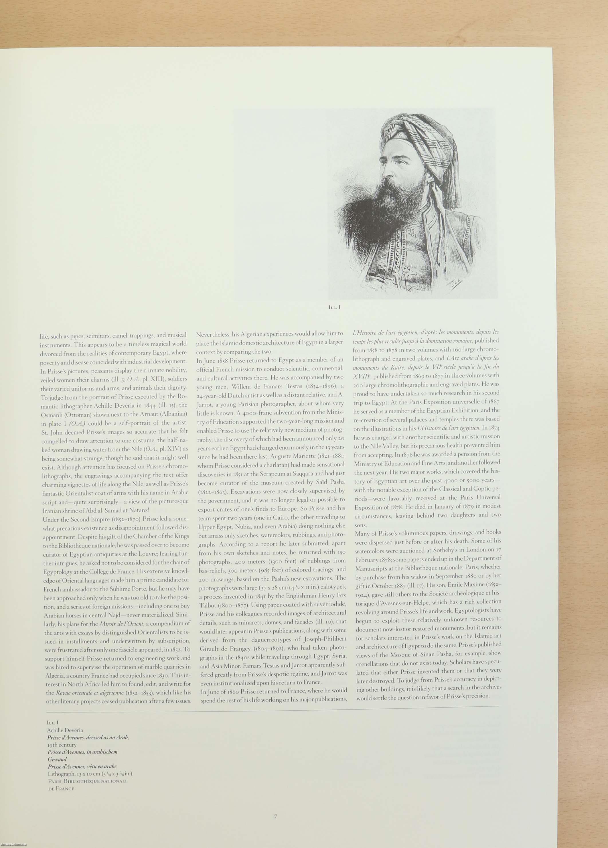 A szerző, Émile Prisse d’Avennes (1807–1879) francia orientalista, régész és művész volt, aki évtizedeket töltött Egyiptomban az arab és iszlám művészet dokumentálásával. Az arab kultúrában mélyen elmerülve – „Idrîs Effendi” néven ismerték – részletes rajzokat, díszítőmintákat és kalligráfiákat gyűjtött, amelyek az arab vizuális örökség páratlan forrásai lettek.