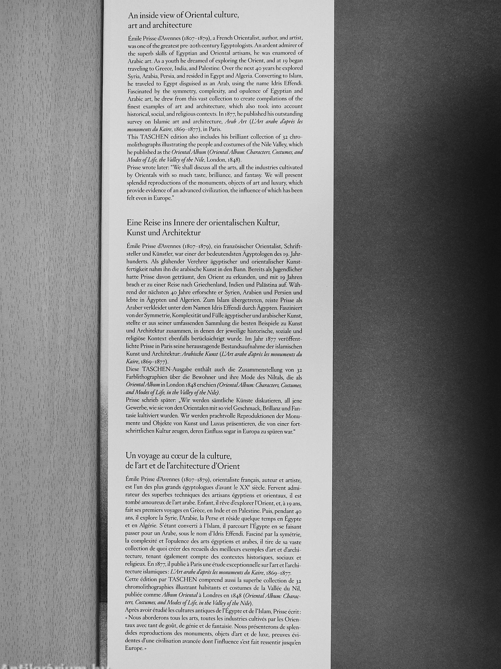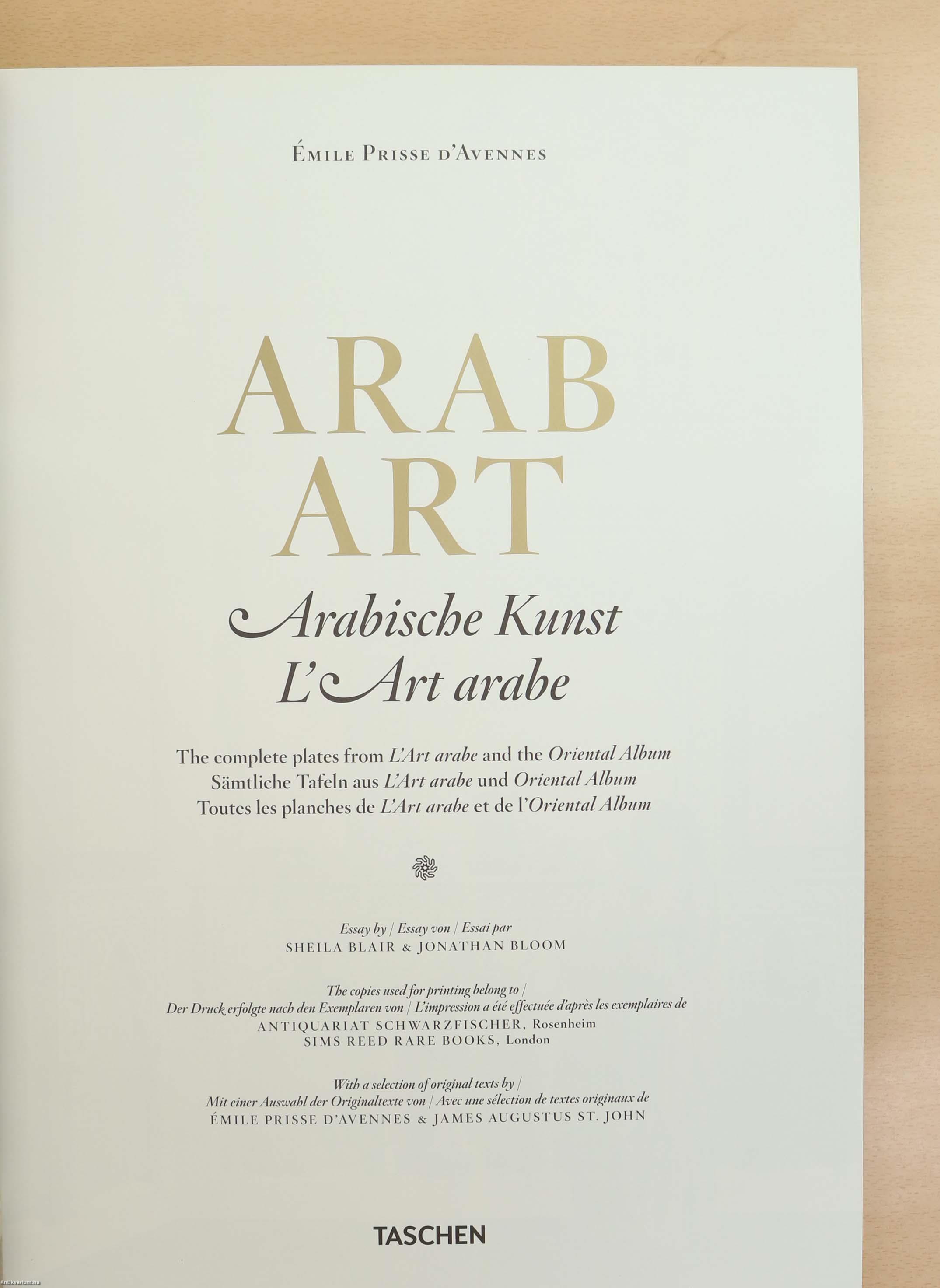 Az Émile Prisse d’Avennes Arab Art védődobozos díszkiadása a 19. századi orientalista művészet egyik legjelentősebb összefoglalása. A kötet az eredetileg 1877–1880 között megjelent L’Art Arabe és az Oriental Album teljes anyagát tartalmazza, több mint 200 színes chromolitográfiával, kalligráfiával, építészeti és ornamentális rajzzal. A Taschen kiadás modern nyomdai technológiával, nagy formátumban és kiemelkedő papírminőségben készült, elegáns, keménytáblás kötésben, védődobozban.