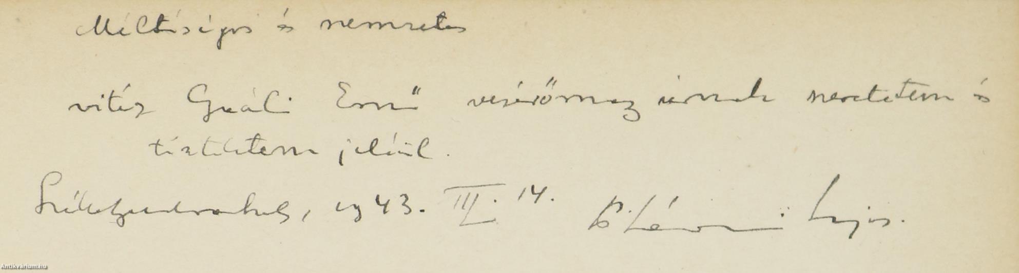 Későbbi félvászon kötésben lévő példány feliratozatlan, bőrmintás fed- és hátlappal, feliratozatlan könyvgerinccel, a kiadói feliratozott, művészien illusztrált védőborító bekötése mellett, tiszta belívekkel, hiánytalan állapotban.