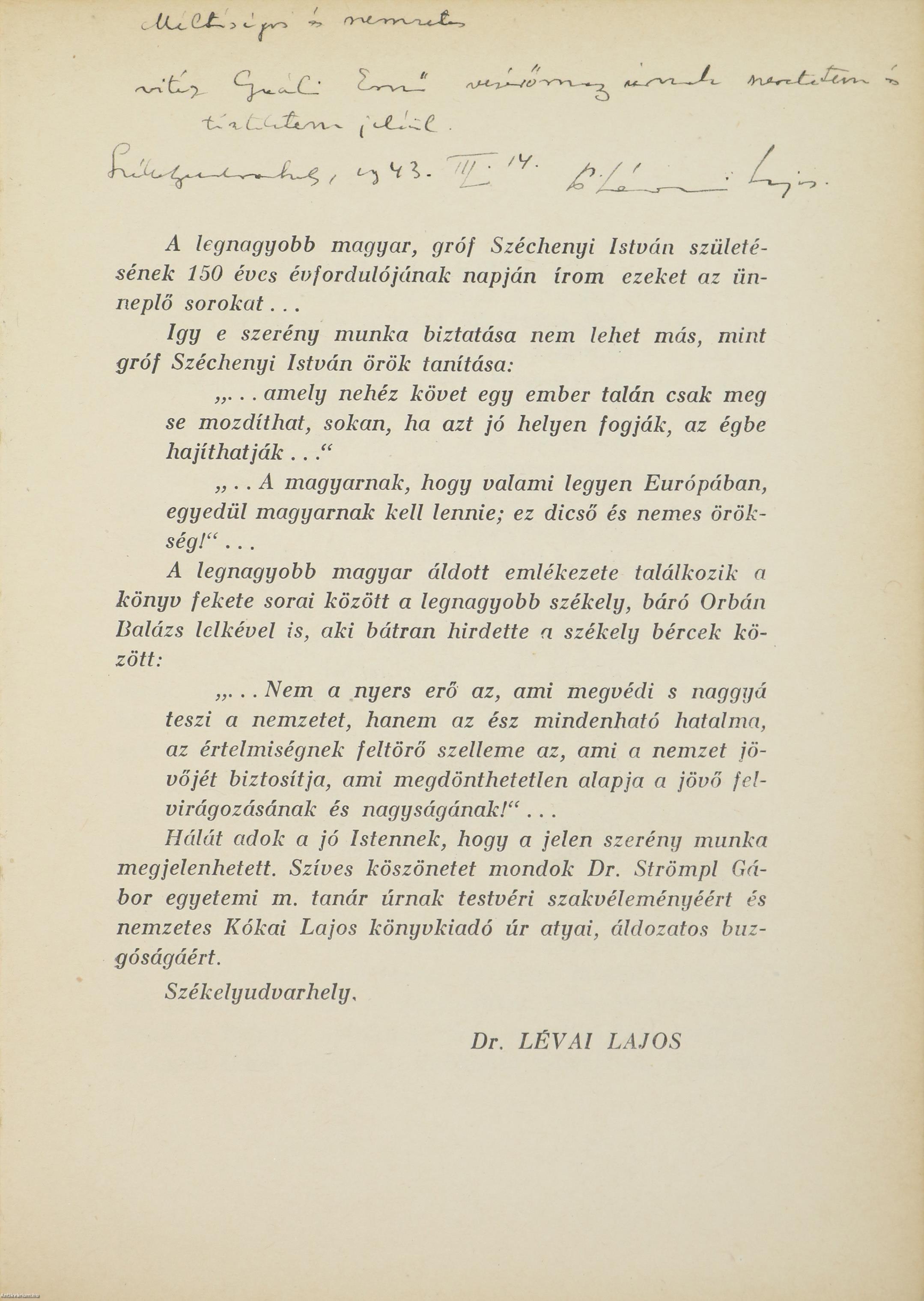 Szerzői bevezetéssel, tartalomjegyzékkel, 40 kötetvégi fekete-fehér, feliratos, egész oldalas képgyűjteménnyel és egy térképpel ("Erdély", Eggenberger, 1943). A könyvet a Madách Nyomda nyomtatta, Budapesten. Bevezető oldalon a szerző tollal beírt, névre szóló dedikációjával: "Méltóságos és nemzetes vitéz G. E. vezérőrnagy úrnak szeretetem és tiszteletem jeléül. Székelyudvarhely, 1943. III. 14. Dr. Lévai Lajos".