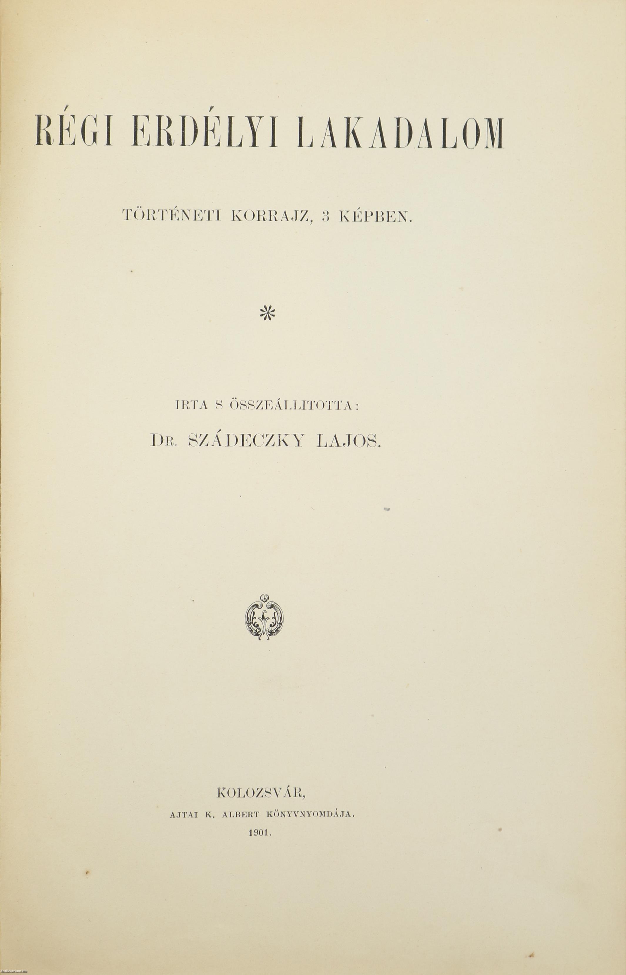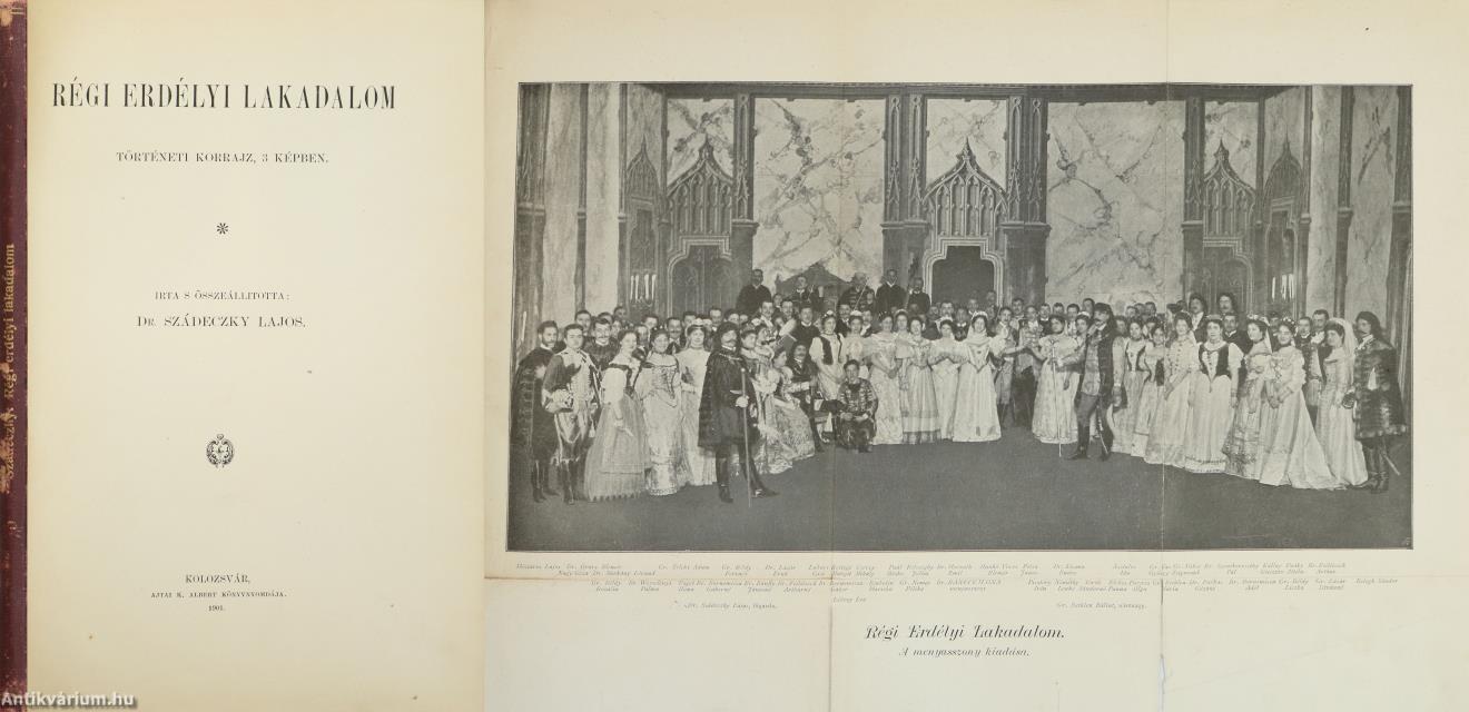 Első kiadás. Régi erdélyi lakadalom. Történeti korrajz, 3 képben. Írta és összeállította: Dr. Szádeczky Lajos. 16 fekete-fehér képtáblával - ebből 1 kihajtható - illusztrált, valamint előszóval kiegészített kötet. Nyomtatta Ajtai K. Albert Könyvnyomdája Kolozsváron. Korabeli egészvászon kötésben lévő példány feliratozatlan, dombornyomott keretezéssel ellátott címfedéllel és hátlappal, aranyozott feliratozású könyvgerinccel, mintázott lapélekkel, hiánytalan állapotban. A szerző, Szádeczky-Kardoss Lajos (Pusztafalu, 1859. április 5. – Budapest, 1935. december 29.) történész, egyetemi tanár, az MTA tagja. Pályáját a budapesti Egyetemi Könyvtár tisztviselőjeként kezdte, majd 1883-ban a budapesti egyetem magyar-történelem magántanára lett. 1891-ben a kolozsvári Magyar Királyi Ferenc József Tudományegyetemen a Magyar Történelem Tanszék vezetésével bízták meg. Főként Erdély és a székelység történetét kutatta, de foglalkozott II. Rákóczi Ferenccel és korával, valamint a hun-székely-magyar rokonság kérdésével is. 1895-ben tagja volt Zichy Jenő kaukázusi és közép-ázsiai expedíciójának. 1909-ben az MTA rendes tagjává választották. Trianon után részt vett a kolozsvári egyetem Szegedre menekítésében, és az újonnan alakuló szegedi egyetem Magyar Történelmi Intézetének vezetője lett.