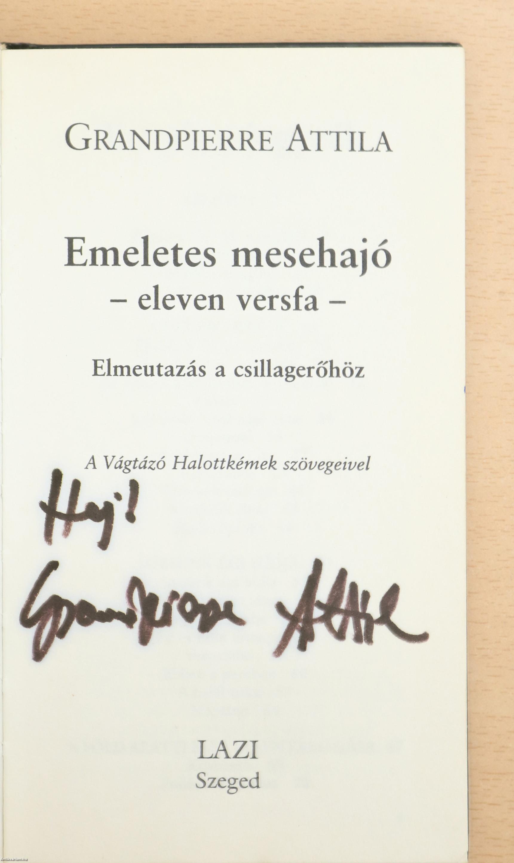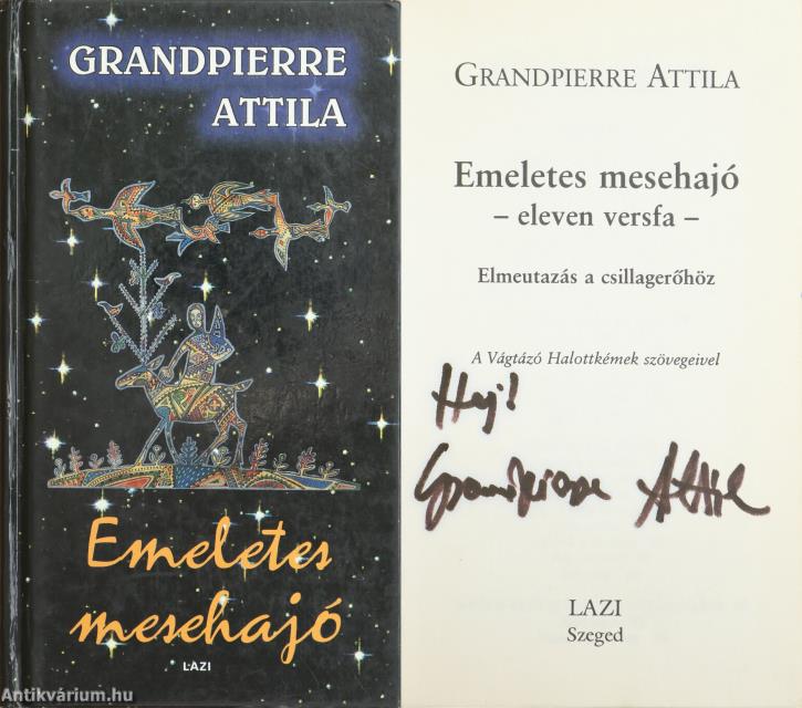 Szerző által dedikált példány. Emeletes mesehajó: Eleven versfa/Elmeutazás a csillagerőhöz. A Vágtázó Halottkémek szövegeivel. Írta: Grandpierre Attila. A kötet címlapján a szerző, Grandpierre Attila jól olvasható dedikációja látható: "Hej! Grandpierre Attila". A borító belső részén és az előzéklapon "sámánrajzok" és bejegyzések láthatók. Kiadói fűzött kemény papírkötésben lévő példány feliratozott, illusztrációval ellátott címfedéllel, feliratozott könyvgerinccel, rövid ismertetőt tartalmazó hátlappal, hiánytalan, jó állapotban.