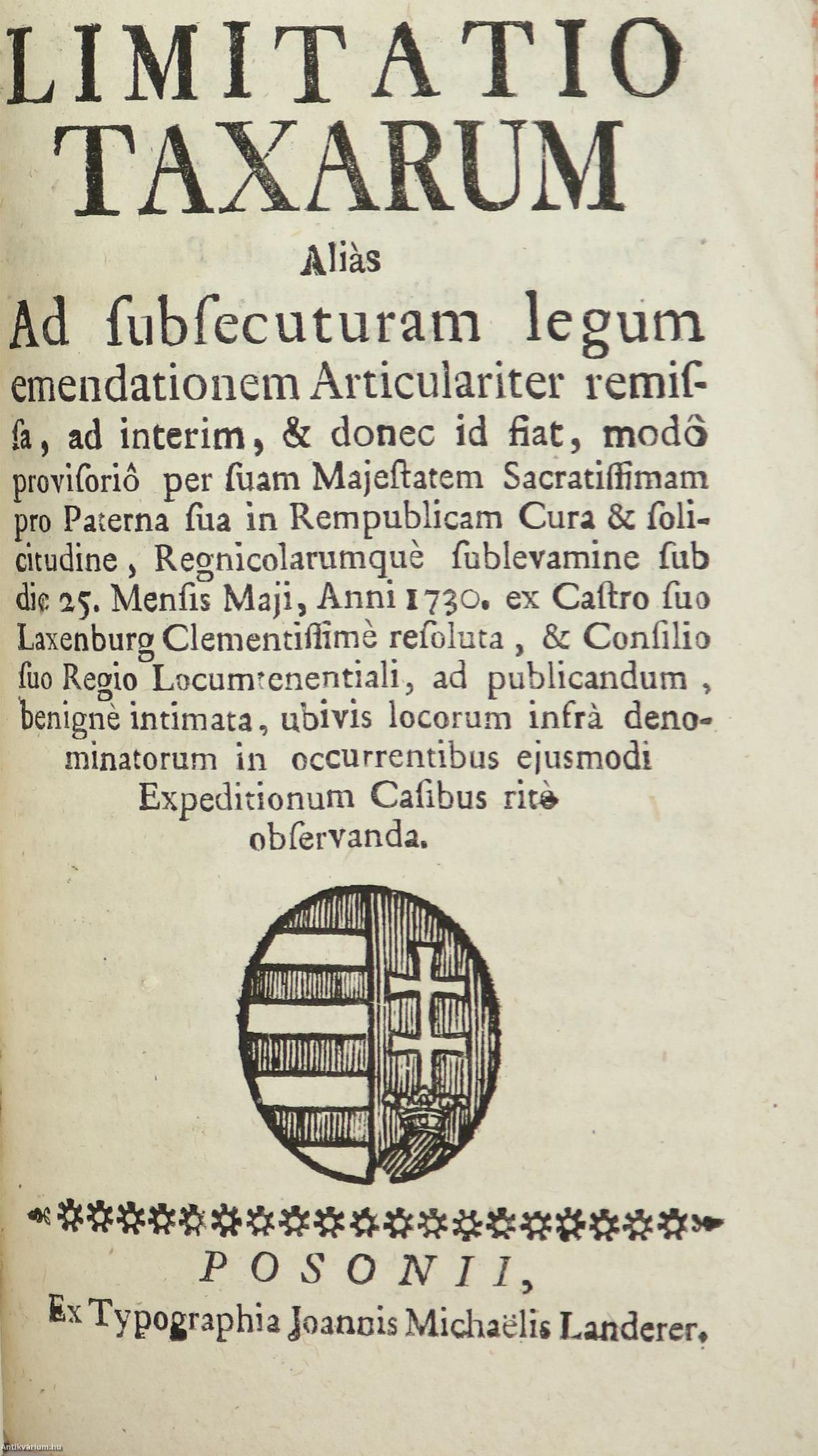 8. Limitatio taxarum. / Adók korlátozása. Posonii, é. n., Ex Typographia Joannis Michaelis Landerer, 10 p.