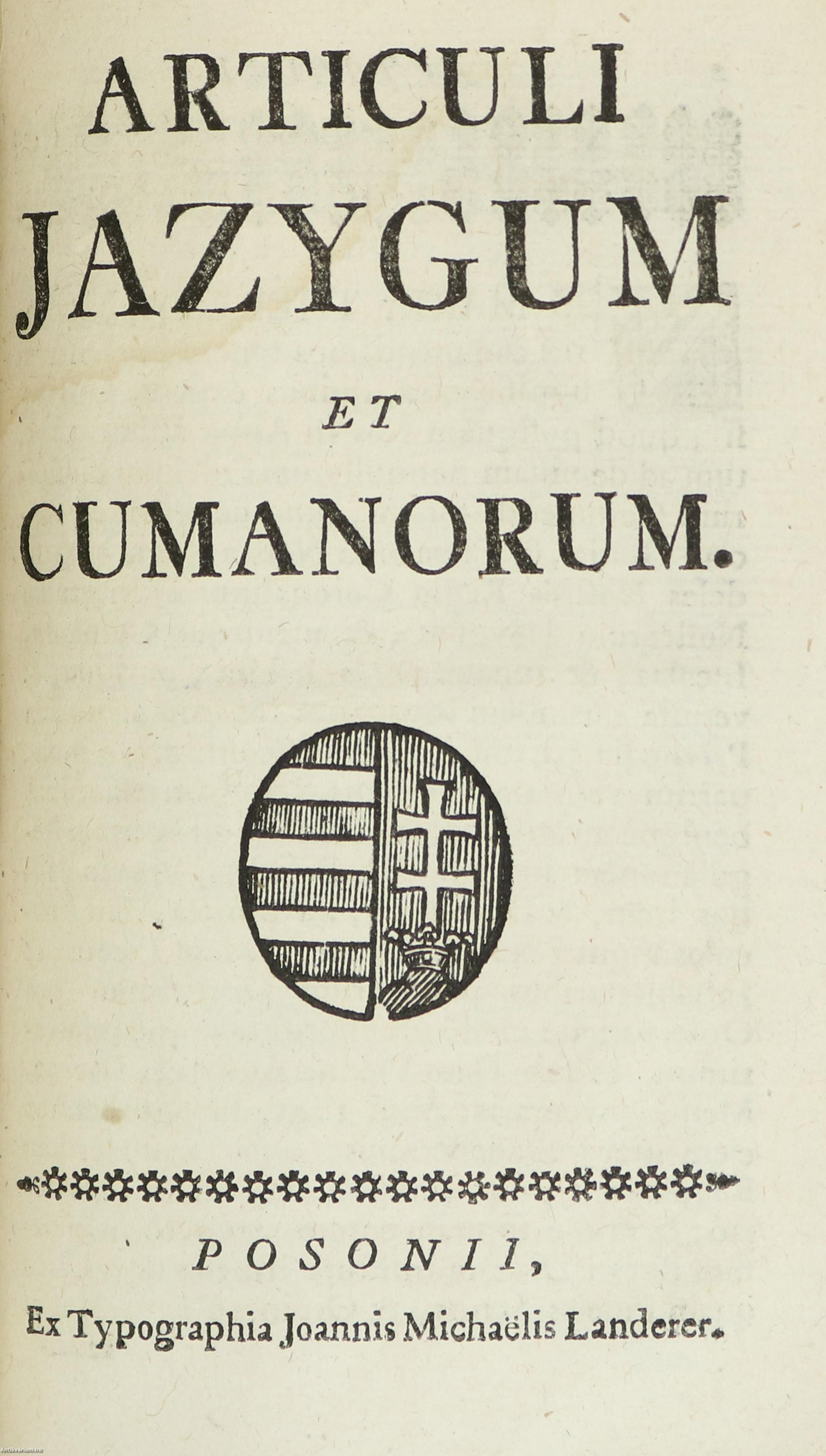 7. Articuli jazygum et cumanorum. / A jászok és kunok törvénycikkei. Posonii, é. n., Ex Typographia Joannis Michaelis Landerer, 16 p.