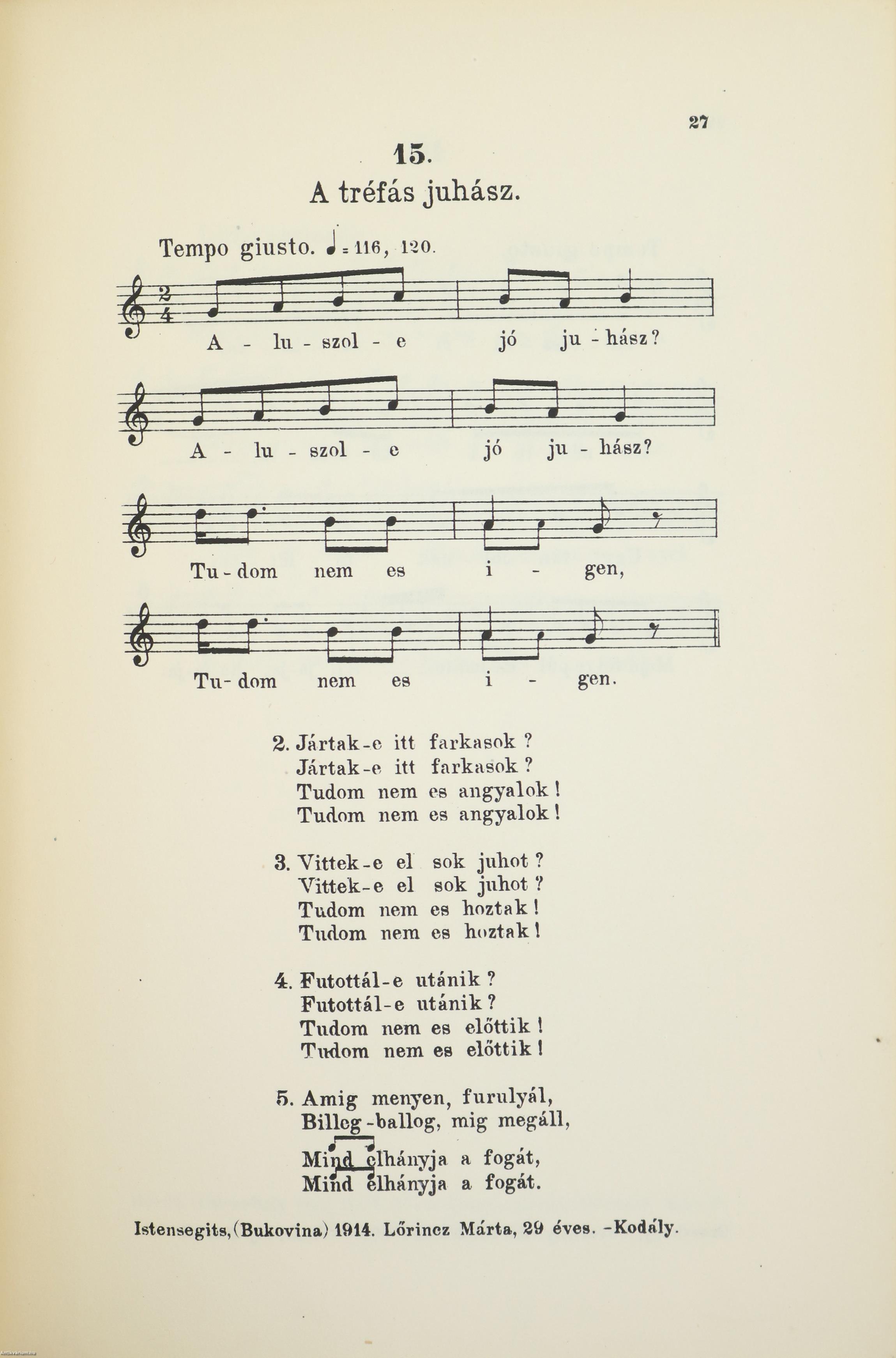A szerzők elöljáró beszédével, a zenei jelek magyarázatával, 150 népdalkottával és szöveggel, számozott lábjegyzetekkel, dallam-mutatóval és betűrendes teljes szövegmutatóval. Címlapon tollal beírt, évszámos tulajdonosi névbeírással.