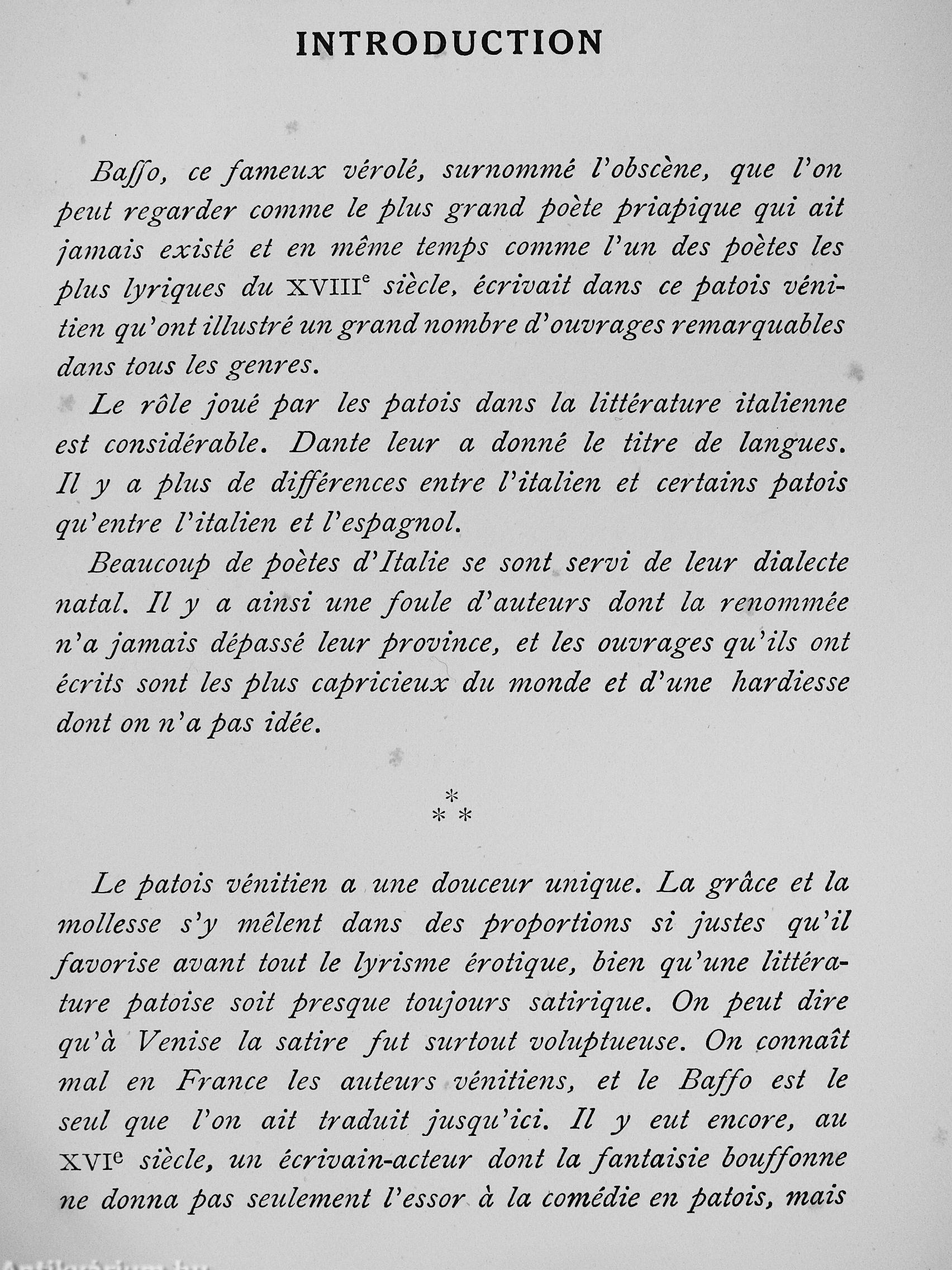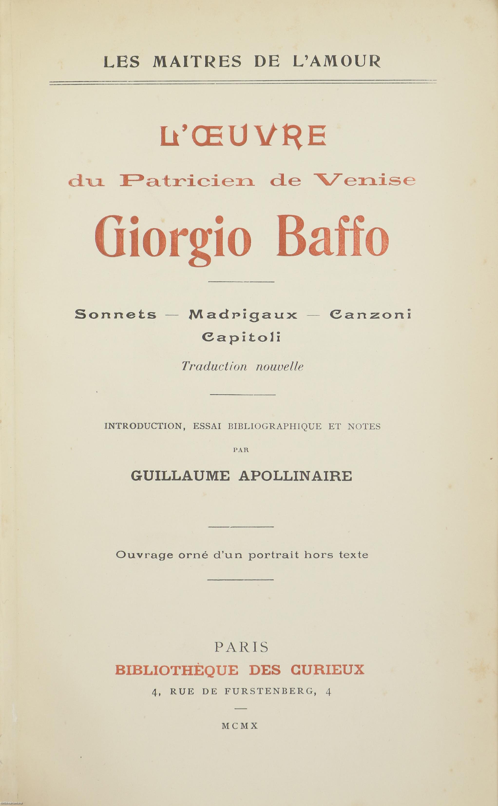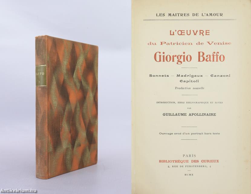 Bibliofil példány. A Les Maitres de L'amour című sorozatban megjelent kötet. L'Oeuvre du Patricien de Venise Giorgio Baffo. Sonnets - Madrigaux - Canzoni - Capitoli. Traduction Nouvelle. [francia nyelvű kiadvány] Introduction, Essai Bibliographique et Notes par Guillaume Apollinaire. Ouvrage orné d'un portait hors texte.