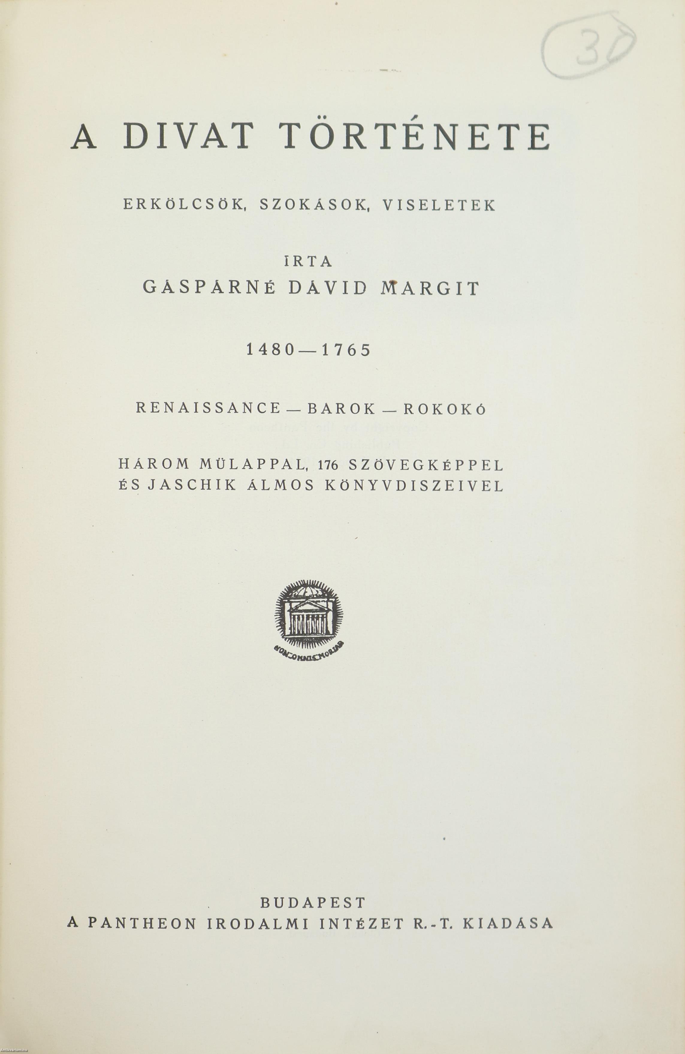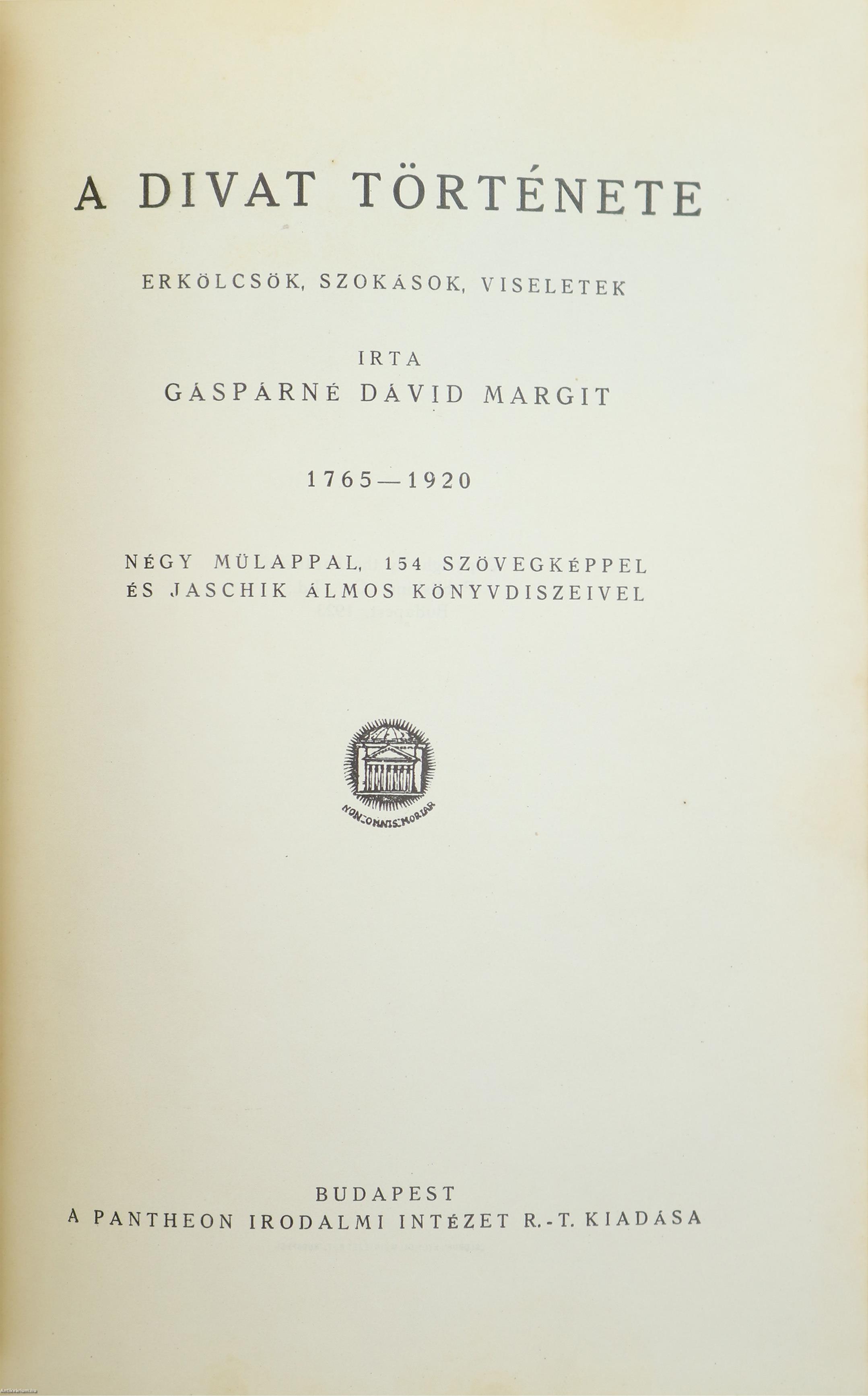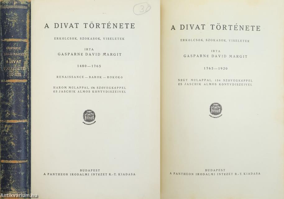 I. kötet: A divat története I. Erkölcsök, szokások, viseletek. 1480-1765. Renaissance-barokk-rokokó. Bp., cop. 1924, Pantheon, 254 p. + [2] p. + [2] t., ill. Három hártyapapírral védett, színes műlappal, 176 szövegképpel és Jaschik Álmos könyvdíszeivel. A kötetből az egyik műlap (Van Dyck) hiányzik.