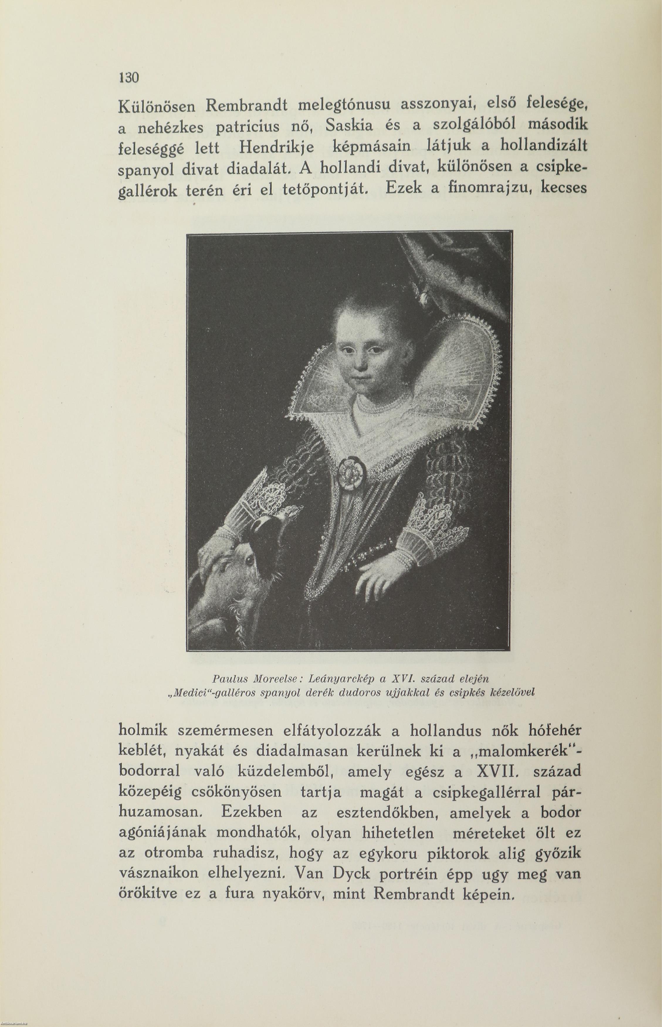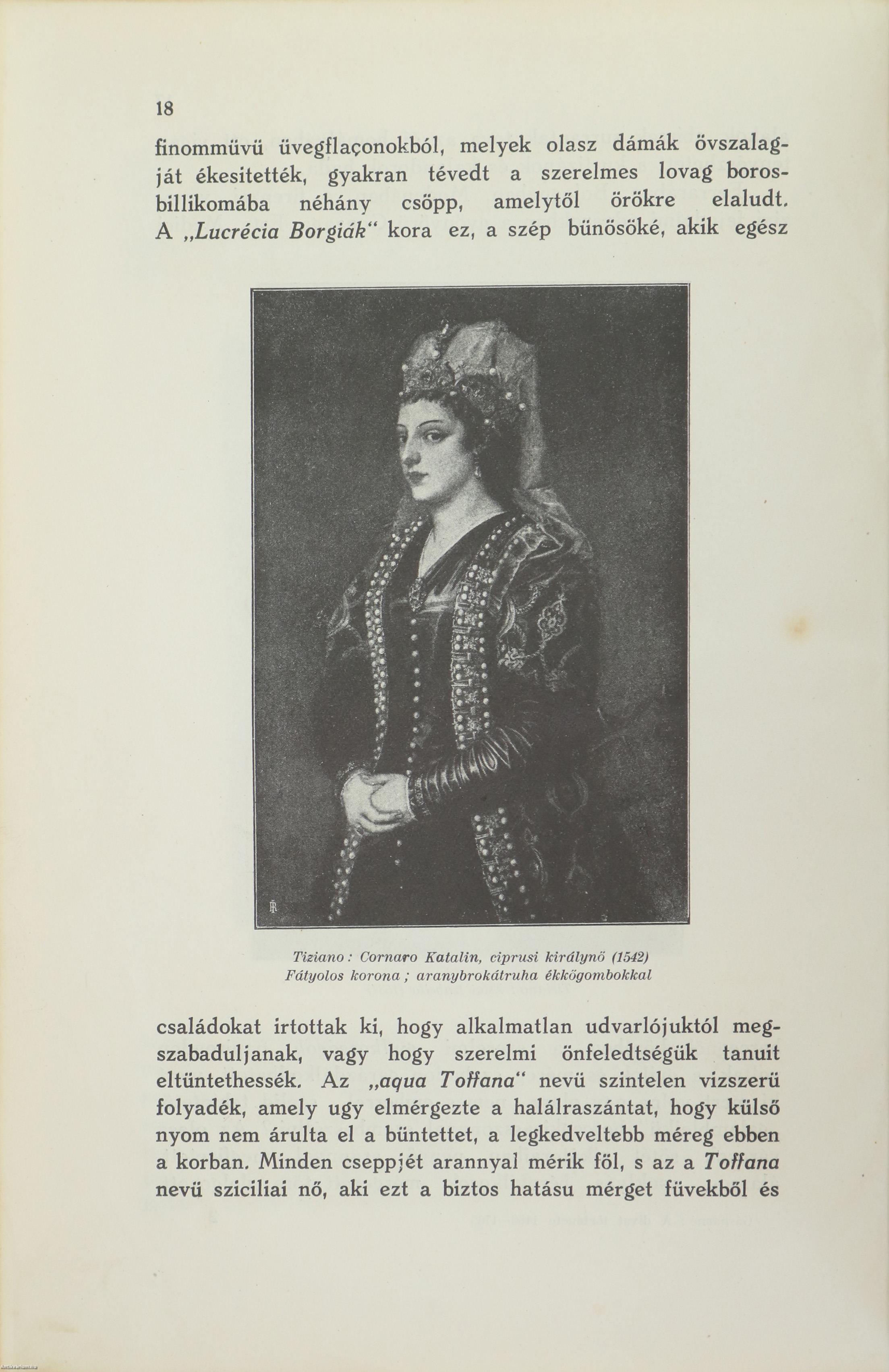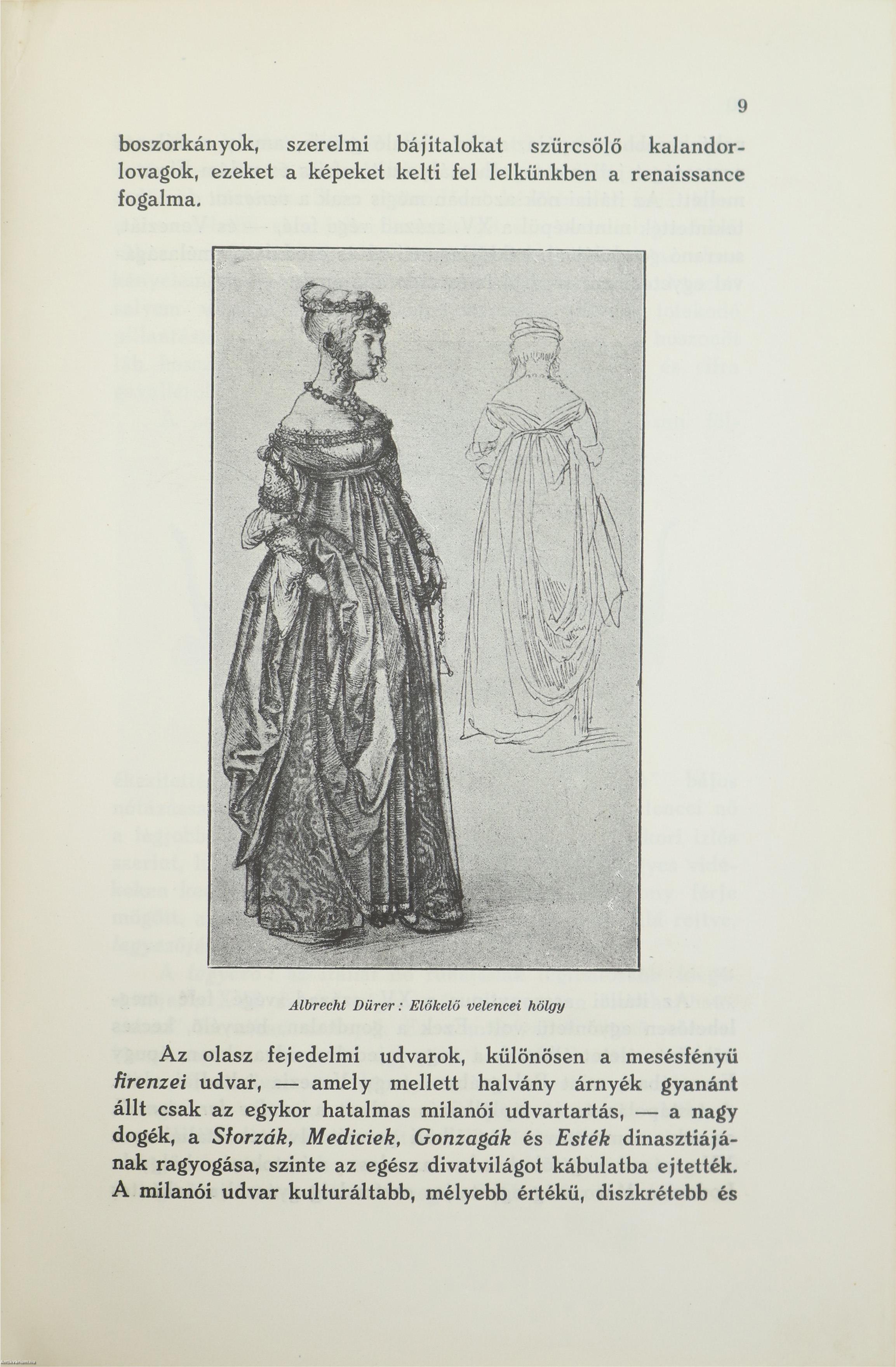 A divat történetének ez a kötete három korszak hű képét kivánja az olvasó elé tárni. Ennek a három korszaknak a kulturája szervesen kapcsolódik egymásba, láncszemeit alkotva annak a ragyogó köteléknek, amely erkölcsök, szokások és viseletek tarka sallangjaival vonzóbbá, szinesebbé varázsolja a mindennapi életet, egyben azonban lenyügözi és béklyóba szoritja az emberiséget, s amelynek neve: Divat. Az első korszak, amely szinben, pompában, melegvérűségben tultengést mutat és az emberi indulatok legvégsőig való fölfokozásában vezető szerepet vállalt minden korokon által: a renaissance. Vissza