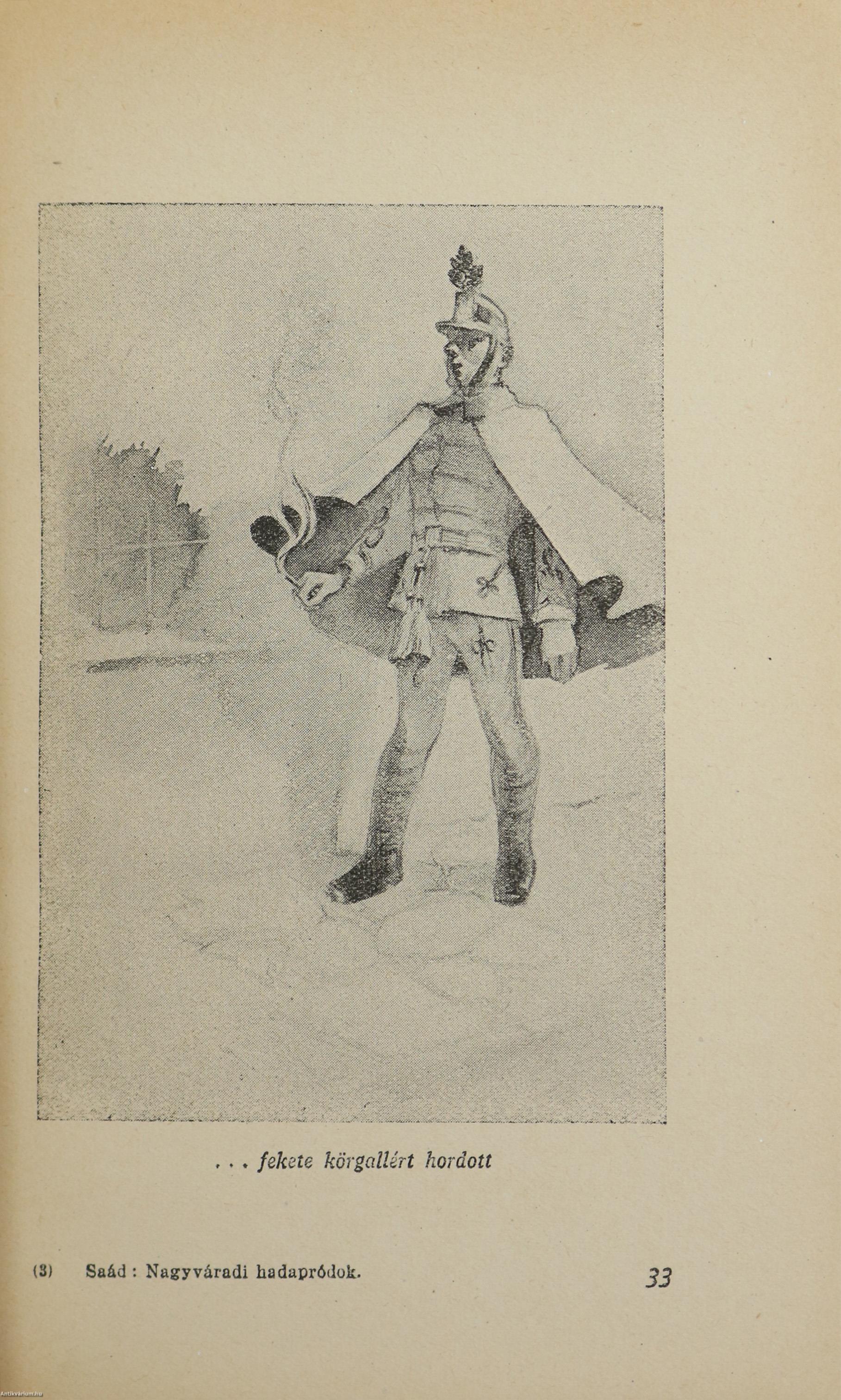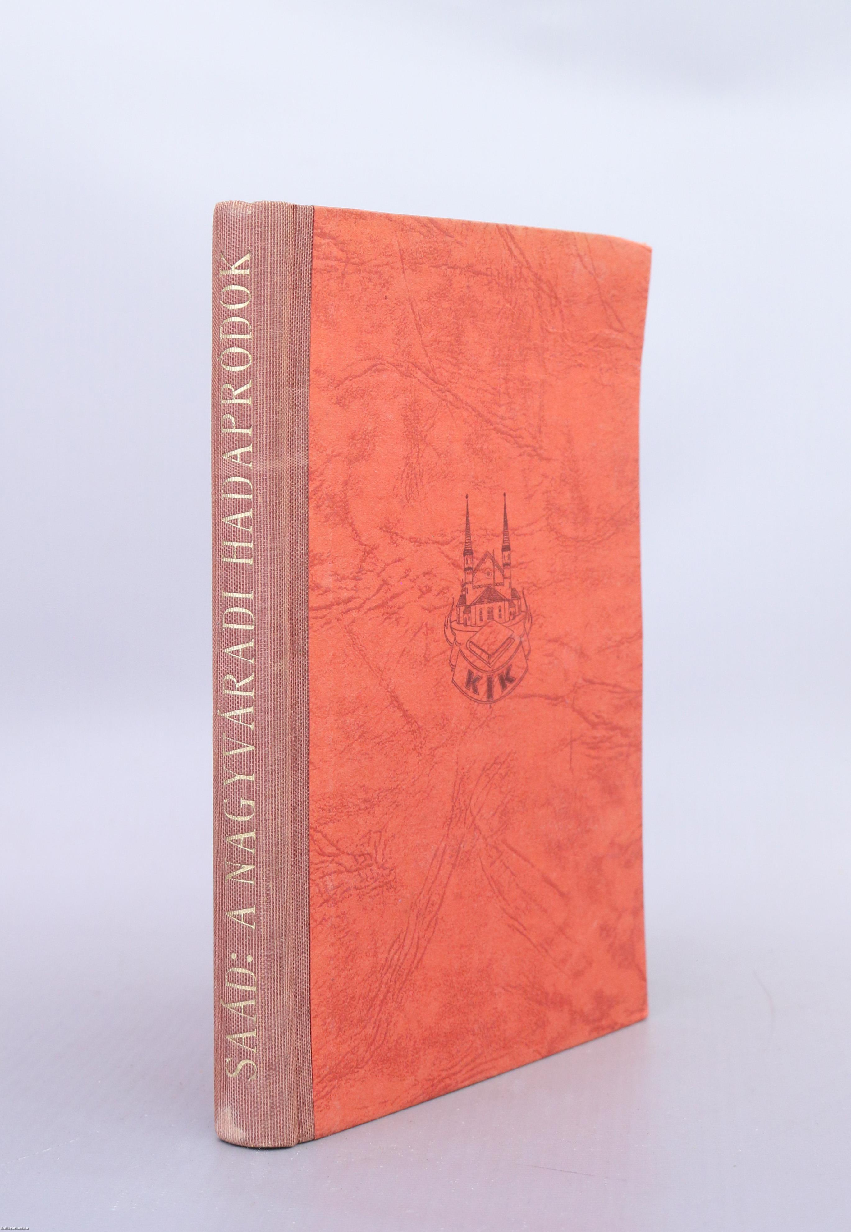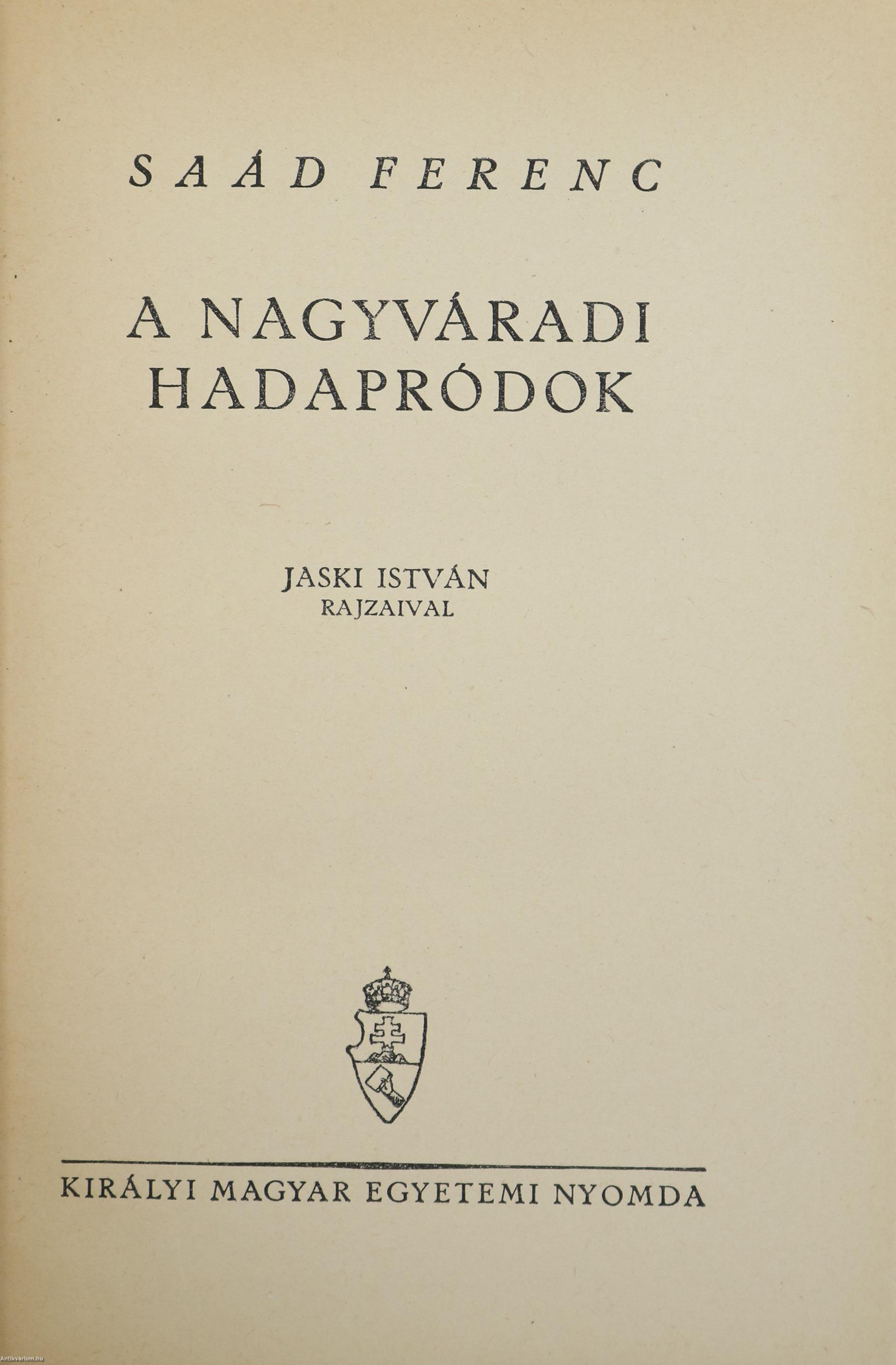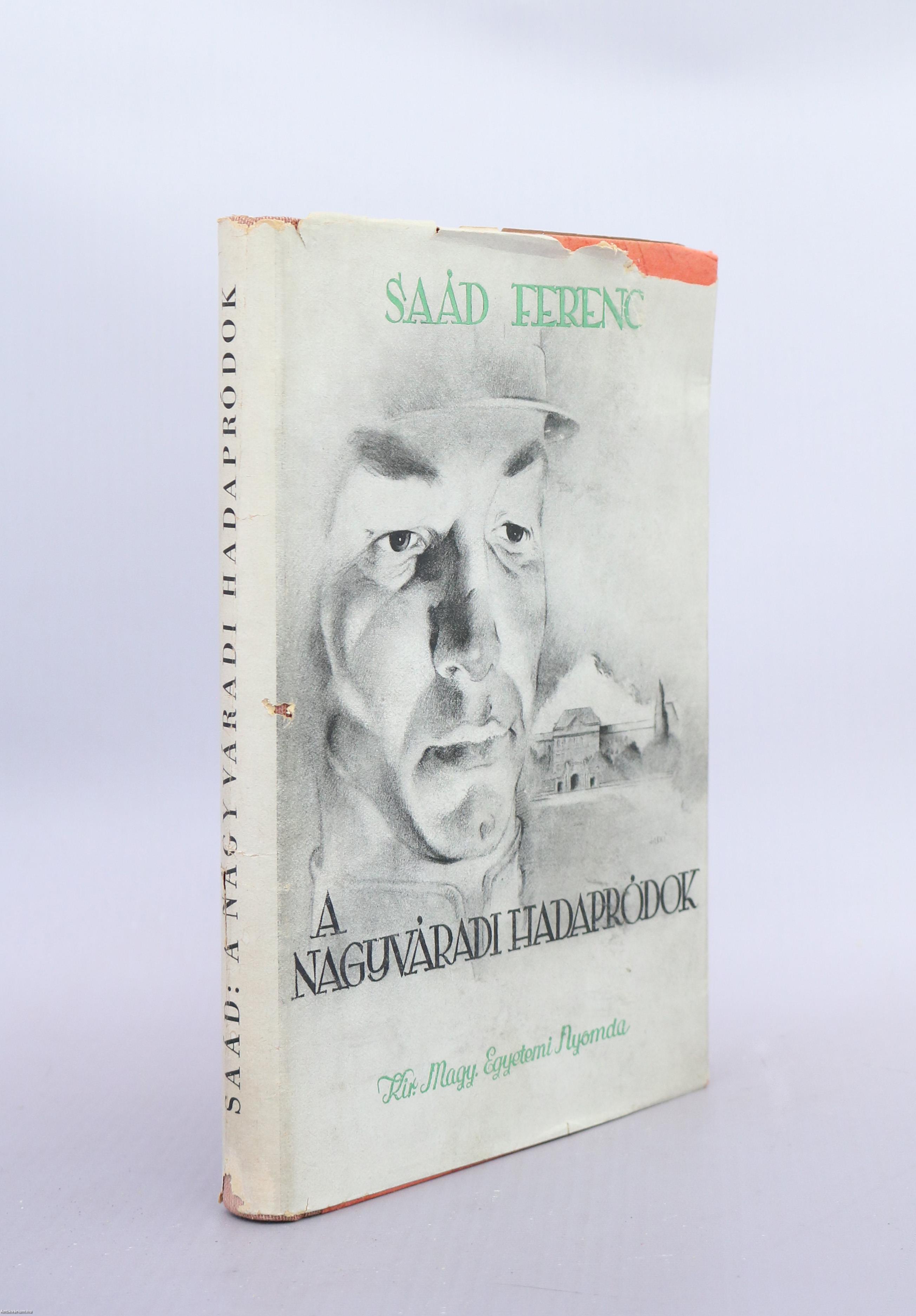 Első kiadás. A nagyváradi hadapródok. Írta: Saád Ferenc. Jaski István szöveg közti, fekete-fehér rajzaival illusztrált kötet. A borító grafikáját "Jaski" készítette. Kiadta és nyomtatta a Királyi Magyar Egyetemi Nyomda Budapesten. Kiadói félvászon kötésben lévő példány illusztrációval ellátott címfedéllel, aranyozott feliratozású könyvgerinccel, feliratozatlan hátlappal, hiánytalan állapotban, feliratozott, illusztrált, fülszöveges, sérült, kiadói borítófedélben. A kötet szerzője, Dr. Saád Ferenc (Nagyszalonta, 1902. március 11. – ?) a honvéd hadapródiskola 3. évfolyamát elvégezve (1921) alhadnaggyá, majd 1926-ban főhadnaggyá nevezték ki. A 7. Honvéd Gyalogezrednél szolgált. 1927-ben áthelyezték a Bocskai Reáliskola, majd később a pécsi Zrínyi Miklós Reáliskola és Nevelőintézet tanárának. Közben a Budapesti Tudományegyetem hallgatója, ahol nyelvtanári diplomát, majd 1936-ban bölcsészettudományi doktorátust szerez. 1935-től százados. 1941. augusztus 1-jével áthelyezik a repülő hadapródiskola állományába. 1942. június 1-jén a Budapesti Műszaki Hadapródiskola állományába osztják be. 1942. március 31-től őrnagy, 1943. augusztus 1-jétől alezredes. Több könyvet írt (Katonai nevelés, Honvédelmi nevelés, A Nagyváradi Hadapródiskola).