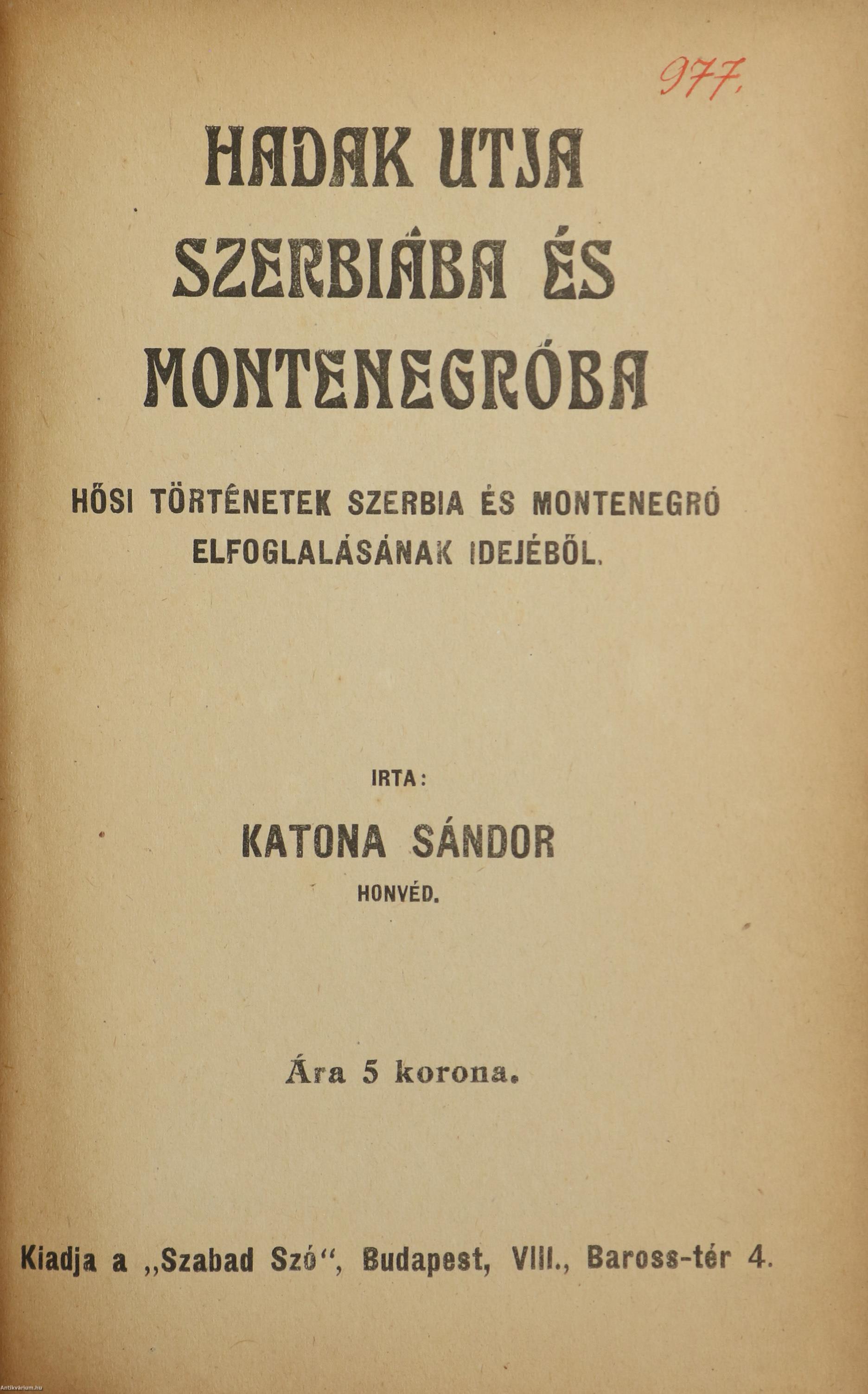 Első kiadás. Hadak utja Szerbiába és Montenegróba. Hősi történetek Szerbia és Montenegró elfoglalásának idejéből. Írta: Katona Sándor honvéd.