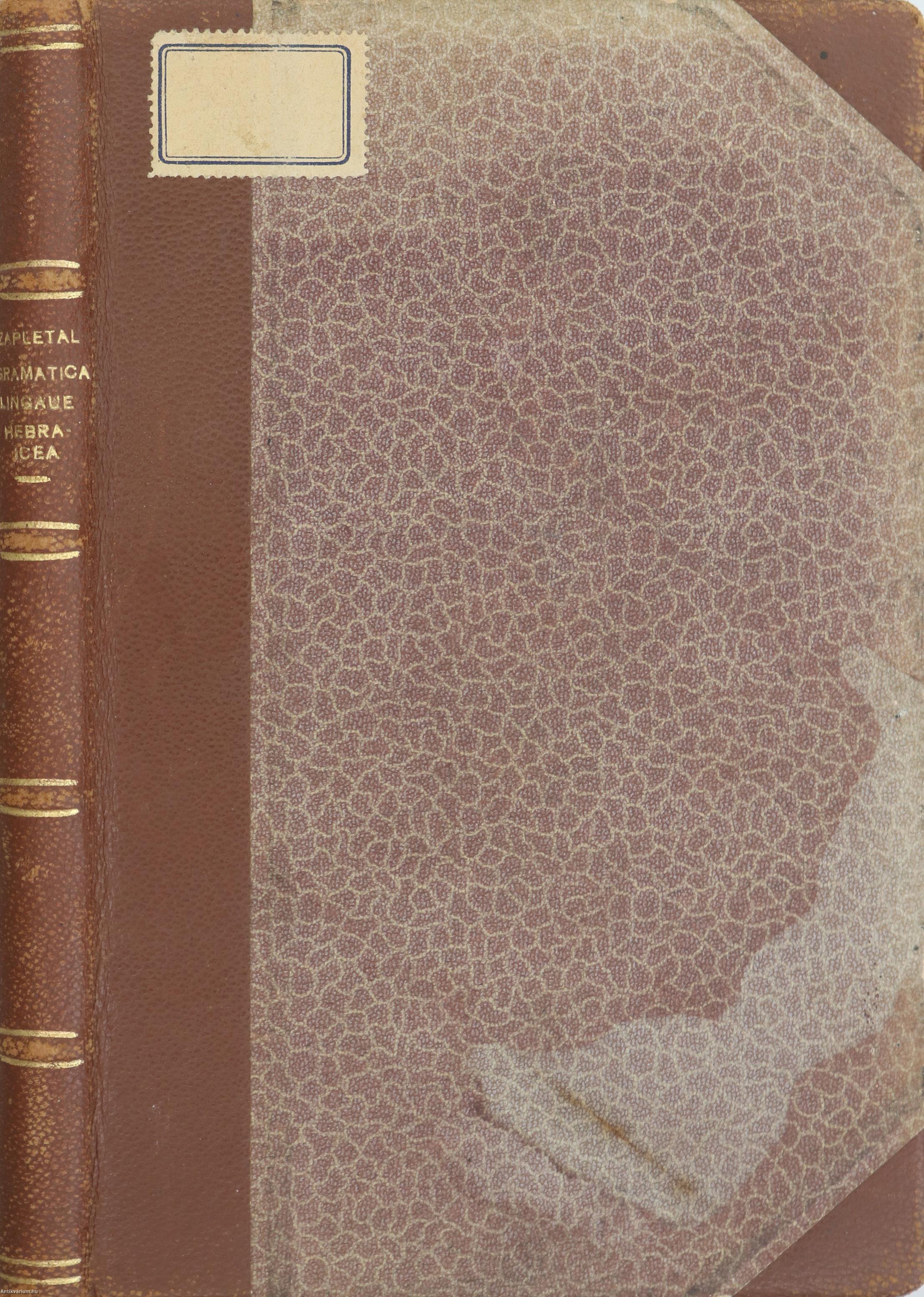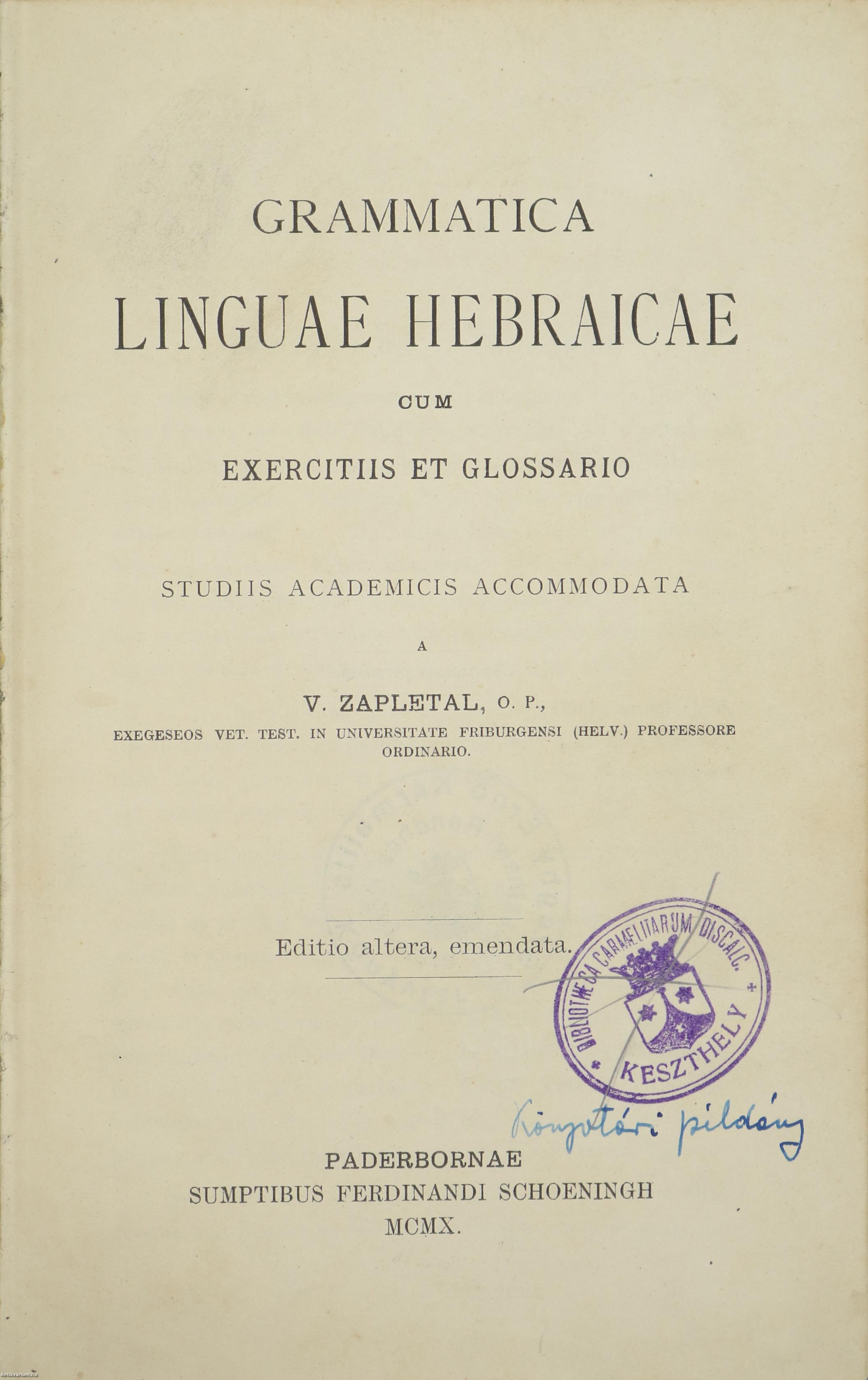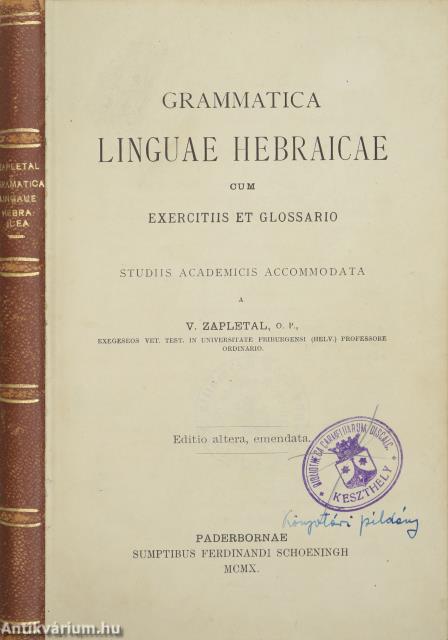 Grammatica Linguae Hebraicae cum exercitiis et glossario Studiis academicis accommodata a V. Zapletal, O. P., exegeseos vet. test. in Universitate Friburgensi (Helv.) professore ordinario. Editio altera, emendata. [latin nyelvű héber nyelvkönyv] / A héber nyelv nyelvtana gyakorlatokkal és szószedettel, az egyetemi tanulmányokhoz alkalmazva, V. Zapletal, O.P. tollából, az Ószövetség magyarázatának rendes tanára a (svájci) Friburgi Egyetemen. Második, javított kiadás. Címlapon korábbi tulajdonosi bélyegzéssel, tollal beírt megjegyzéssel, hátlapon korábbi tulajdonosi bélyegzéssel.