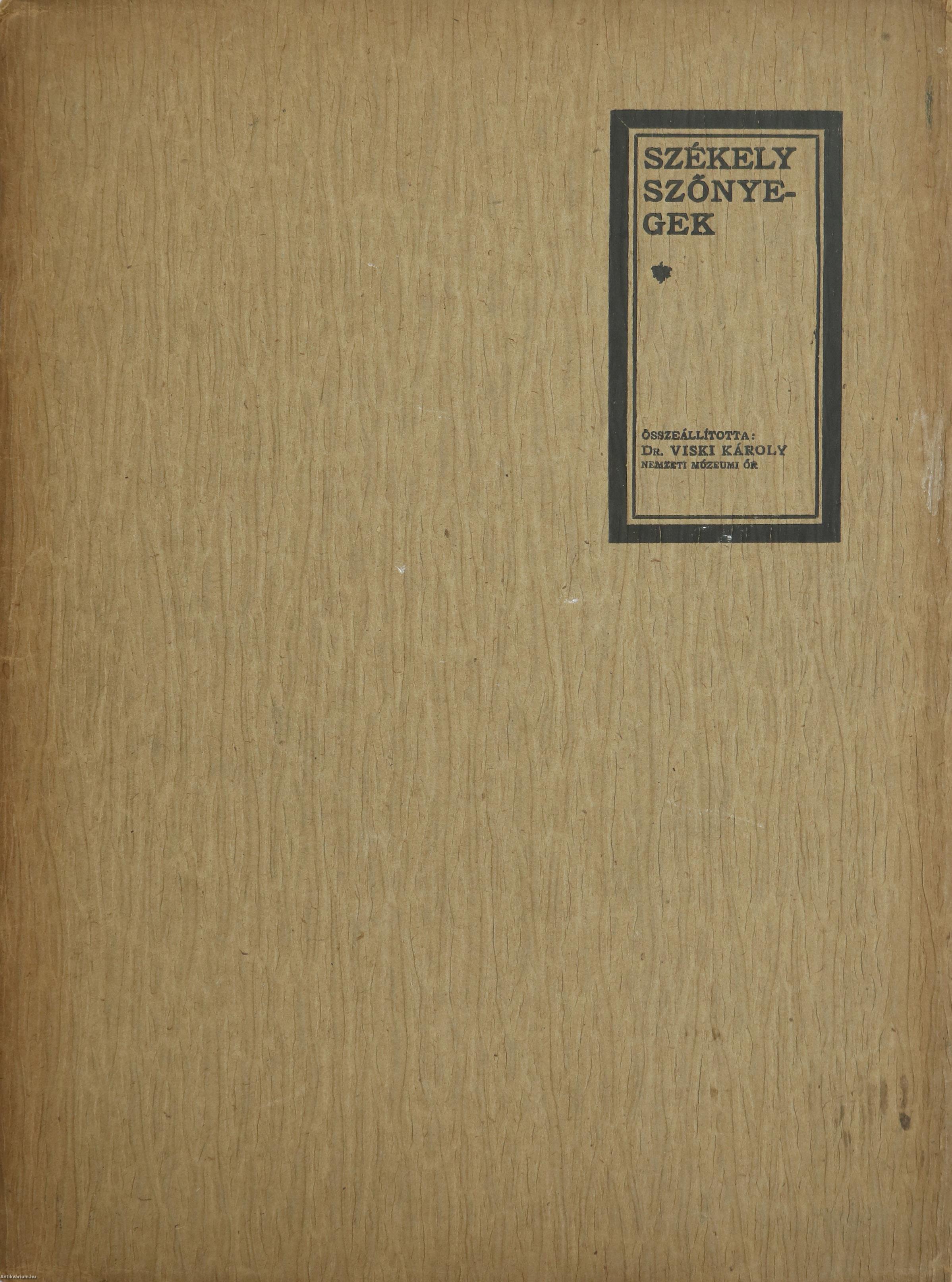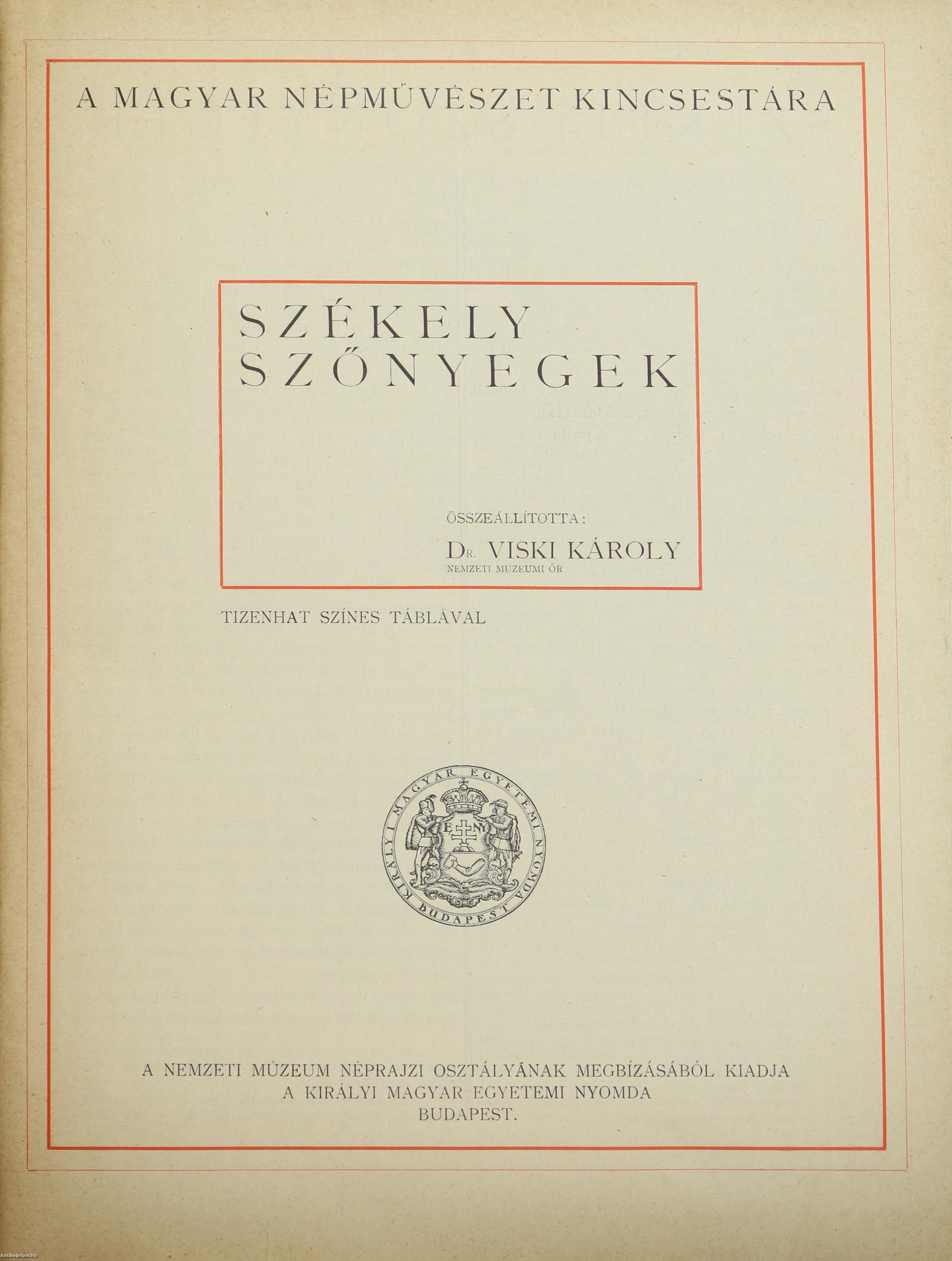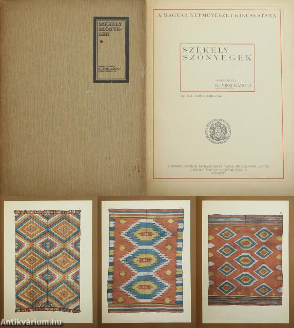 Első kiadás. A Magyar Népművészet Kincsestára című sorozatban (számjelzés nélkül) megjelent mű. Székely szőnyegek. Összeállította: Dr. Viski Károly, a Nemzeti Múzeum őre.