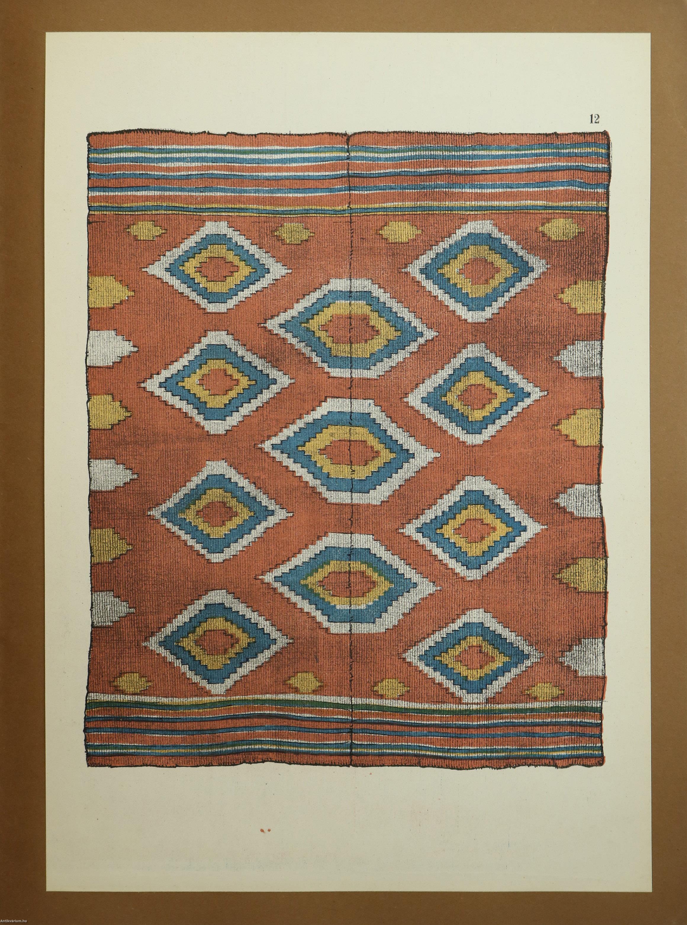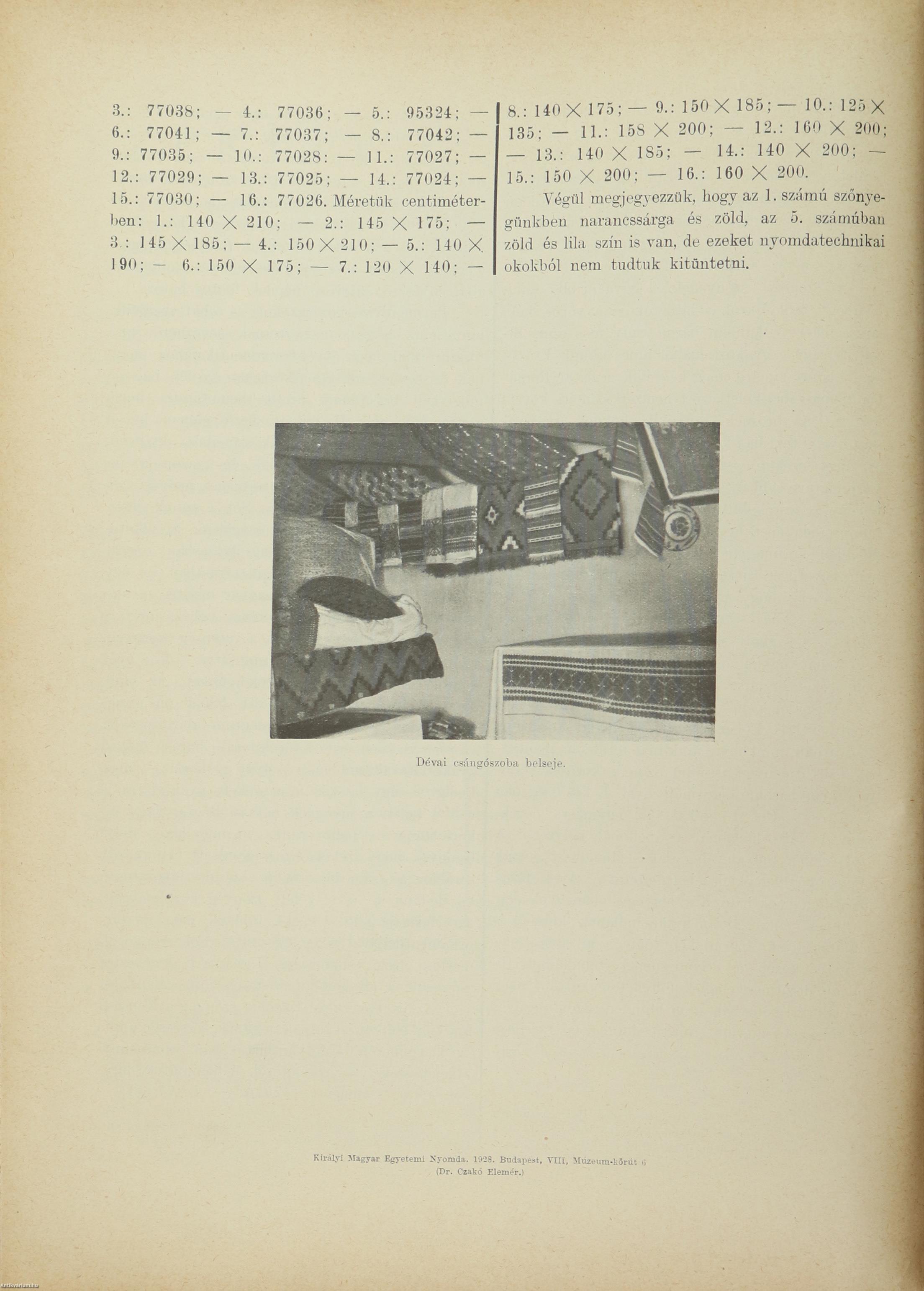 Kéthasábos bevezetővel, számozott lábjegyzetekkel, a Nemzeti Múzeum Néprajzi Tárában található szőnyegek leltári számának adataival, egy vonatkozó, fekete-fehér, feliratos fotóval ("Dévai csángó szoba belseje"), tizenhat, színes, beragasztott, felirat nélküli, színes képtáblával. A kiadványt a Királyi Magyar Egyetemi Nyomda nyomtatta Budapesten.
