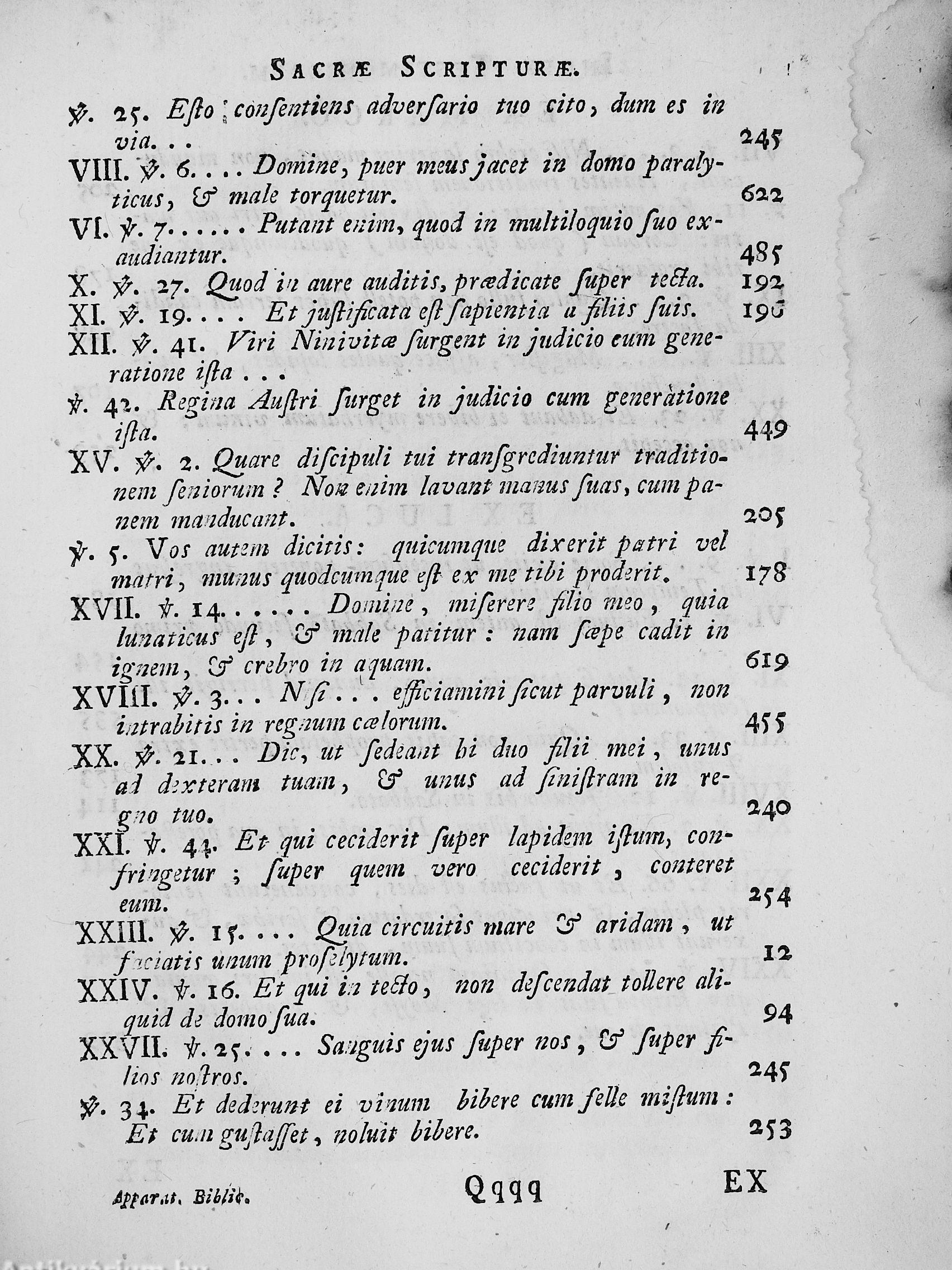 Apparatus Biblicus, sive manuductio ad Sacram Scripturam, tum clarius, tum facilius intelligendam [1 metszet hiányzik]. Auctore R. P. Bernardo Lamy, Congregationis Oratorii Presbytero. Cum figuris aeneis. / Bibliai kézikönyv a Szentíráshoz, hogy azt világosabban, illetve könnyebben lehessen megérteni. Szerzője Bernardo Lamy, Tiszteletreméltó Atya az Oratórium Társasága papja. Rézkarcokkal együtt.